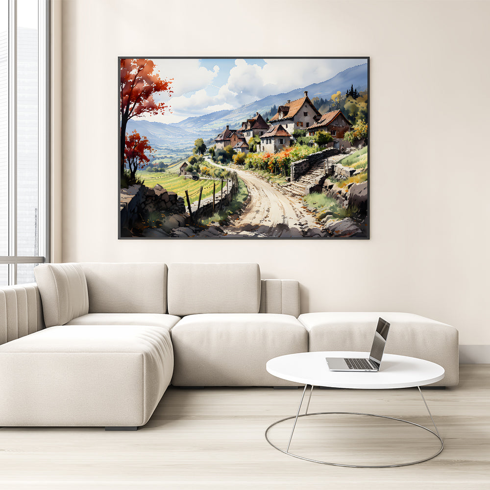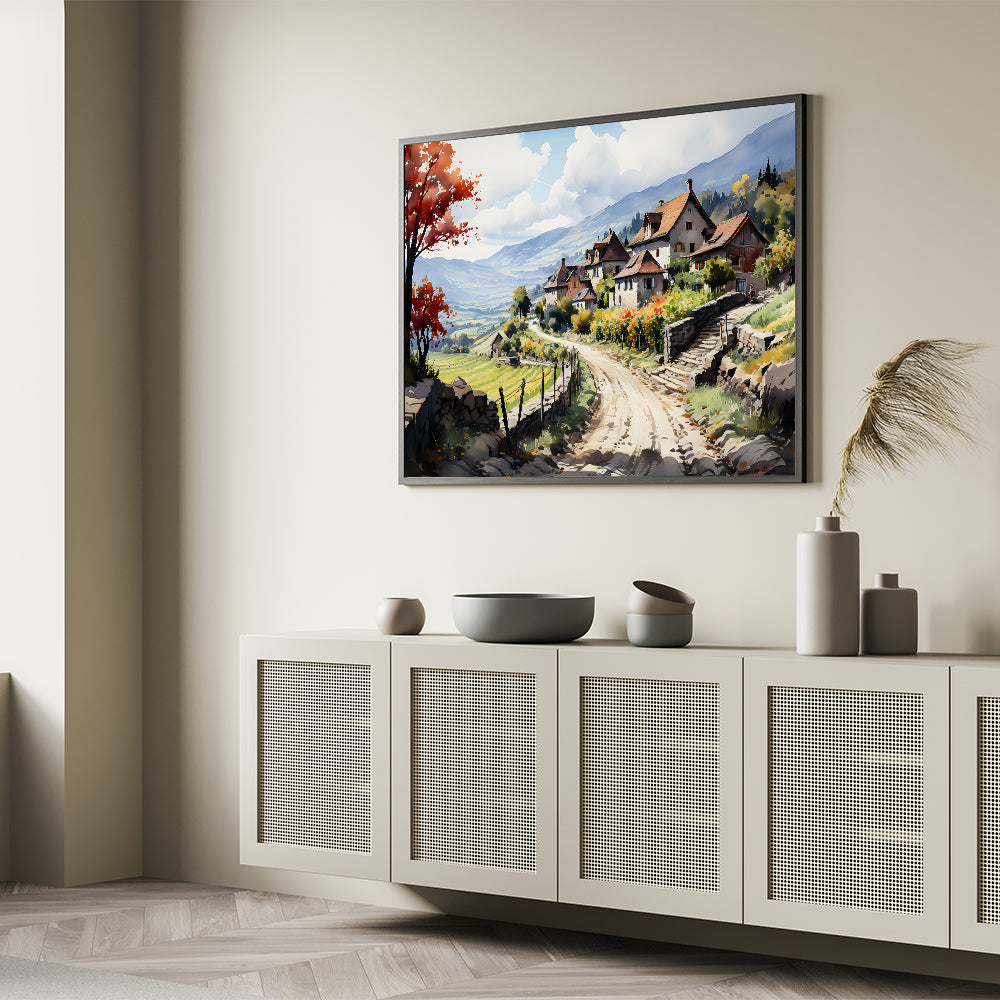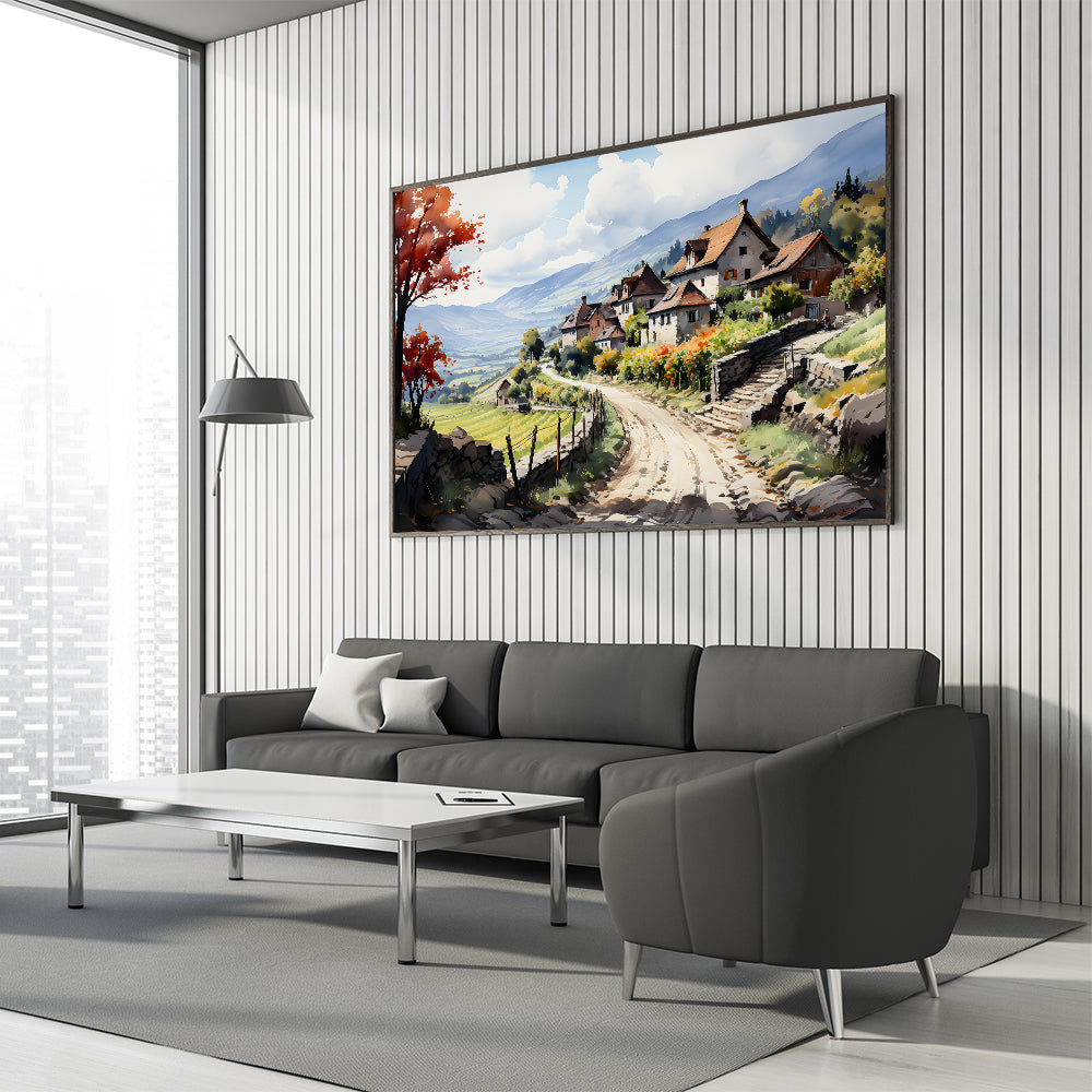 Enhance your living space with the timeless beauty of rural life through this captivating piece of house wall art. This artwork depicts a charming countryside village nestled in a lush, rolling landscape, with winding paths and quaint houses set against a backdrop of majestic mountains. The vibrant colors and intricate details make this a perfect example of architectural house art that brings the serenity and charm of the countryside into your home.