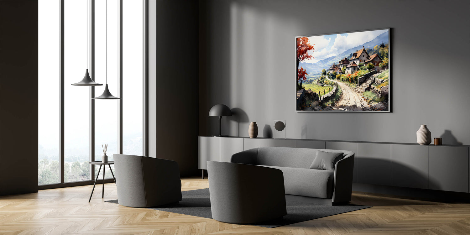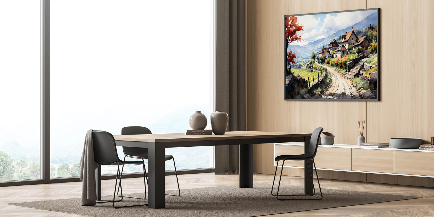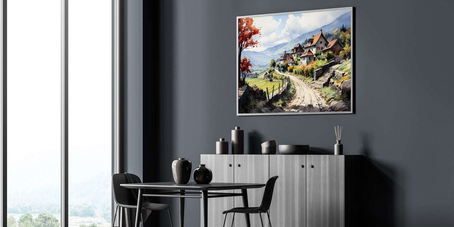Enhance your living space with the timeless beauty of rural life through this captivating piece of house wall art. This artwork depicts a charming countryside village nestled in a lush, rolling landscape, with winding paths and quaint houses set against a backdrop of majestic mountains. The vibrant colors and intricate details make this a perfect example of architectural house art that brings the serenity and charm of the countryside into your home.