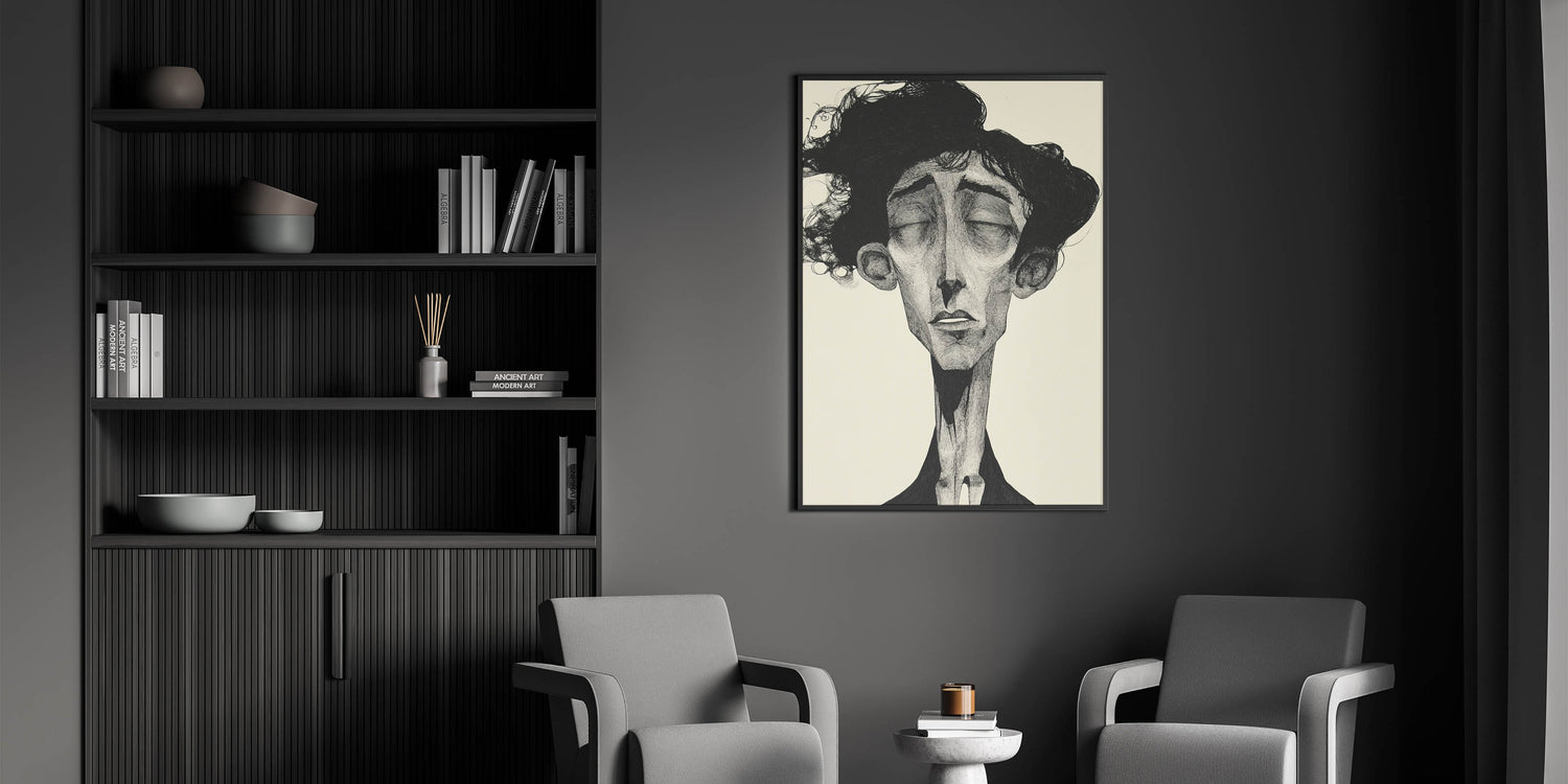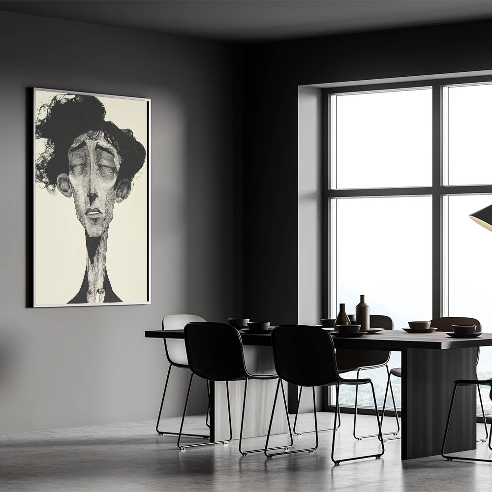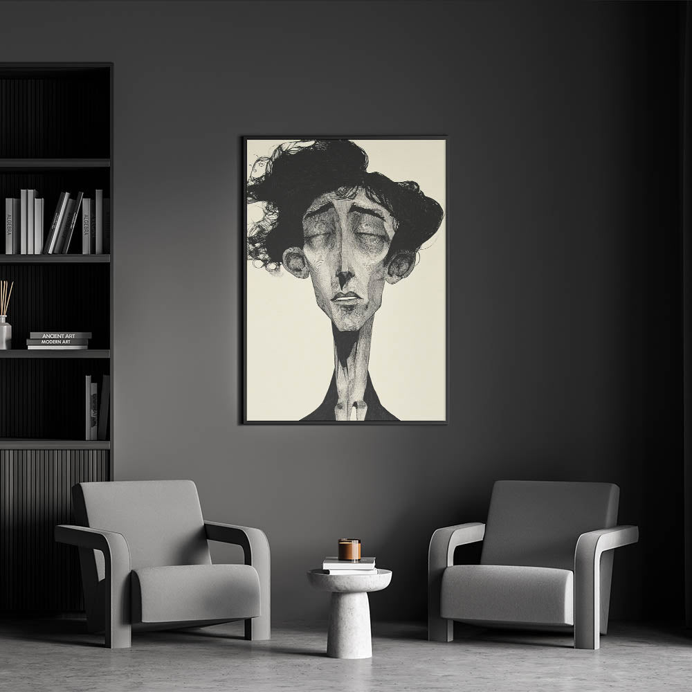 Immerse yourself in the raw emotion of this Abstract Figurative Art Collection piece, featuring a striking monochrome portrait with intricate detailing. This modern figure-inspired wall art captures deep emotion through elongated features and expressive shading, making it a captivating centerpiece for contemporary interiors. The black-and-white contrast enhances the dramatic effect, adding sophistication and artistic depth to any space.