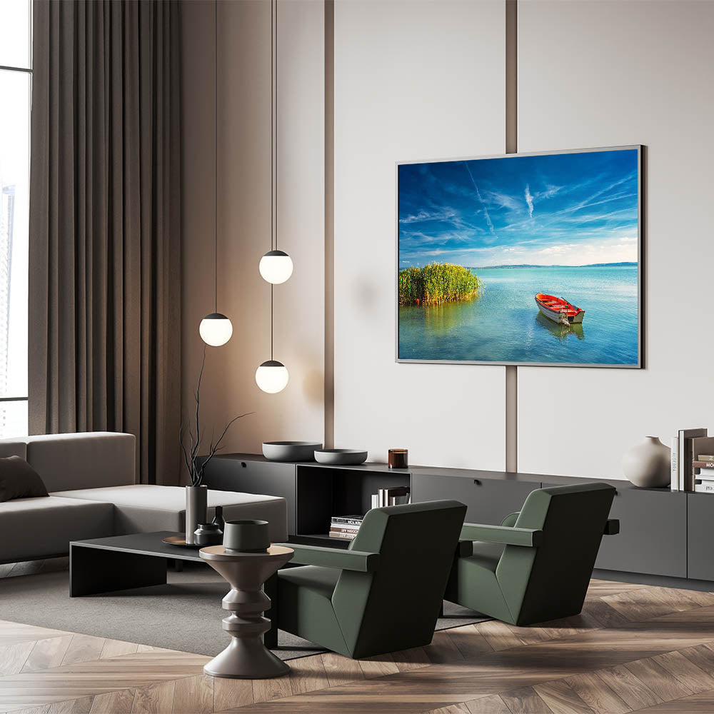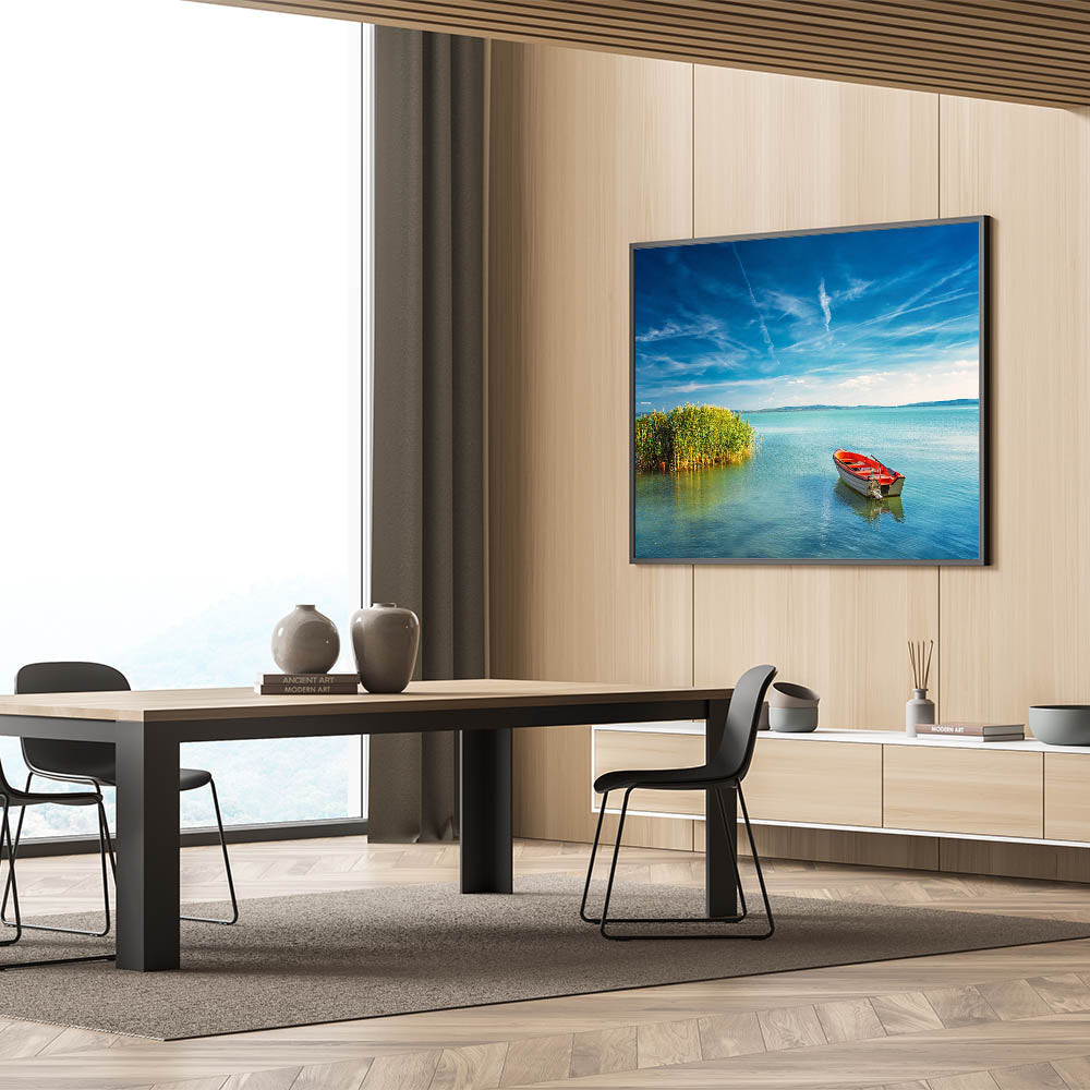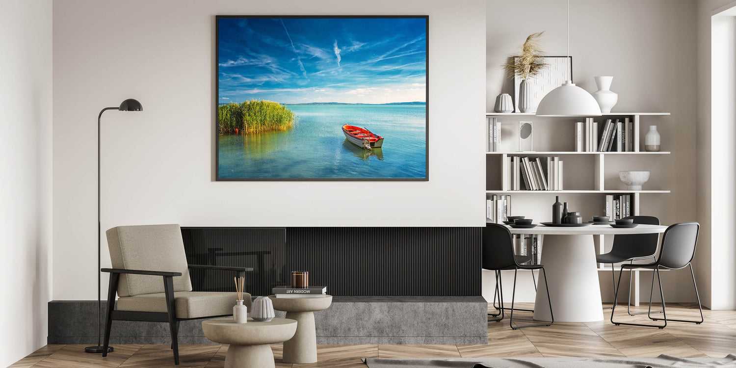 Capture the tranquility of Hungary’s Lake Balaton with this serene boat scene, perfect for enhancing any space with peaceful energy. This Budapest canvas print showcases the calm waters and clear blue skies of Hungary’s largest lake, providing a picturesque view that brings a sense of calm and serenity to your home. The vibrant red boat and the lush greenery create a striking contrast, making this artwork stand out as a beautiful centerpiece.