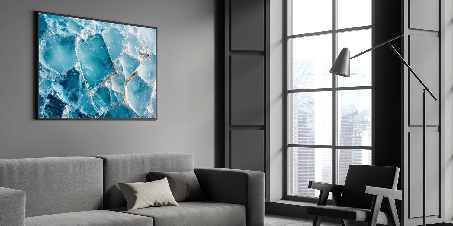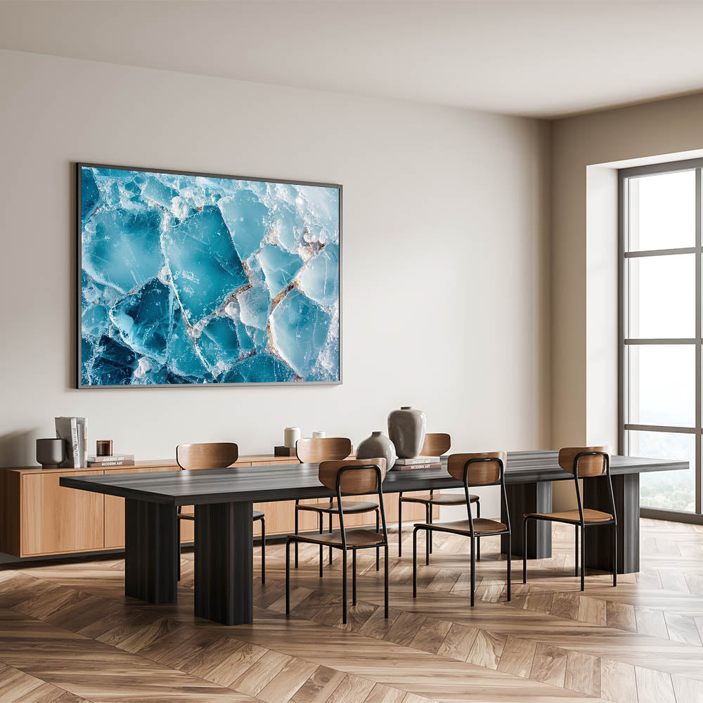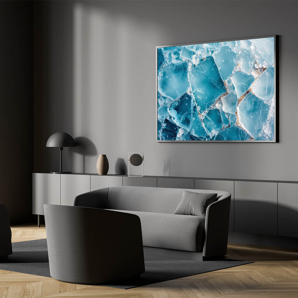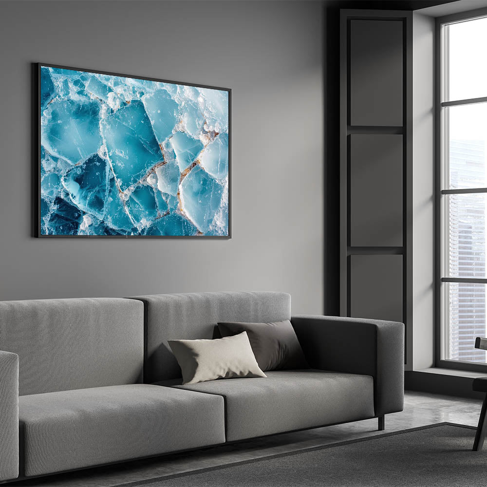 This mesmerizing artwork captures the intricate beauty of cracked ice formations, frozen in shades of vibrant blue and soft white. The sharp, geometric shapes of the ice create a stunning abstract visual that evokes the cold yet captivating allure of winter landscapes. Each fragment of ice reflects light, giving the image depth and texture, making it a perfect piece for anyone who appreciates nature’s frozen wonders. Whether you’re decorating a living space or office, this artwork brings a calming, wintry atmosphere to any room.
