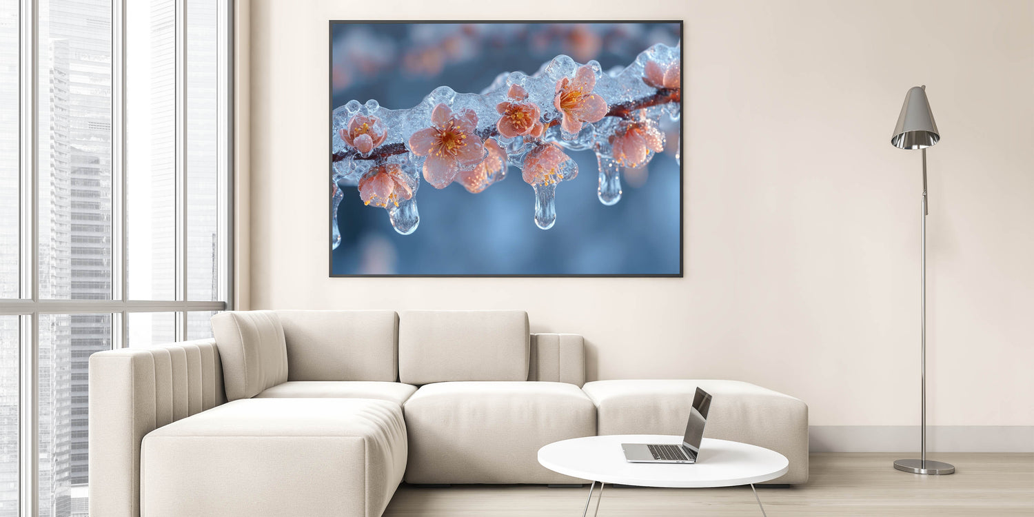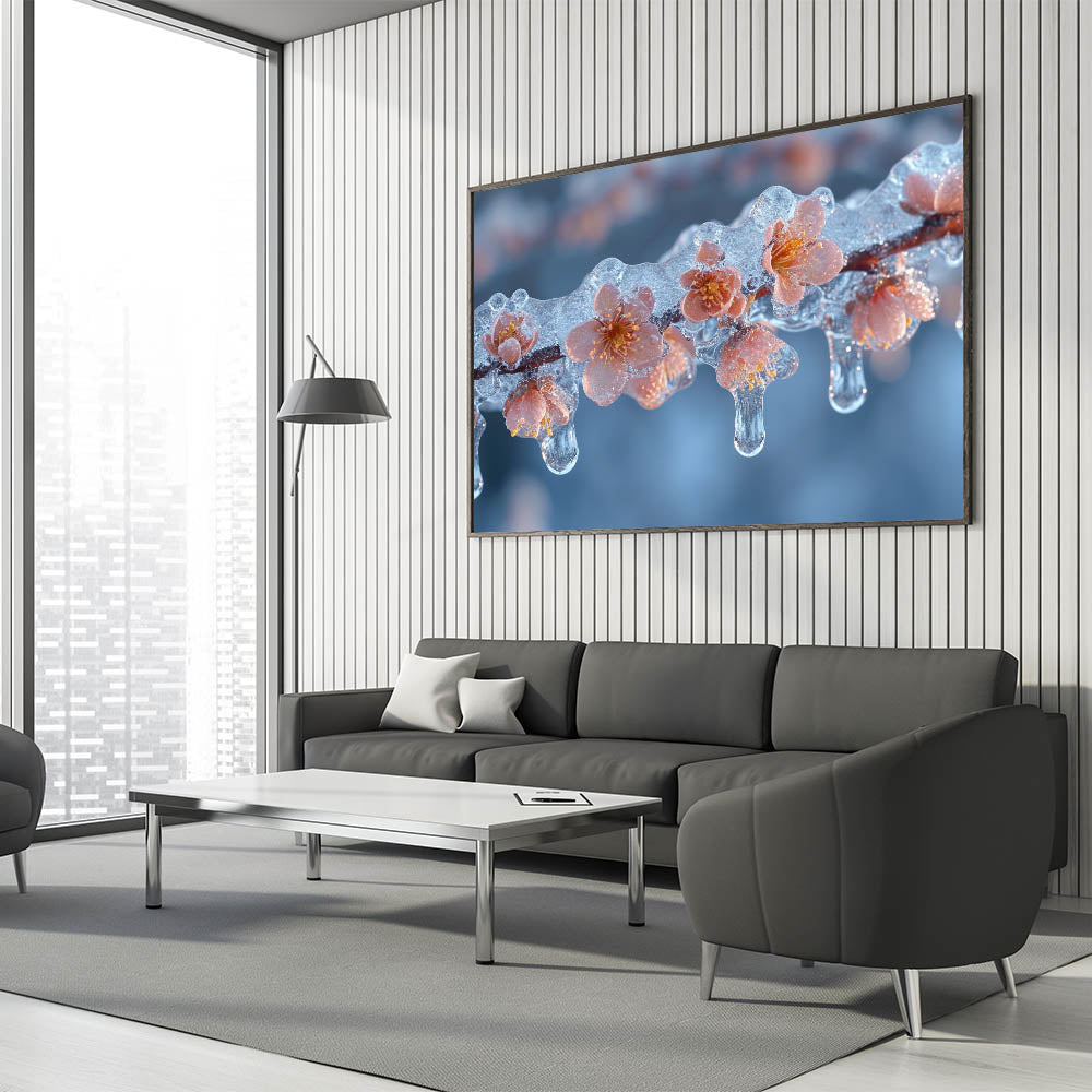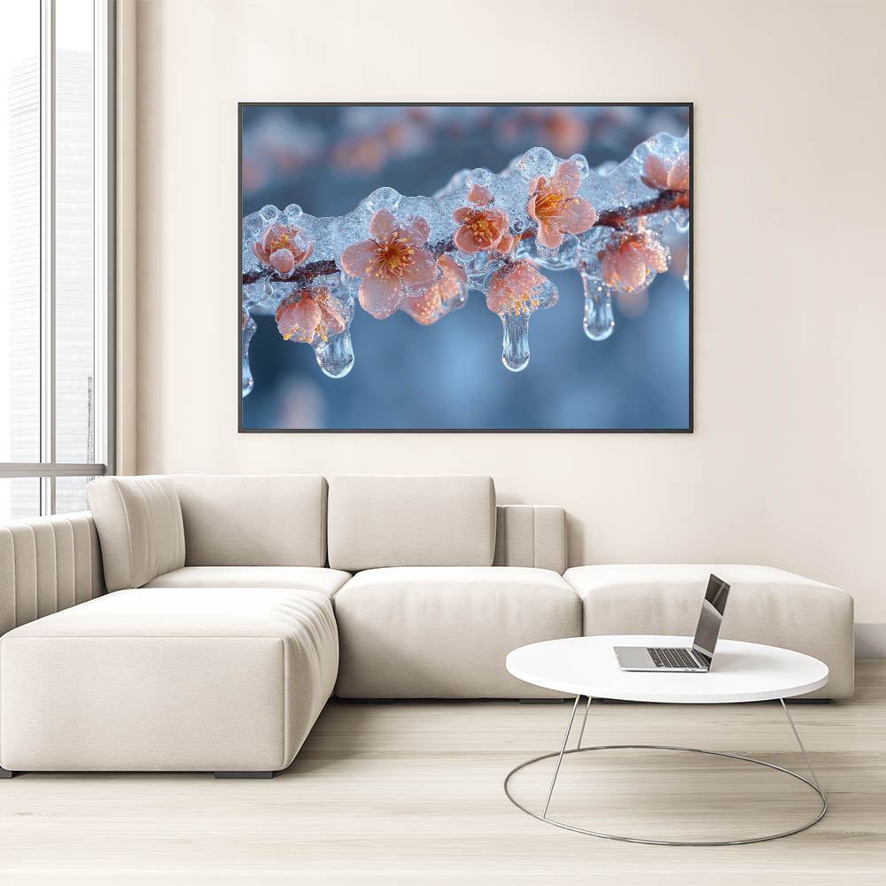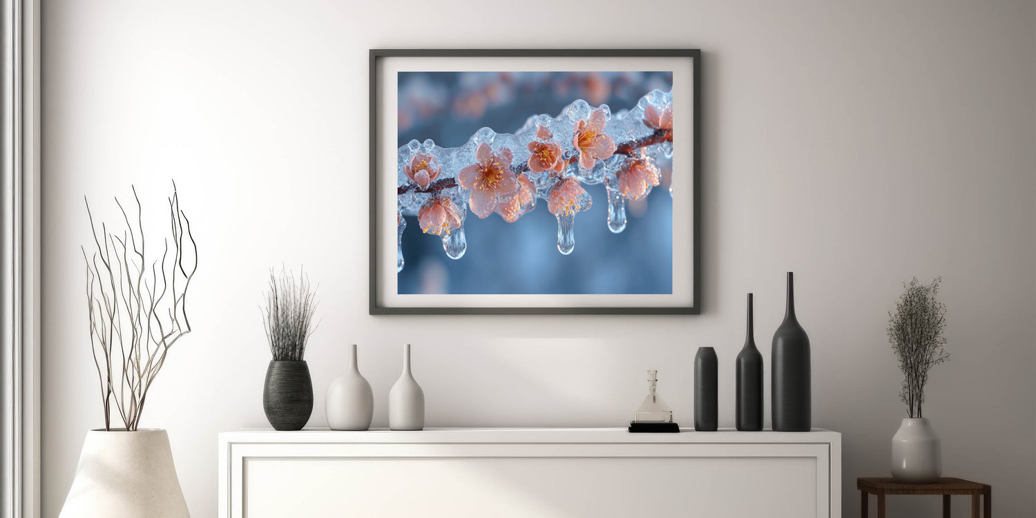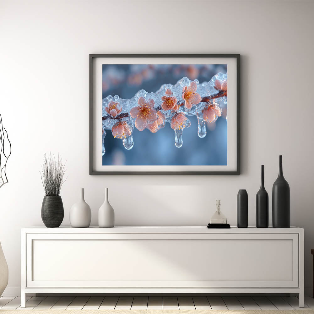 This breathtaking photograph captures the delicate beauty of blossoms encased in ice, showcasing nature's artistry in the face of winter’s freeze. The soft pink petals are frozen in time, their intricate details visible beneath the glossy, transparent layer of frost. The contrast between the warm, blooming flowers and the icy cold creates a striking visual that brings a sense of calm and wonder. Ideal for adding a unique winter-themed accent to your home or office, this artwork reminds us of nature's resilience and beauty in the harshest conditions.