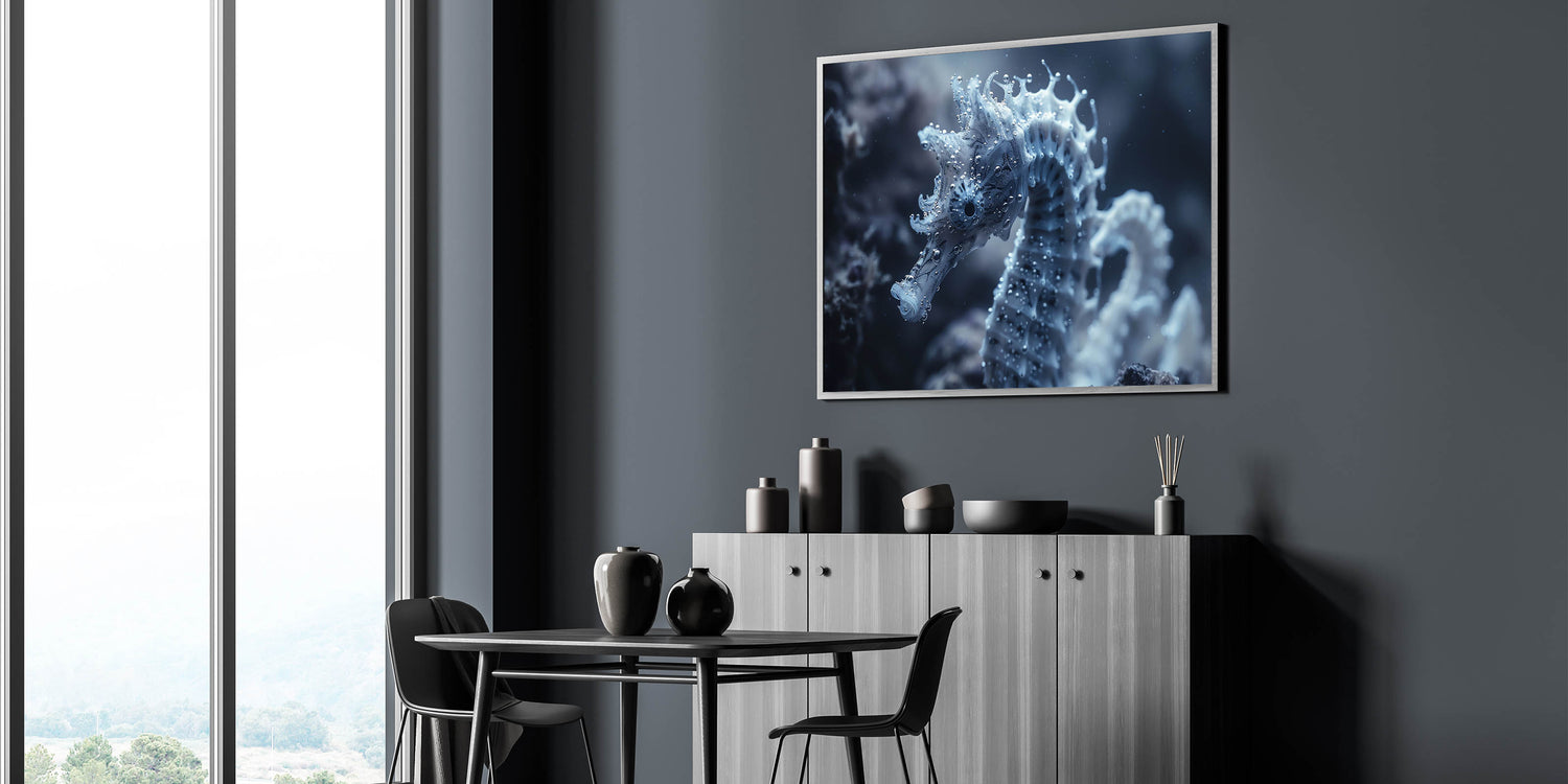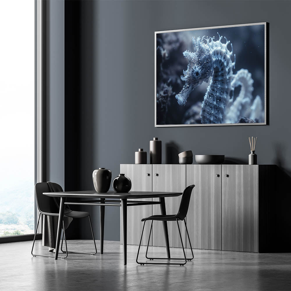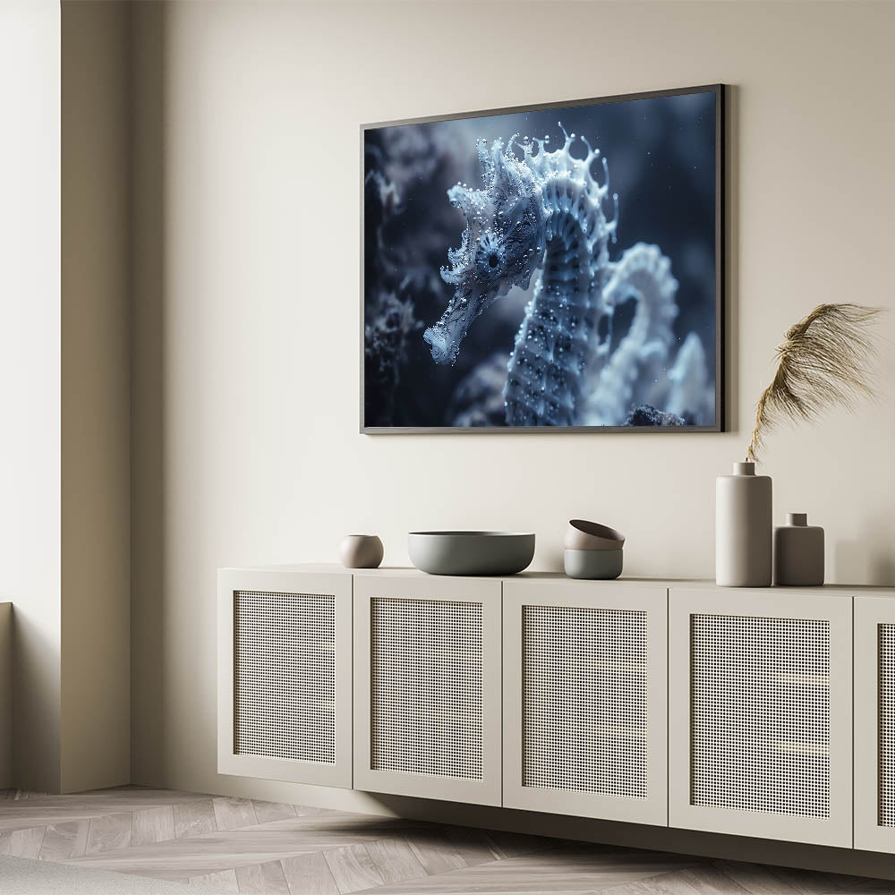 This captivating artwork features a frozen seahorse beautifully encased in delicate frost and water droplets, capturing the ethereal beauty of nature in a wintry underwater world. The intricate details of the seahorse’s icy exterior evoke a sense of tranquility, making this piece perfect for any room seeking a touch of oceanic serenity combined with the chill of winter. Its soft blues and silvery hues create a soothing atmosphere, offering a unique fusion of marine life and frosty wonder.