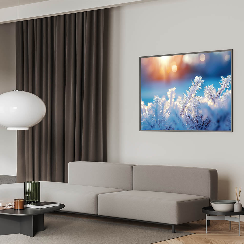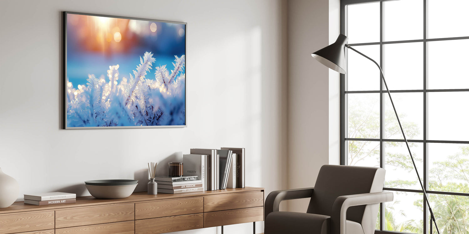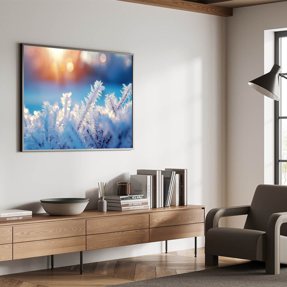 Enhance your space with this stunning artwork, where the beauty of frost meets the warmth of sunrise. Its unique combination of cool blues and soft golden light makes it a perfect statement piece for any room.