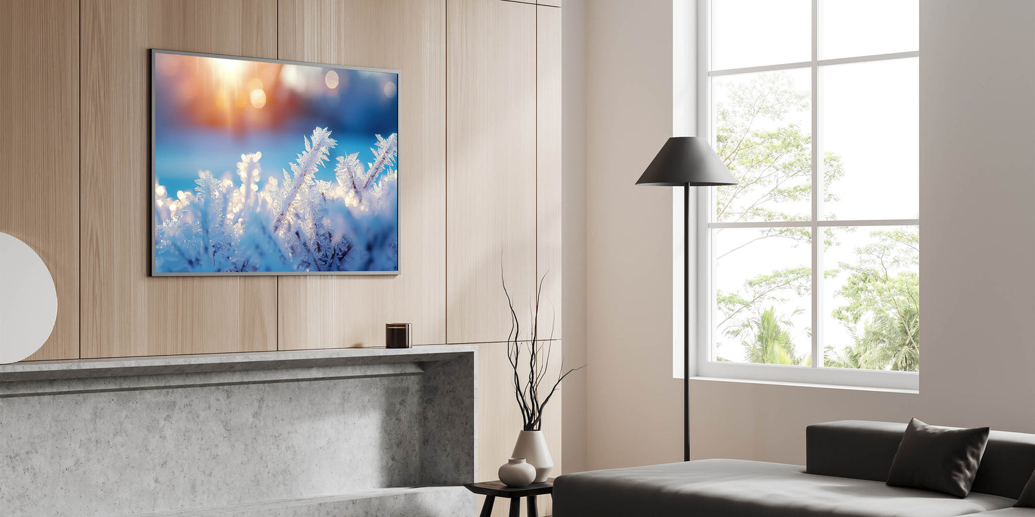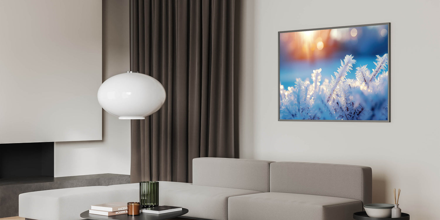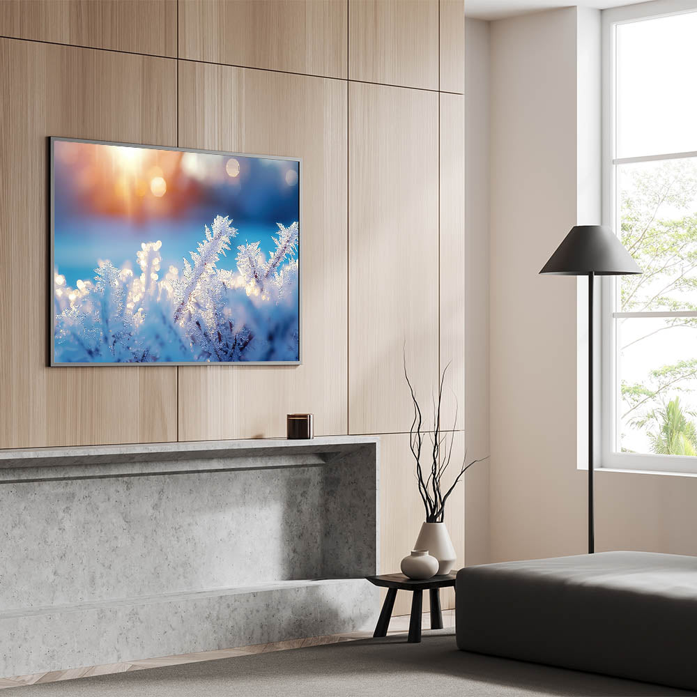 Enhance your space with this stunning artwork, where the beauty of frost meets the warmth of sunrise. Its unique combination of cool blues and soft golden light makes it a perfect statement piece for any room.