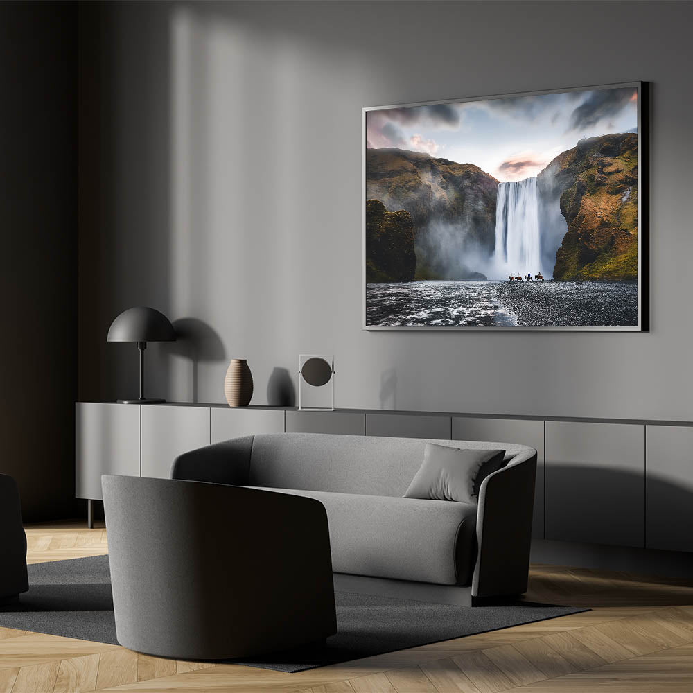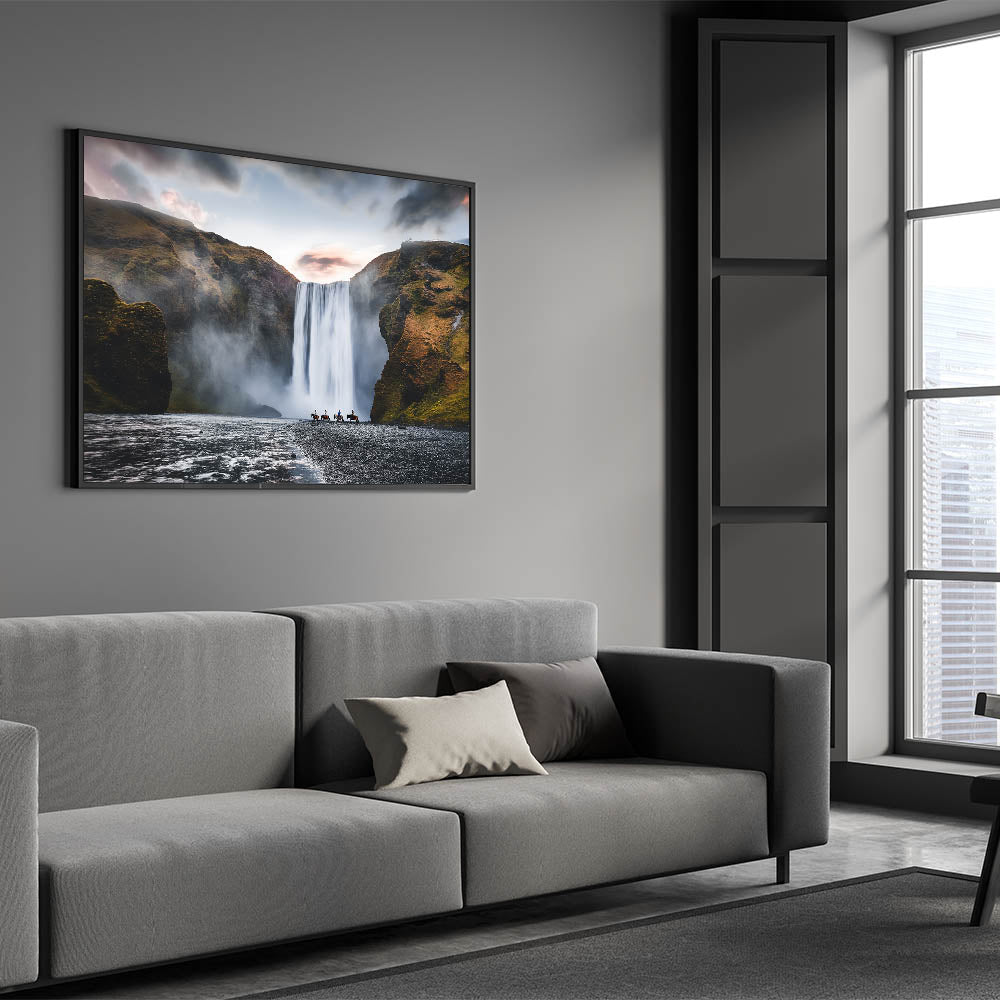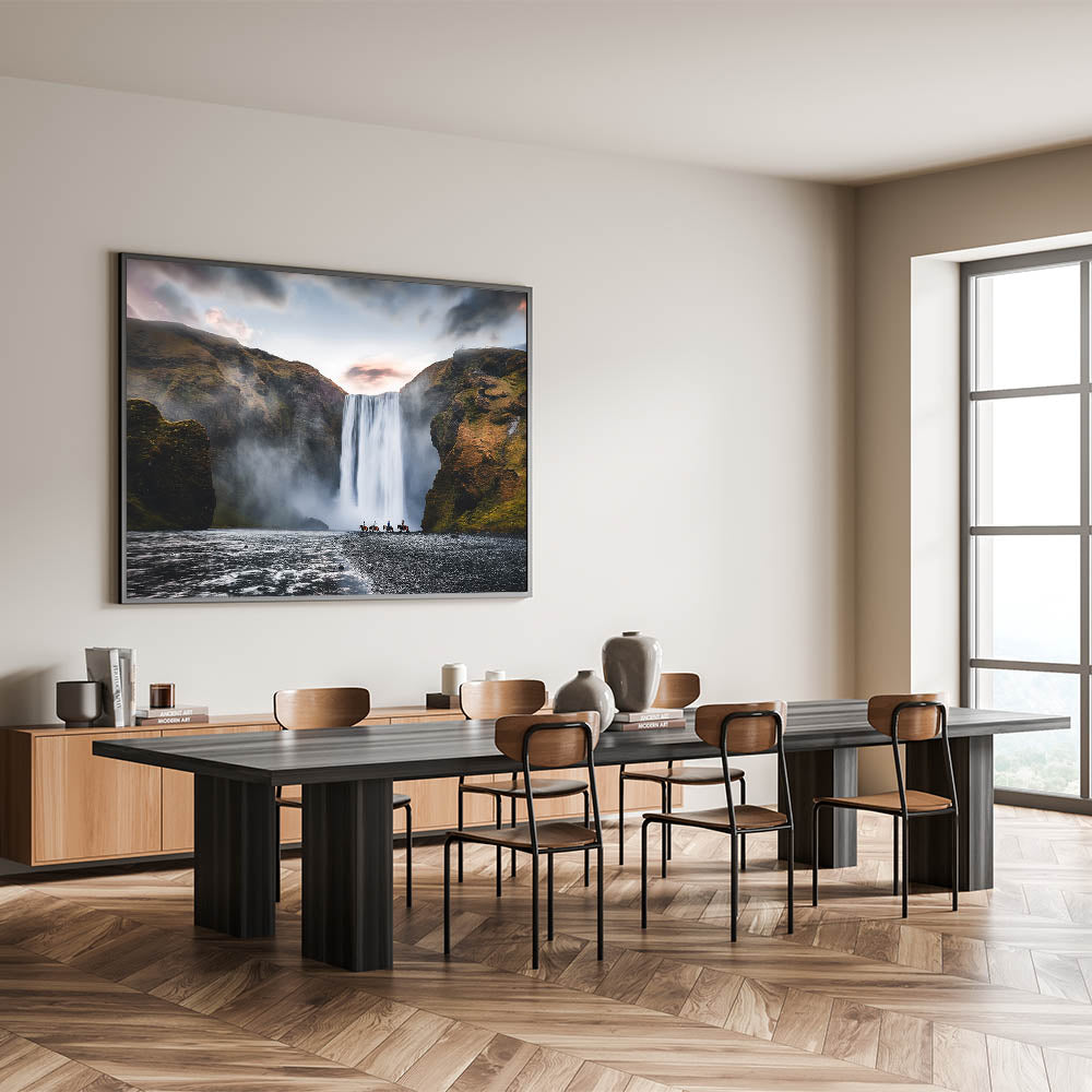 This captivating wall art features a dramatic scene of horse riders approaching the majestic Skógafoss waterfall in Iceland. The towering waterfall, with mist rising from the cascading water, contrasts beautifully with the rugged cliffs and the tranquil river. The inclusion of Icelandic horse riders adds an adventurous and iconic element to this stunning natural landscape. Perfect for bringing the raw beauty and spirit of Iceland into your space.