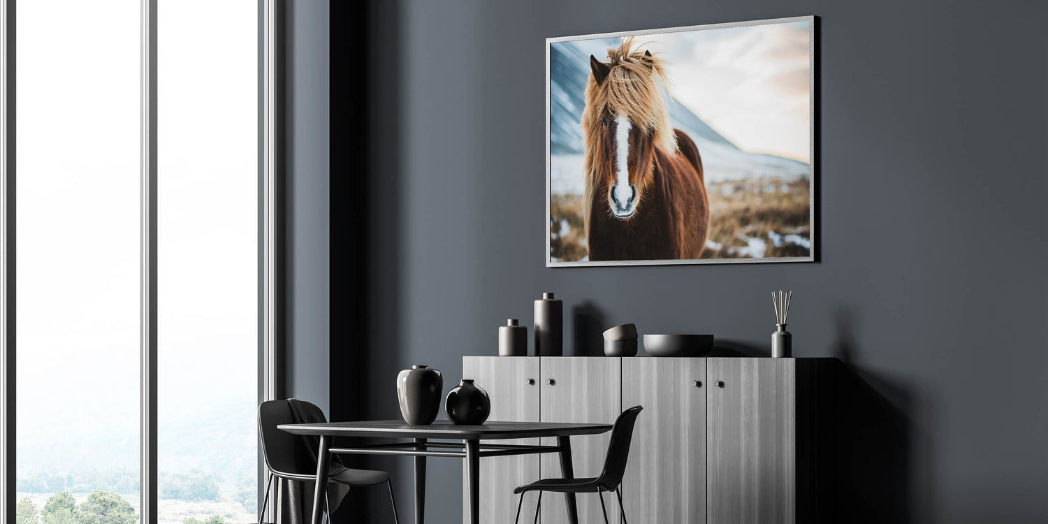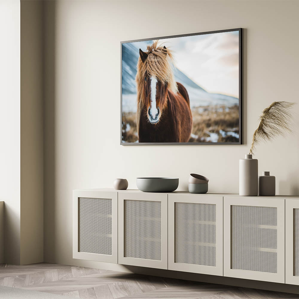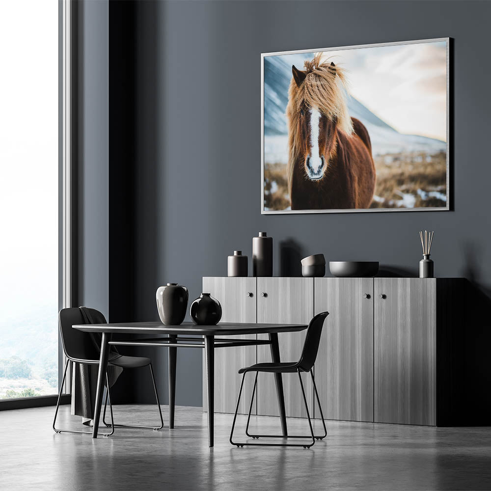 This captivating Icelandic horse wall art brings the essence of Iceland's majestic wildlife into your space. The photograph beautifully captures the strength and elegance of the Icelandic horse, with its windswept mane and distinctive markings, set against a serene snowy backdrop.