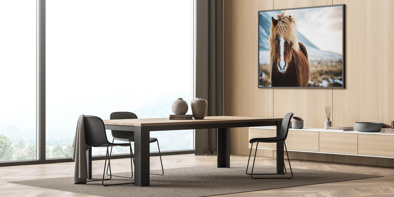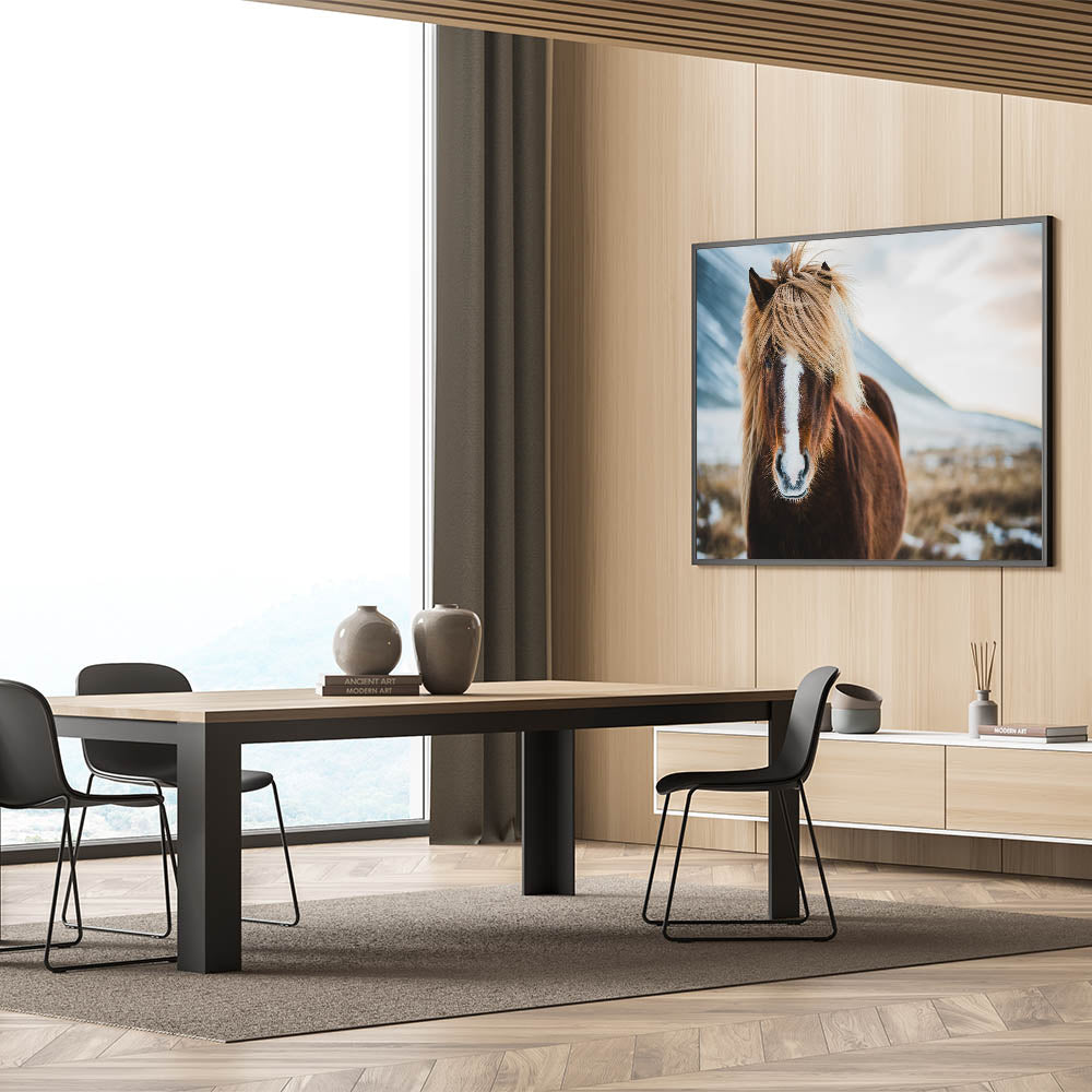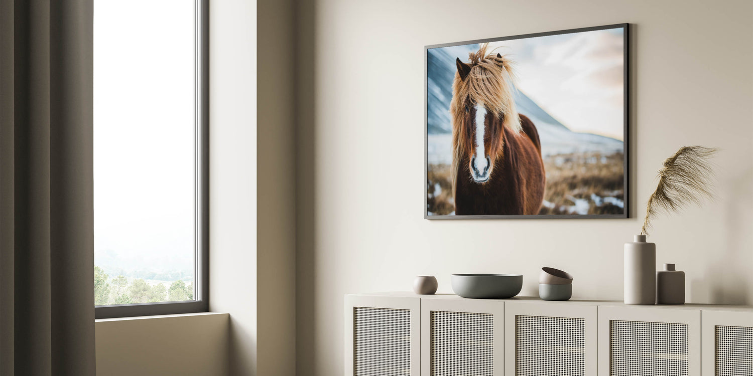 This captivating Icelandic horse wall art brings the essence of Iceland's majestic wildlife into your space. The photograph beautifully captures the strength and elegance of the Icelandic horse, with its windswept mane and distinctive markings, set against a serene snowy backdrop.
