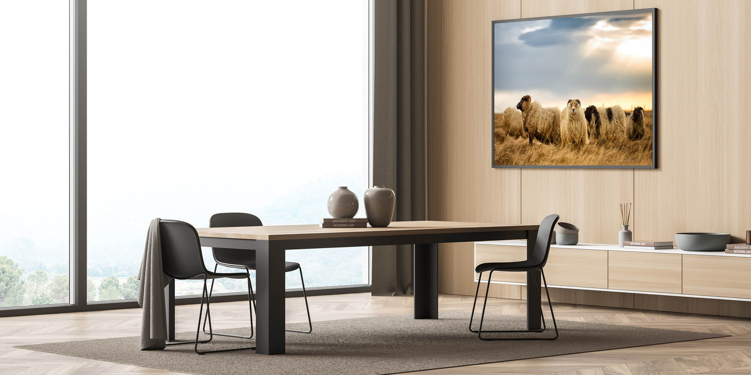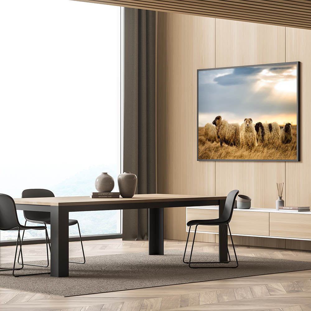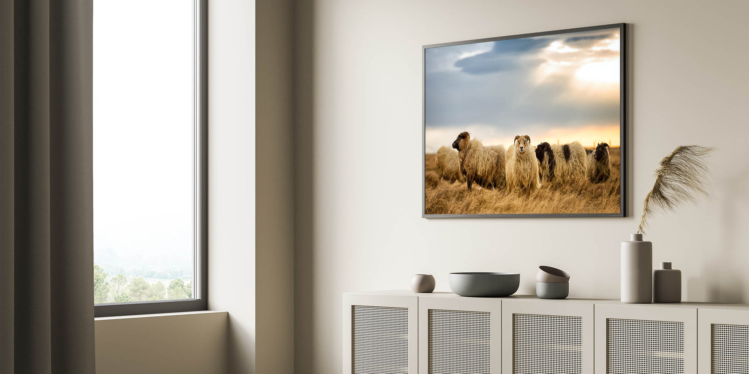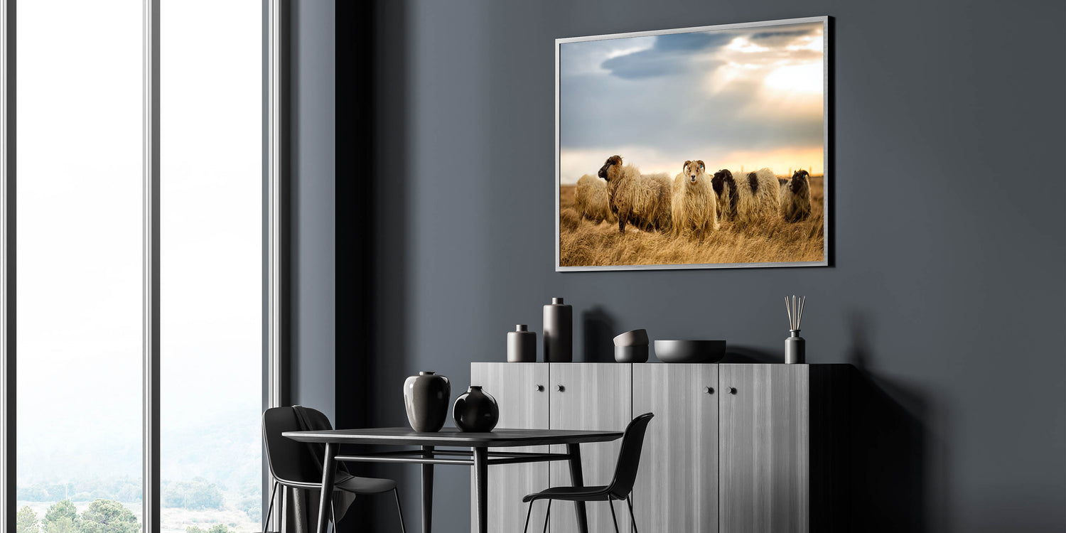 Capture the charm of Iceland’s countryside with this captivating Iceland Photography print featuring Icelandic sheep in their natural landscape. This artwork beautifully showcases the rugged and serene beauty of Iceland, with the woolly sheep grazing peacefully under a soft, cloudy sky. It’s the perfect piece for anyone who loves rustic and nature-inspired art.