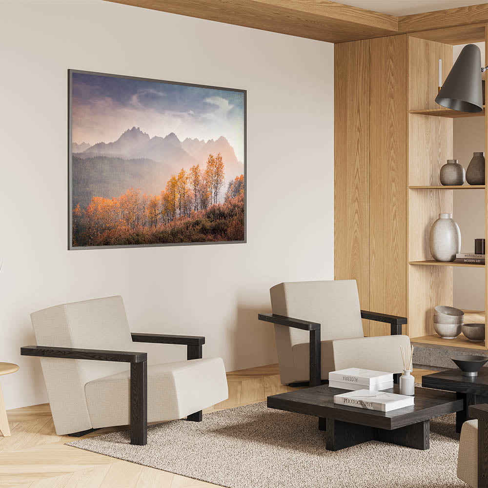Enhance your living space with this captivating wall art featuring a misty mountain landscape adorned with vibrant autumn foliage. This stunning Idaho photography captures the tranquil beauty of nature, showcasing the rugged mountains shrouded in soft mist and the warm hues of fall. Perfect for those who appreciate the serene aspects of Idaho’s natural scenery, this artwork will bring a sense of calm and elegance to any home or office decor.
