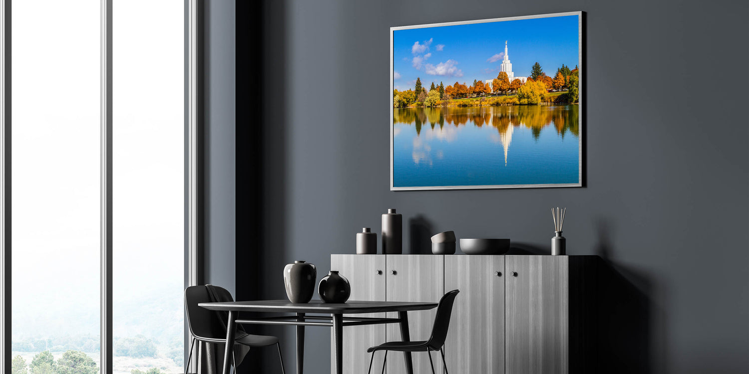 Embrace the serene beauty of Idaho with this stunning wall art featuring the Idaho Falls Temple surrounded by vibrant autumn foliage. The picturesque scene captures the temple’s reflection on the tranquil water, creating a breathtaking view that embodies the essence of Idaho’s natural and architectural beauty. Perfect for those who appreciate Idaho photography, this artwork will bring a touch of elegance and tranquility to any home or office decor.