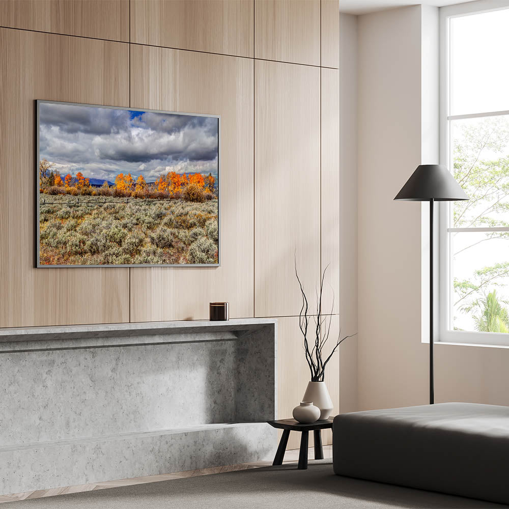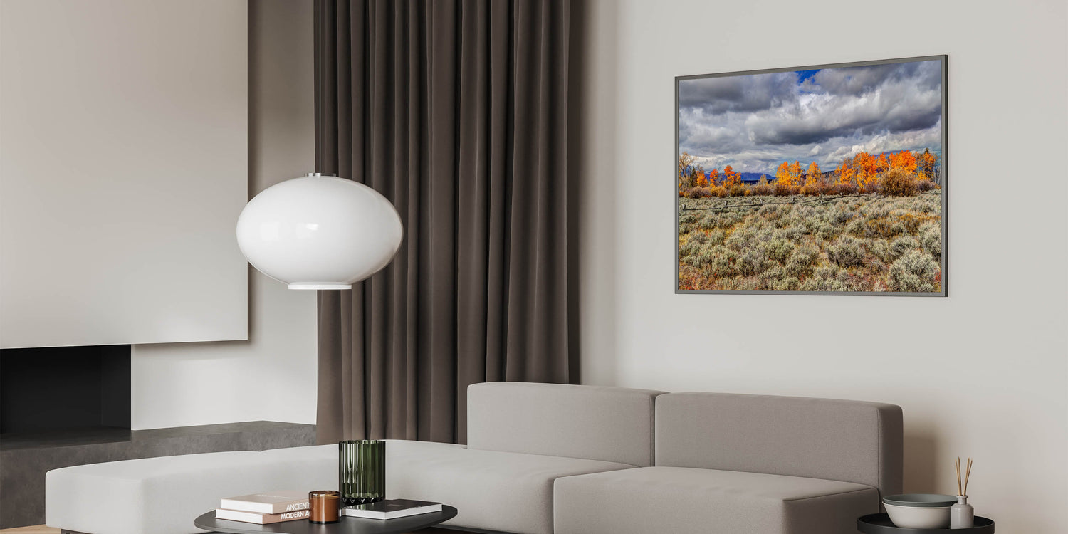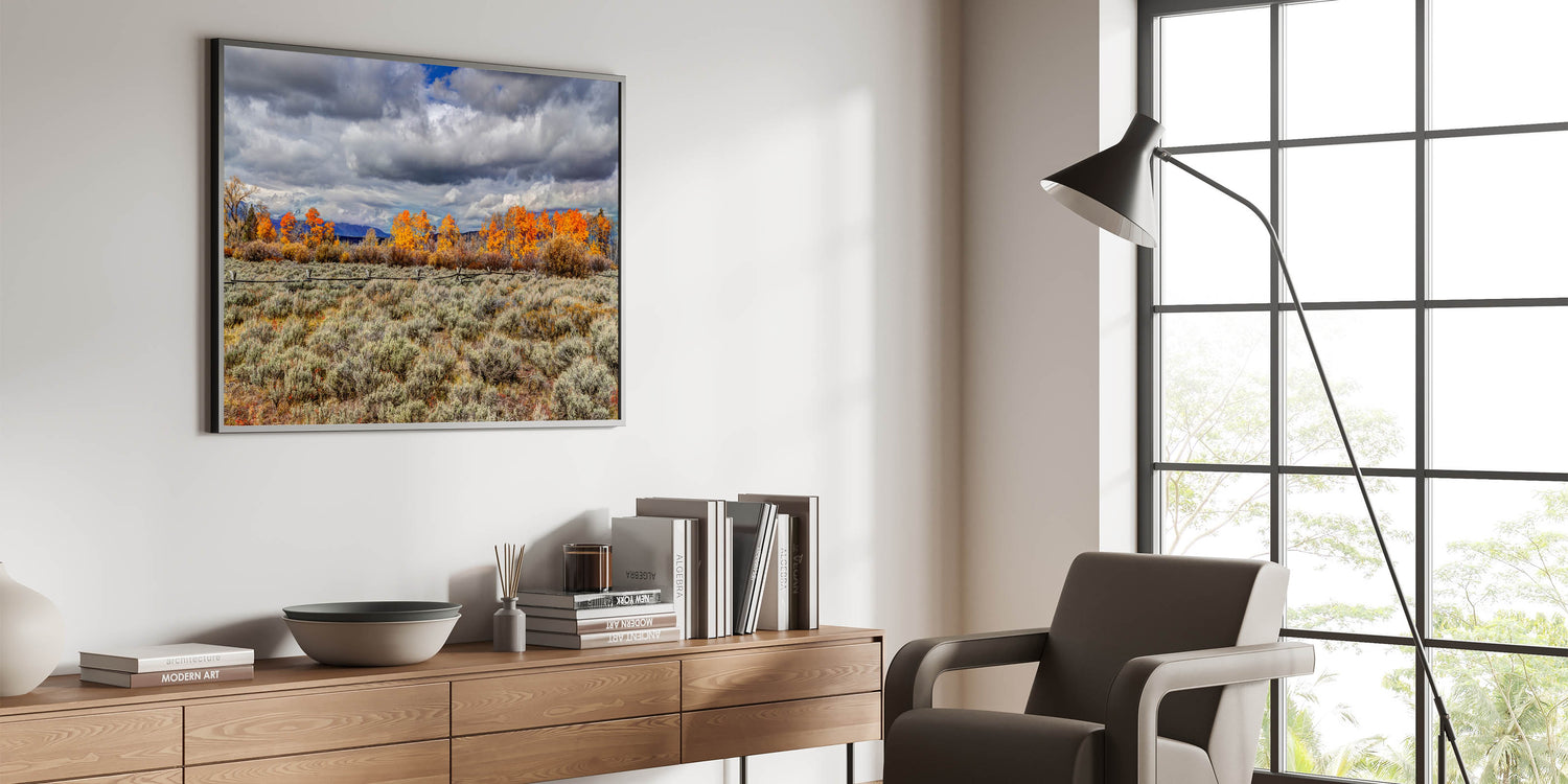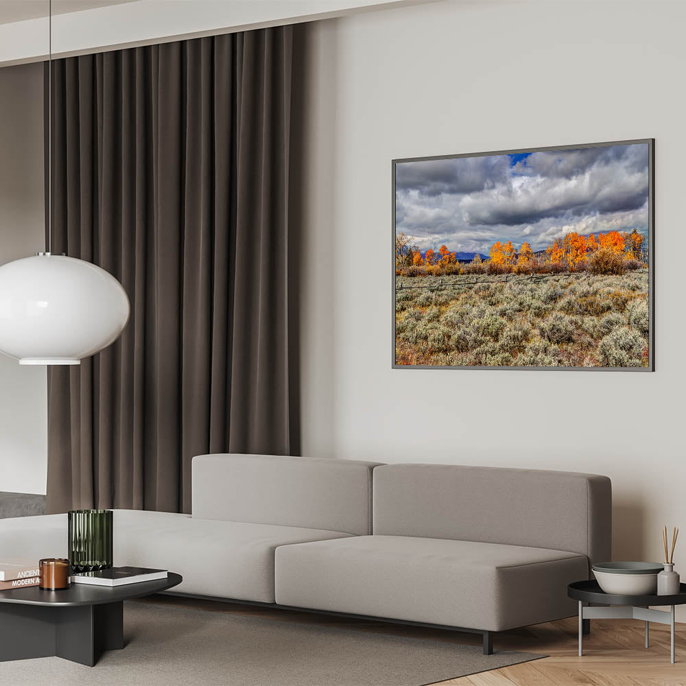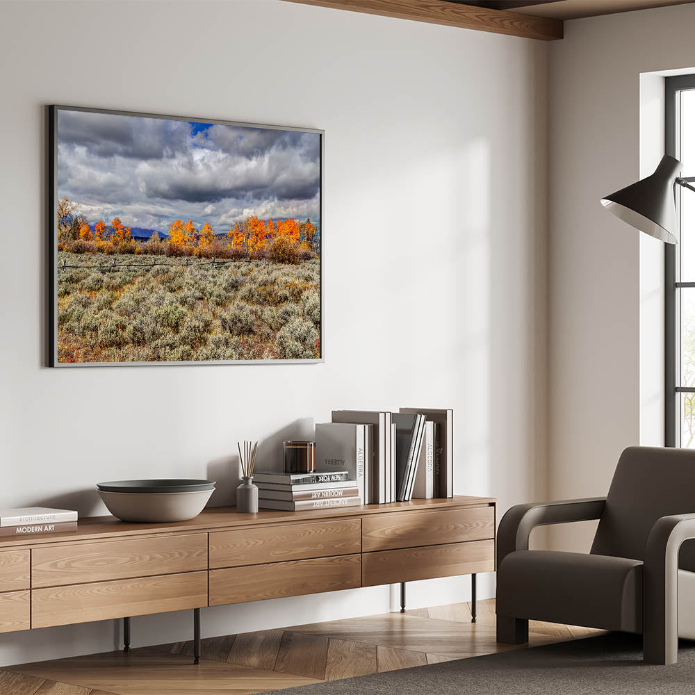 Experience the beauty of Idaho’s vibrant autumn landscapes with this stunning wall art. Featuring golden and orange fall foliage set against a dramatic sky and soft sagebrush fields, this piece captures the essence of picturesque Idaho scenery. The bold colors and serene composition make this artwork ideal for those seeking to bring a touch of nature into their home.