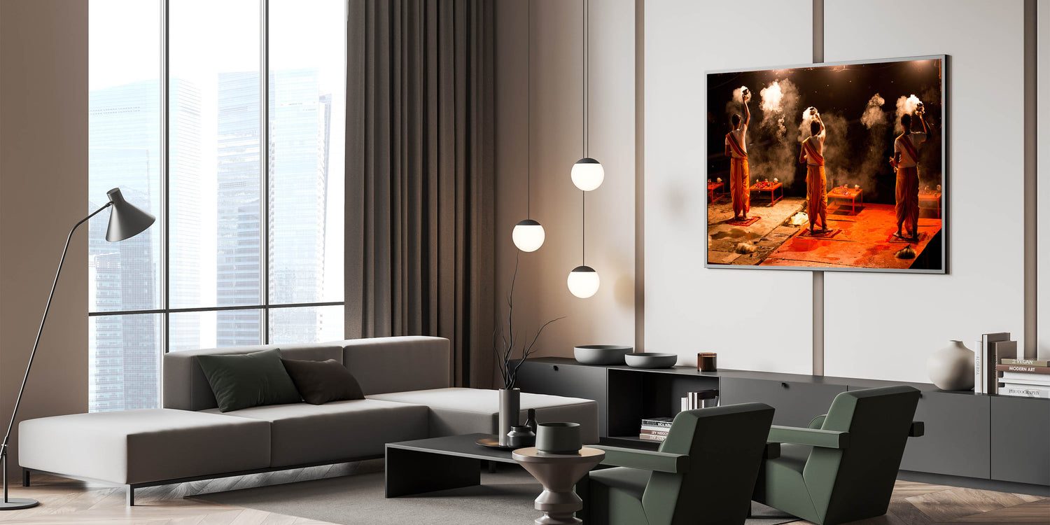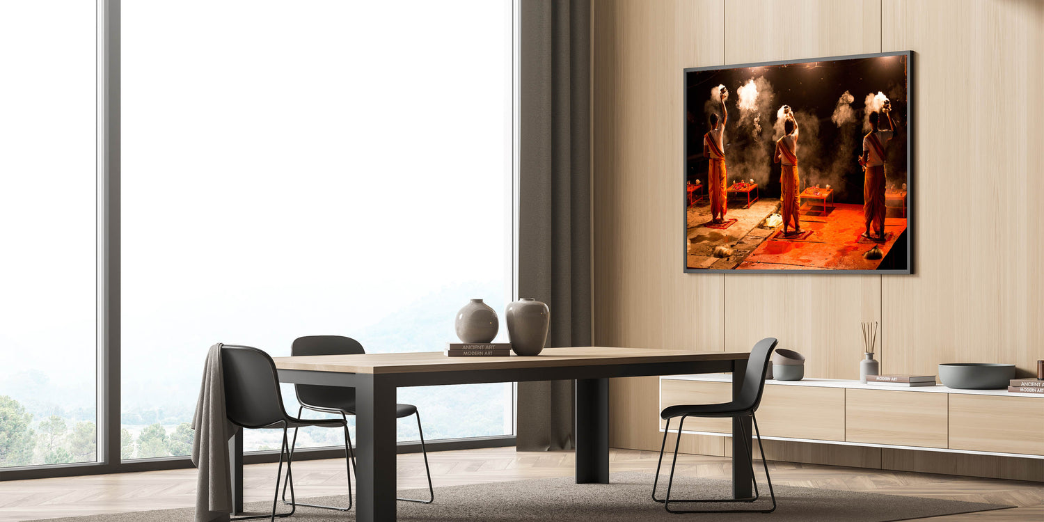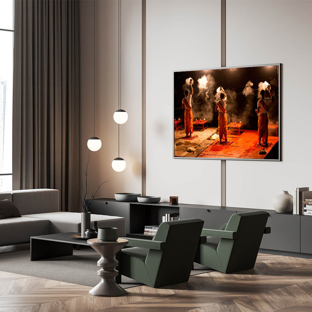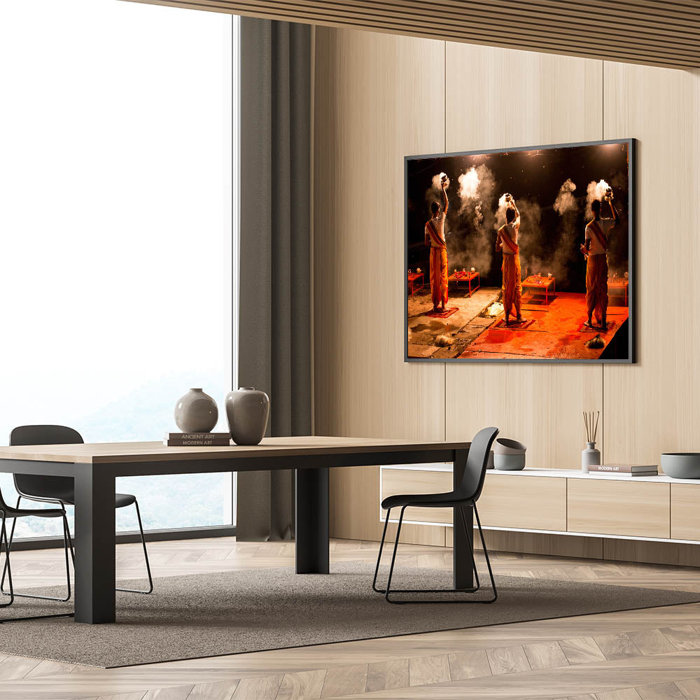 Experience the spiritual essence of India with this captivating wall art, showcasing the sacred evening Aarti ritual on the banks of the Ganges River. The powerful imagery of priests performing the ceremonial fire ritual against the backdrop of night creates an aura of mysticism and reverence. This artwork encapsulates the vibrant energy of Indian spirituality, making it an ideal piece for those looking to add depth and cultural significance to their space.