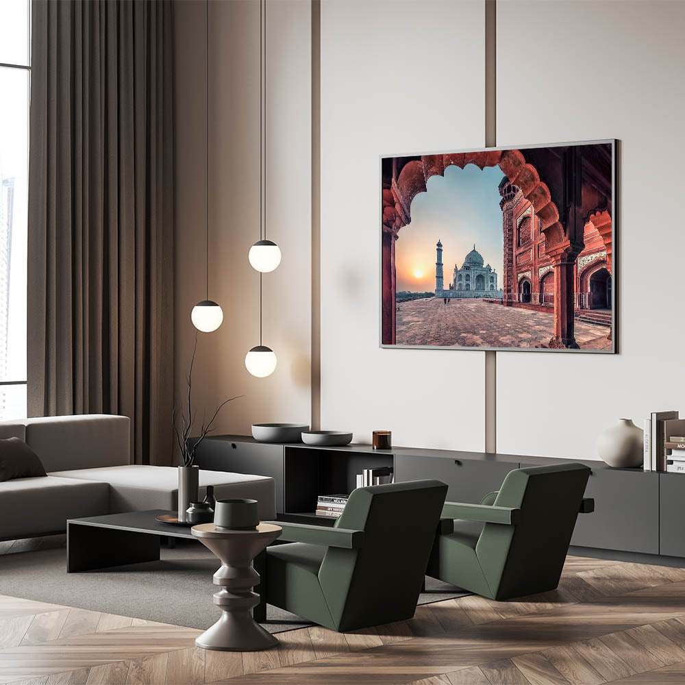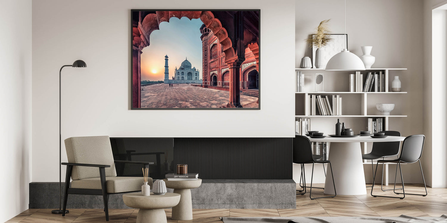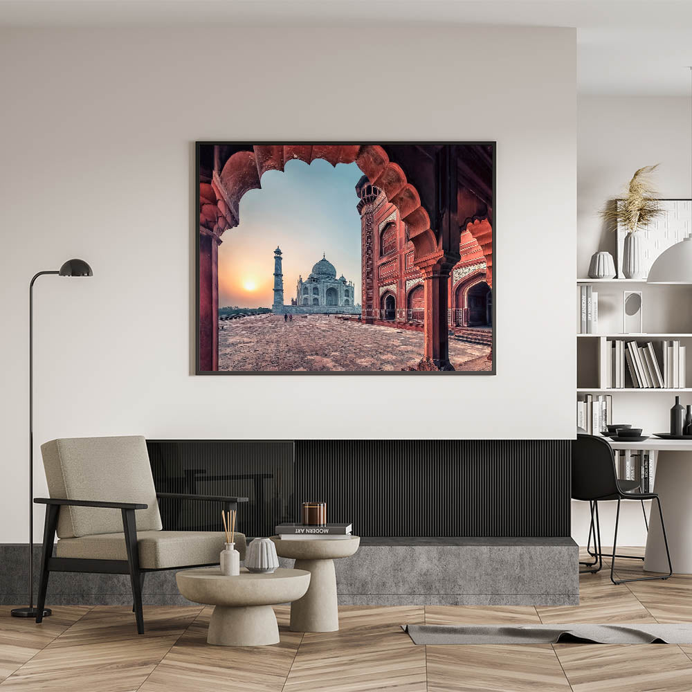 Framed India Artwork - Majestic Taj Mahal at Sunrise with Intricate Archway