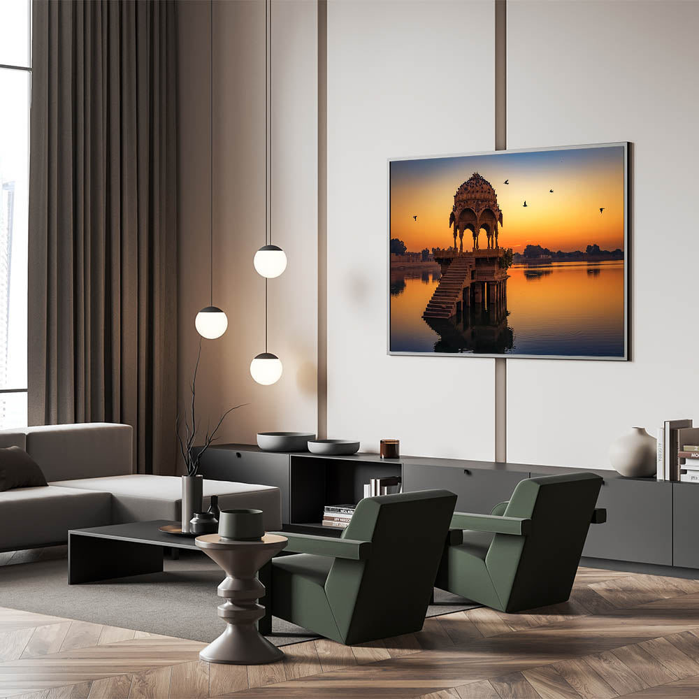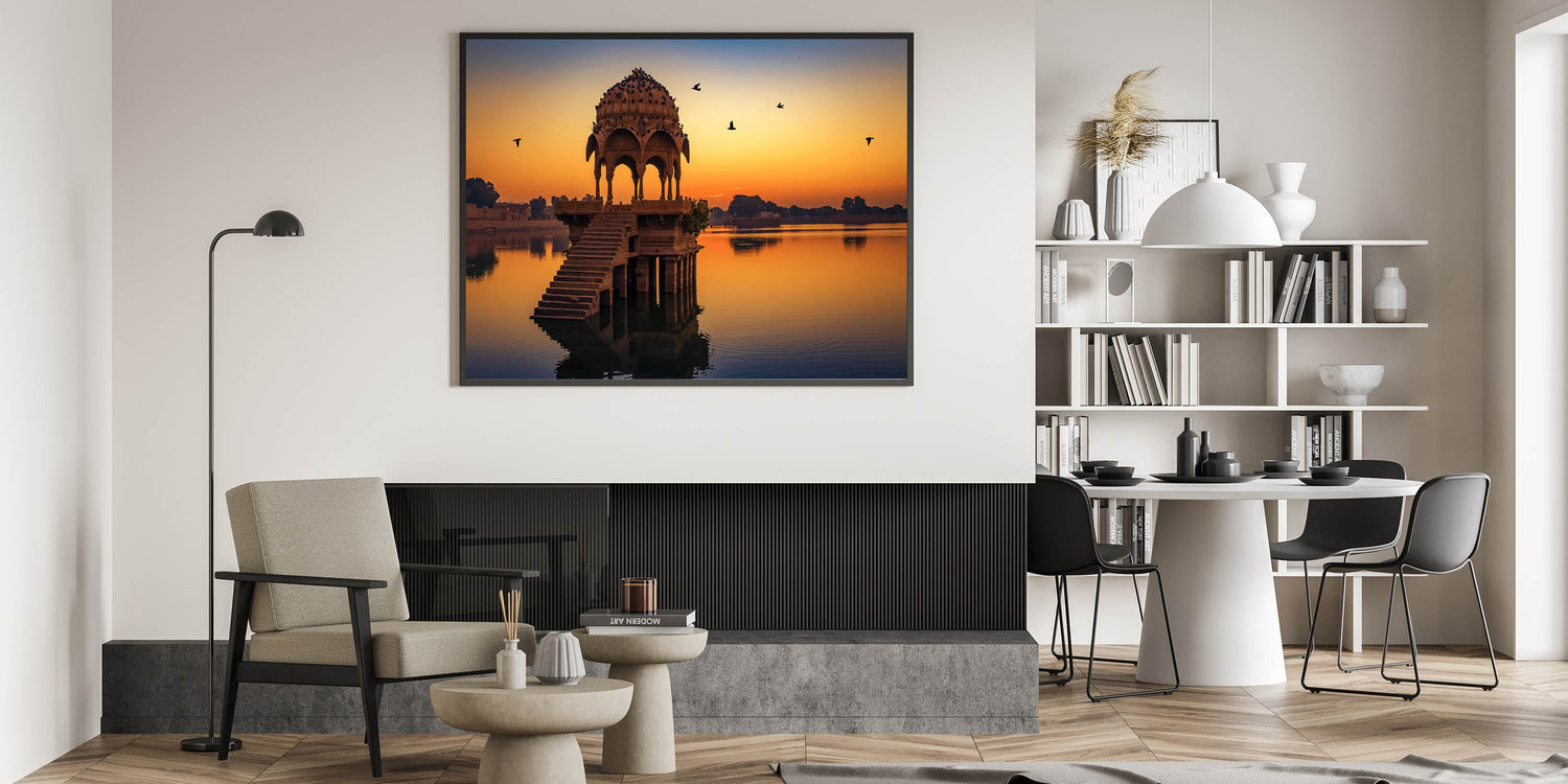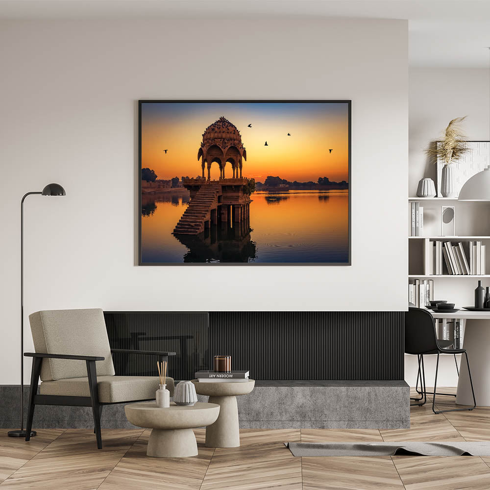 This framed India artwork beautifully captures the golden hues of a sunset over Jaisalmer's iconic lake pavilion. The warm glow of the sky and the peaceful reflection on the water create a serene and mesmerizing scene, perfectly blending India's architectural beauty with nature's tranquility. This piece brings a sense of calm and cultural richness to any room, making it ideal for living rooms, bedrooms, or offices.