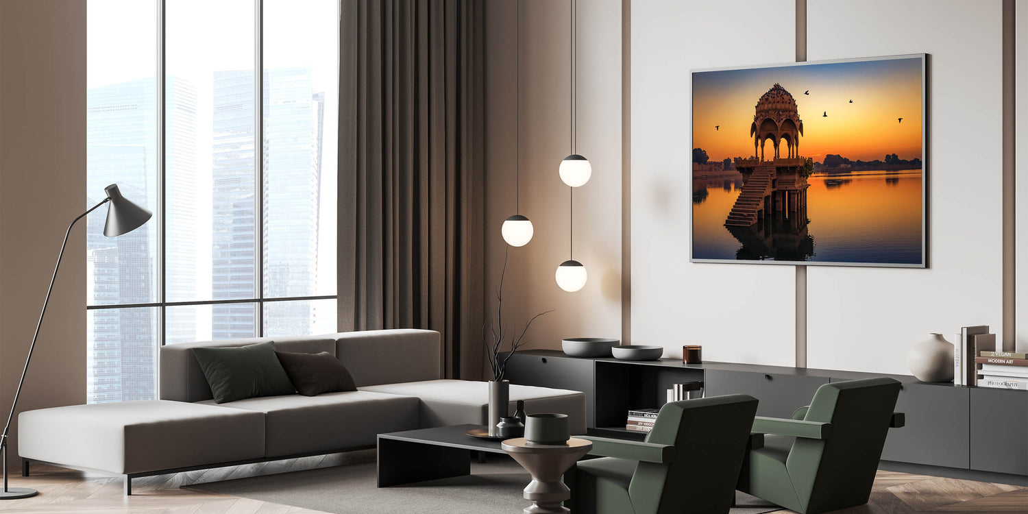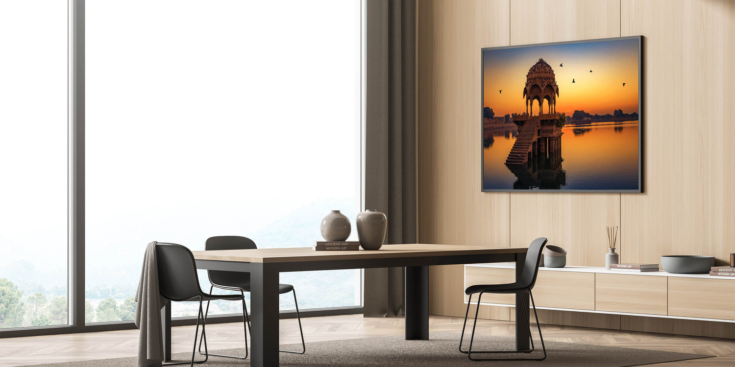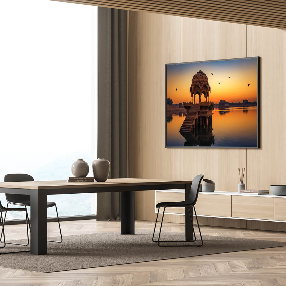 This framed India artwork beautifully captures the golden hues of a sunset over Jaisalmer's iconic lake pavilion. The warm glow of the sky and the peaceful reflection on the water create a serene and mesmerizing scene, perfectly blending India's architectural beauty with nature's tranquility. This piece brings a sense of calm and cultural richness to any room, making it ideal for living rooms, bedrooms, or offices.
