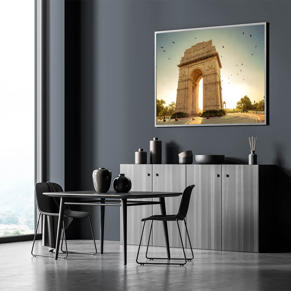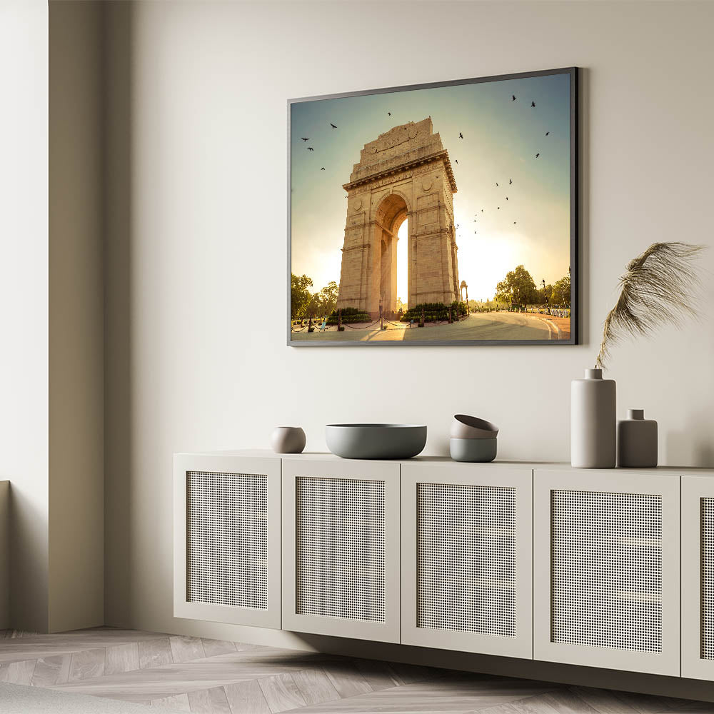 Celebrate the grandeur of India’s iconic India Gate with this stunning wall art, capturing the monument at sunrise. Bathed in golden light with birds soaring in the sky, this image evokes a sense of tranquility and national pride. The warm glow of the morning sun combined with the architectural beauty of the India Gate creates a perfect balance of serenity and history. This piece is ideal for anyone looking to bring a touch of India’s cultural heritage into their space.