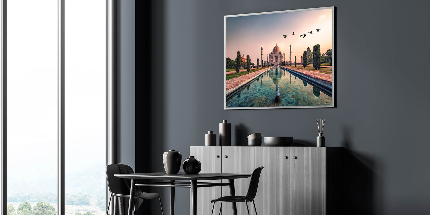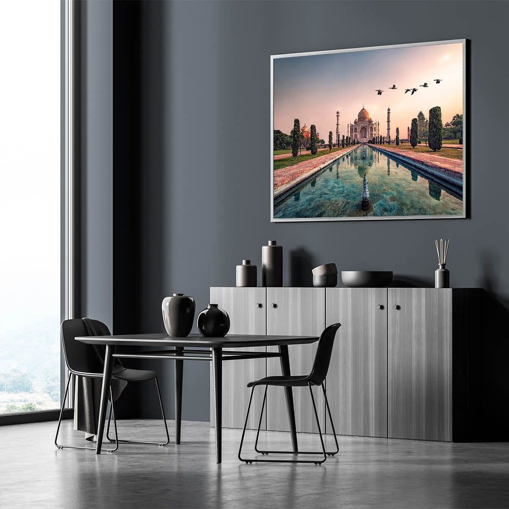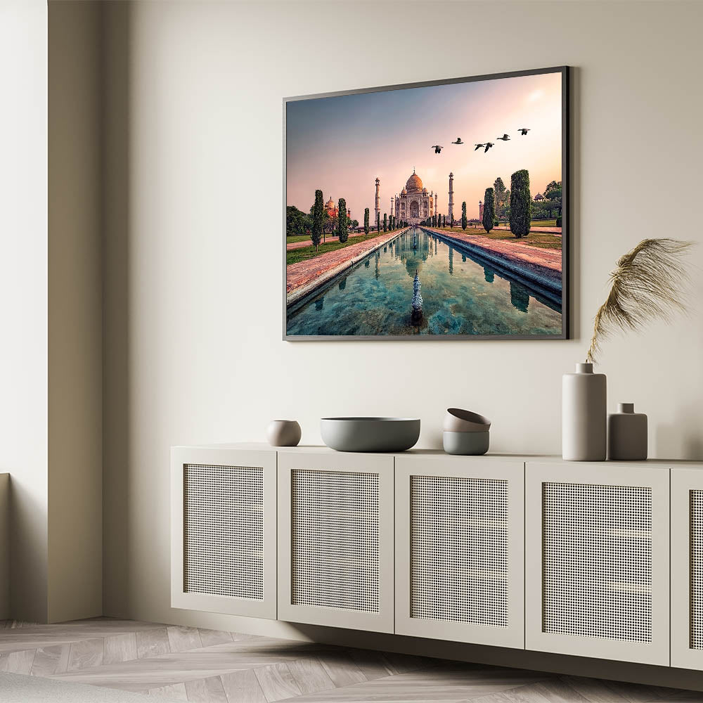This Indian Landscape Canvas features the Taj Mahal in all its majestic glory, reflected in the calm waters of its famous garden pool at sunrise. The peaceful morning light bathes the monument in a soft glow, while a flock of birds soars gracefully overhead, adding a sense of serenity and elegance to the scene. The symmetry of the architecture and the reflection in the water create a harmonious balance, making this artwork a perfect addition to any space seeking a touch of cultural refinement and timeless beauty.