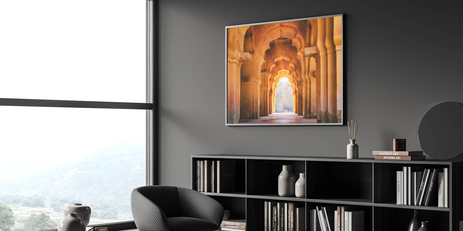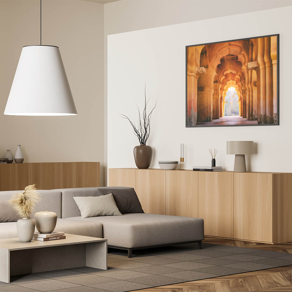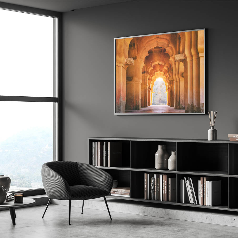 This Indian architecture wall art is perfect for creating a sophisticated focal point in your home. The stunning arches and warm light offer a serene yet powerful aesthetic that will enhance any living space, office, or bedroom.