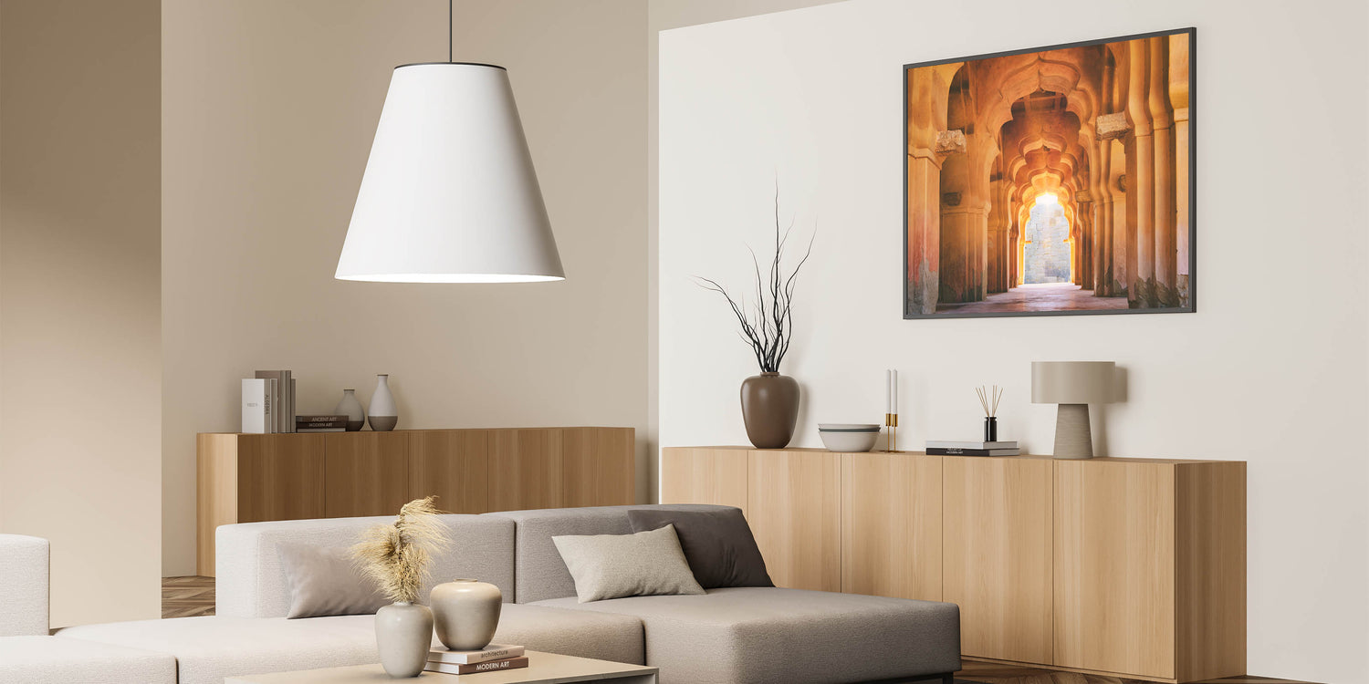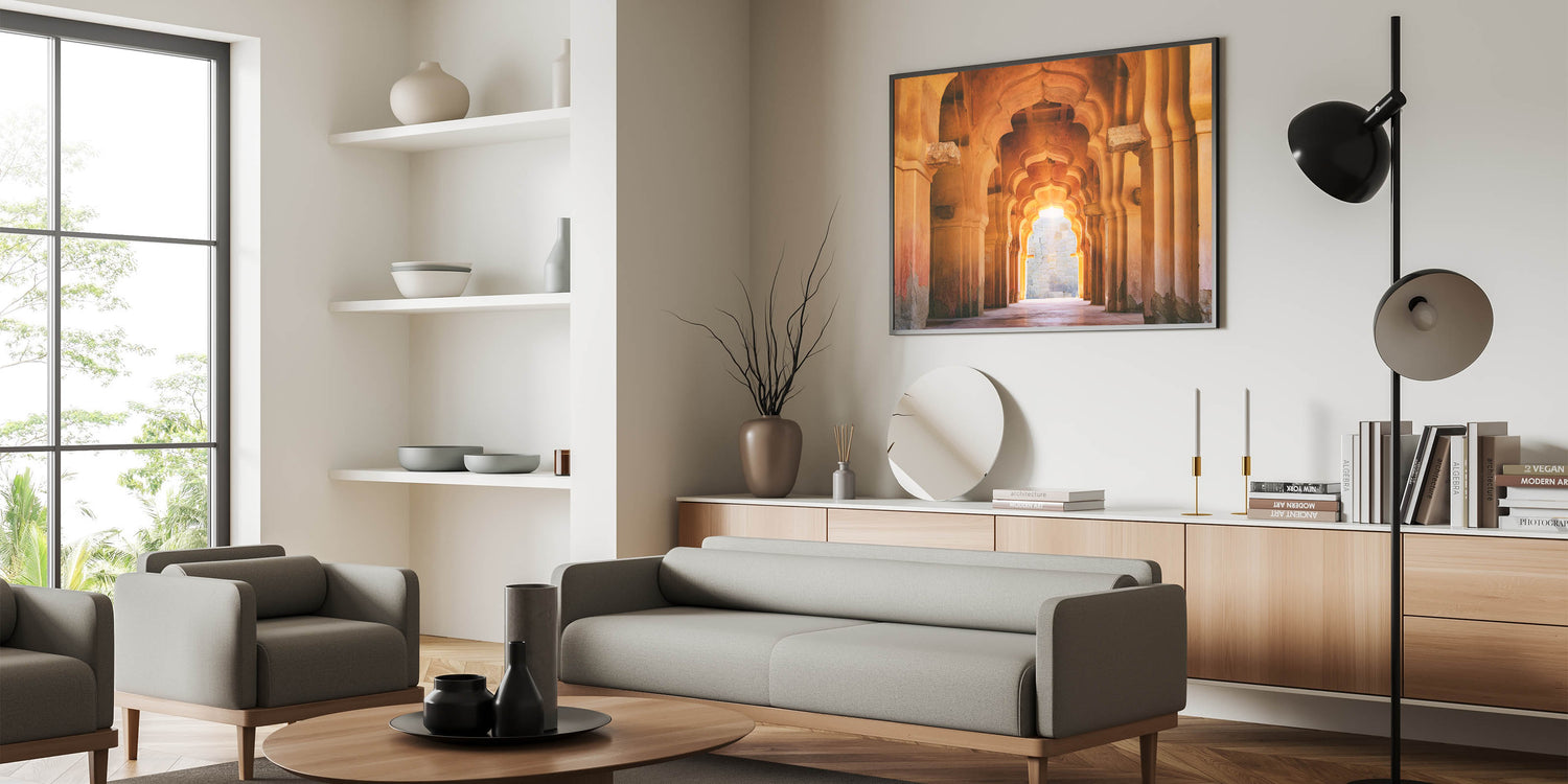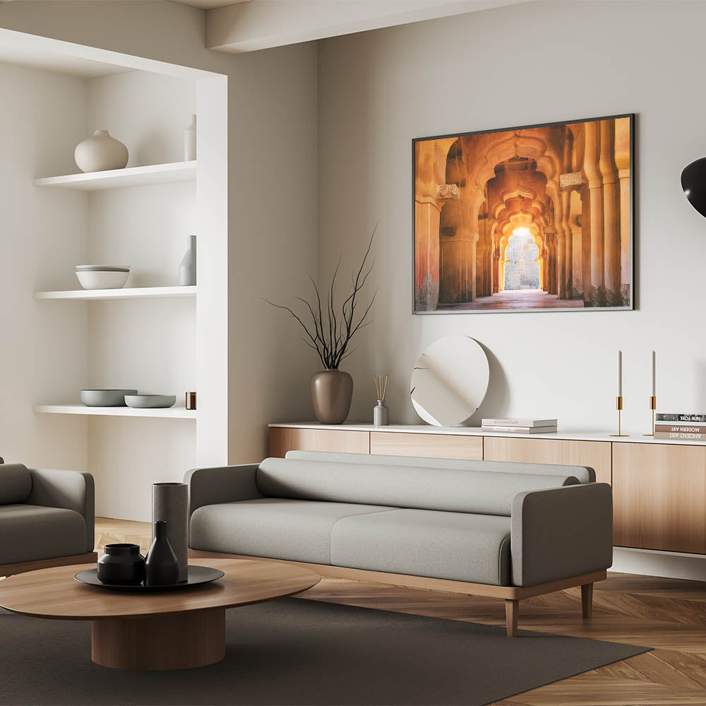 This Indian architecture wall art is perfect for creating a sophisticated focal point in your home. The stunning arches and warm light offer a serene yet powerful aesthetic that will enhance any living space, office, or bedroom.