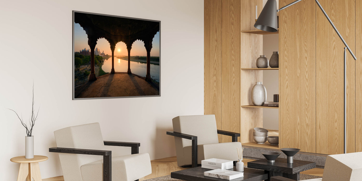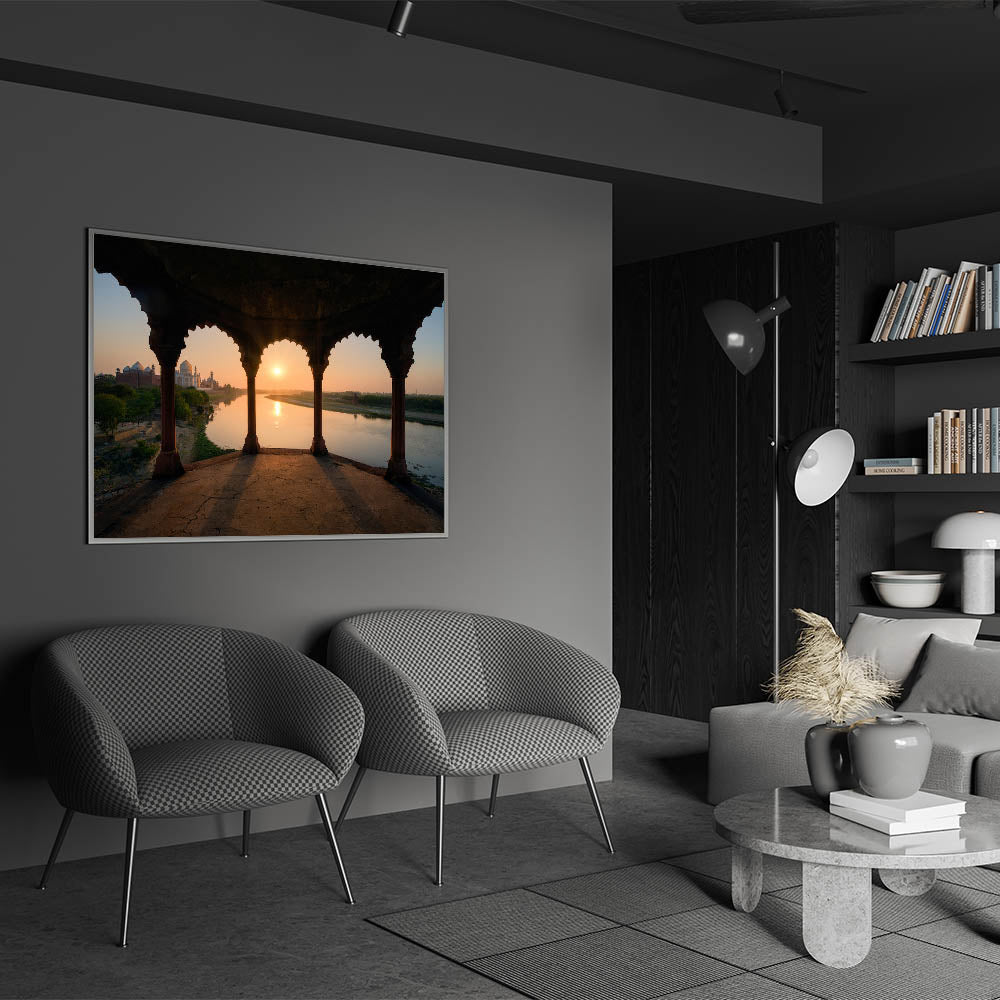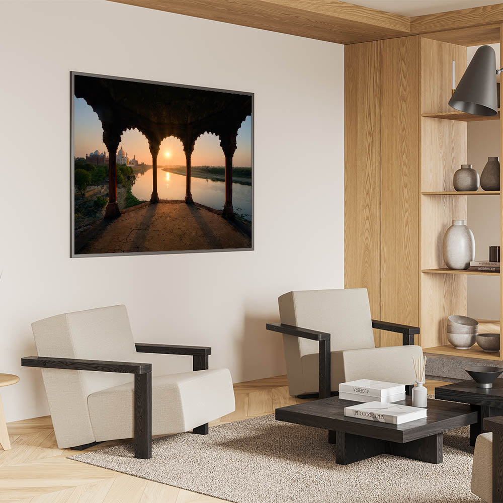 Experience the serene beauty of the Taj Mahal at Sunset with this captivating Indian Architecture Wall Art. This stunning canvas print captures the iconic Taj Mahal, framed by traditional Indian arches and glowing in the soft light of the setting sun. The golden hues of the sunset reflecting on the river create a peaceful and timeless scene that perfectly encapsulates the grandeur and elegance of this world-renowned landmark.