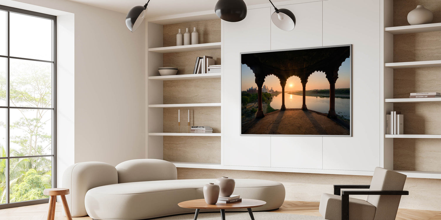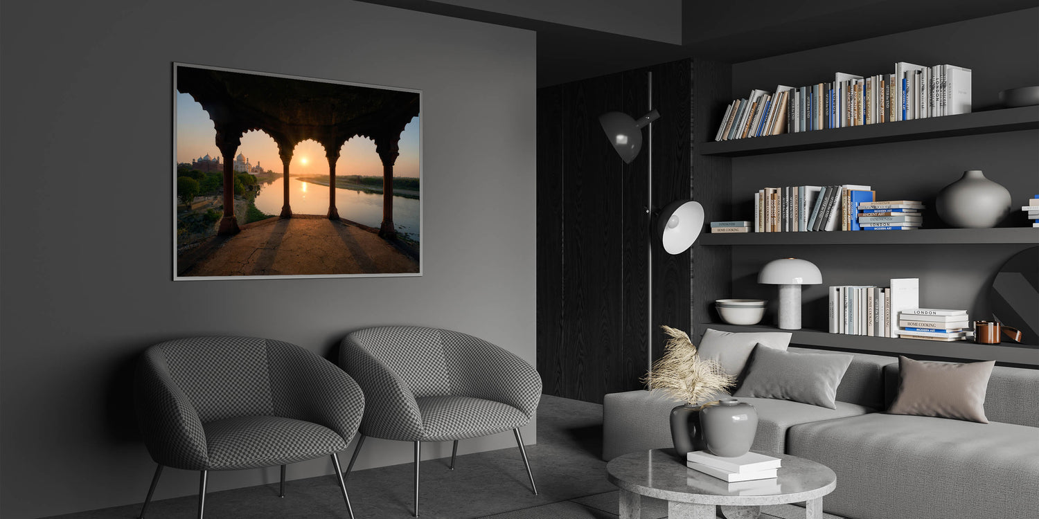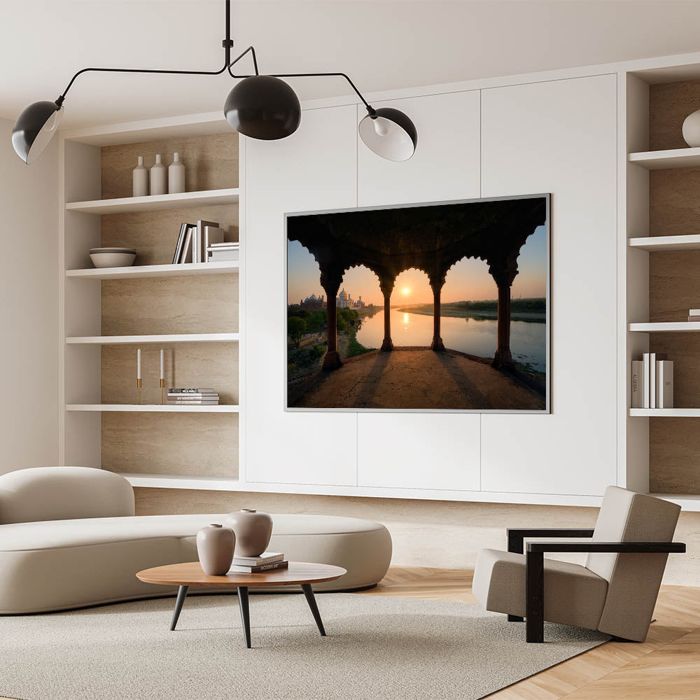 Experience the serene beauty of the Taj Mahal at Sunset with this captivating Indian Architecture Wall Art. This stunning canvas print captures the iconic Taj Mahal, framed by traditional Indian arches and glowing in the soft light of the setting sun. The golden hues of the sunset reflecting on the river create a peaceful and timeless scene that perfectly encapsulates the grandeur and elegance of this world-renowned landmark.
