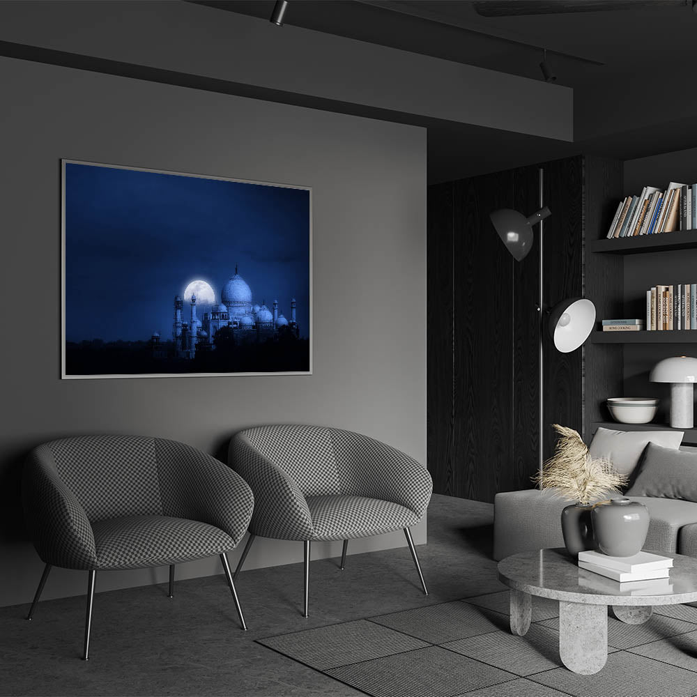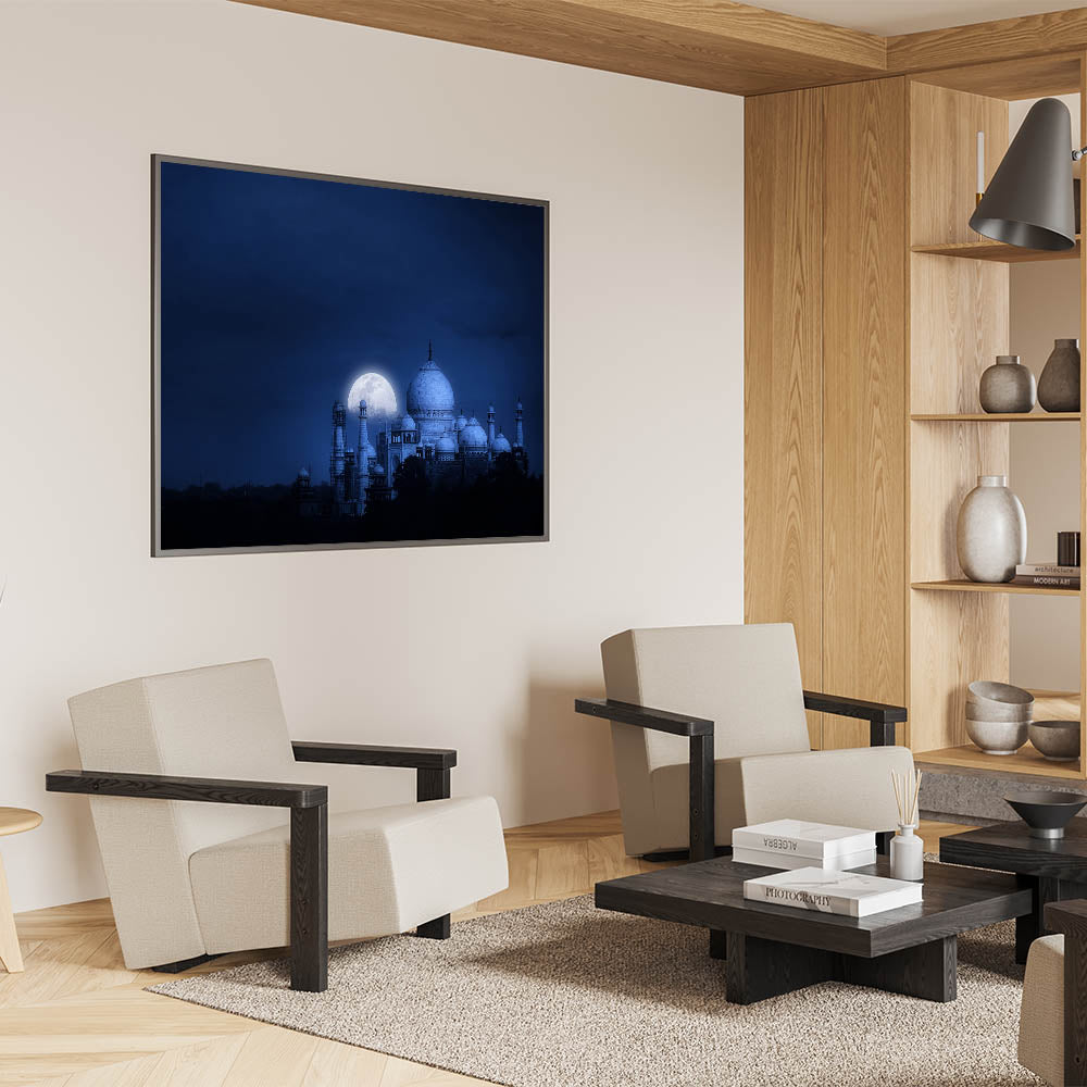 Capture the mystique and beauty of India’s Taj Mahal under a full moon with this stunning wall art. This breathtaking image showcases the Taj Mahal bathed in moonlight, creating a serene and enchanting atmosphere. The deep blue night sky, contrasted by the glowing white of the moon and the monument, makes this piece perfect for adding an element of calm and elegance to any room. Ideal for lovers of Indian culture and history, this artwork highlights the majestic architectural beauty of the Taj Mahal in a peaceful night setting.