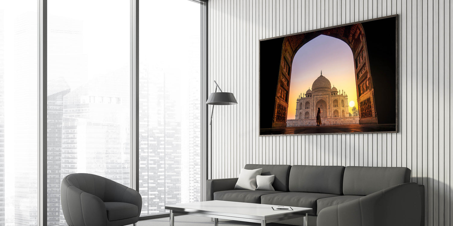 Capture the magic of one of the world’s most iconic landmarks with this breathtaking wall art of the Taj Mahal. Featuring a striking silhouette of the Taj Mahal at sunset, this artwork evokes a sense of wonder and timeless beauty. The soft pastel hues of the sunset combined with the grand architectural design make this piece perfect for creating a serene and elegant atmosphere in your home or office.
