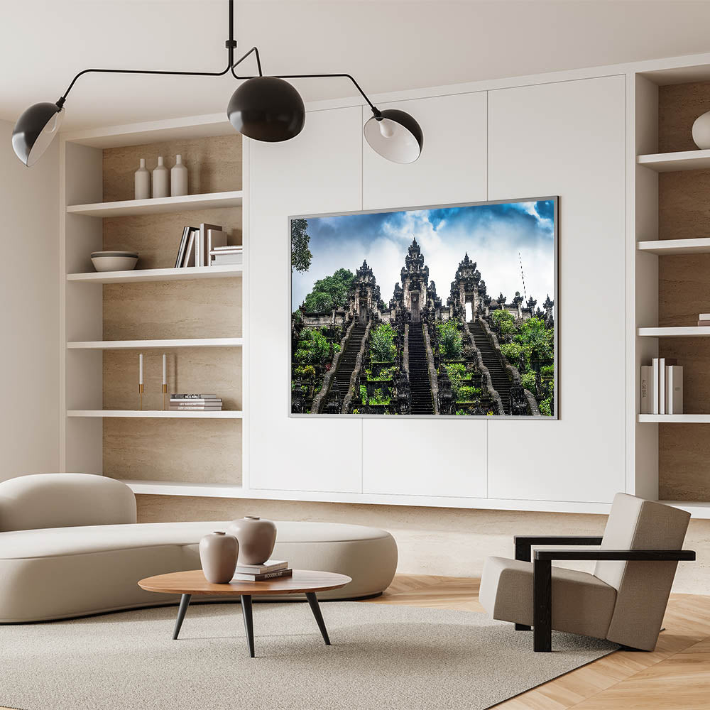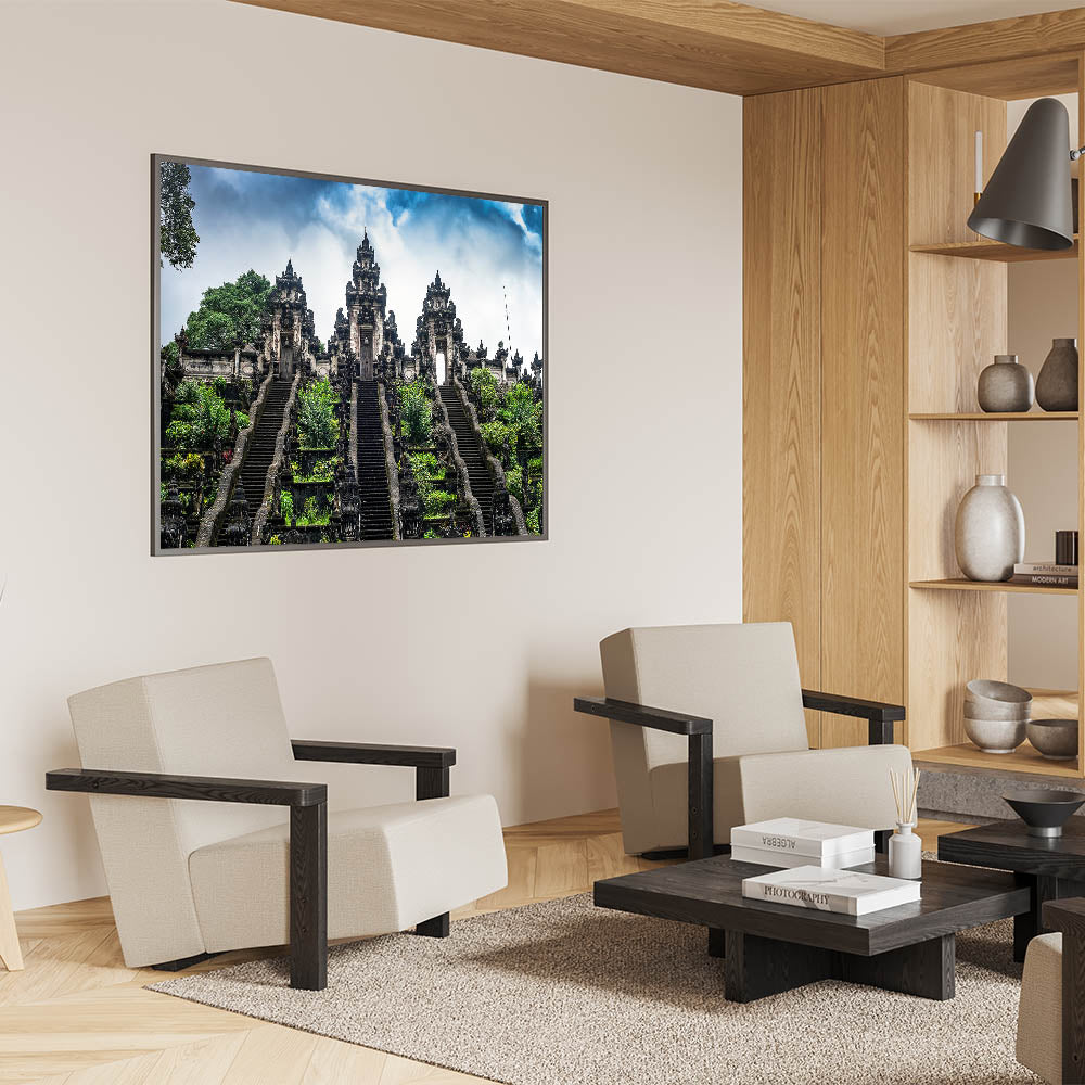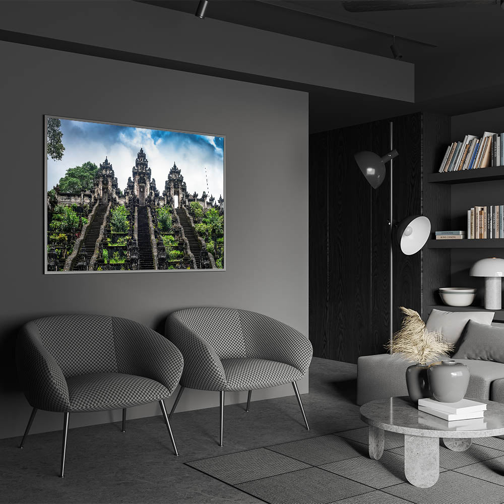 Transport yourself to the sacred temples of Indonesia with this captivating wall art, featuring an ancient stone stairway leading up to a majestic temple. Surrounded by lush greenery and framed by a dramatic sky, the detailed carvings and grand architecture reflect the spiritual and historical depth of Indonesia. This artwork perfectly captures the serene beauty and cultural significance of Indonesian temple sites, making it an exceptional addition to any space.