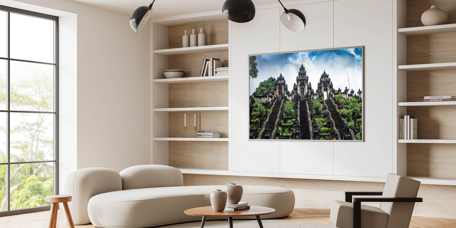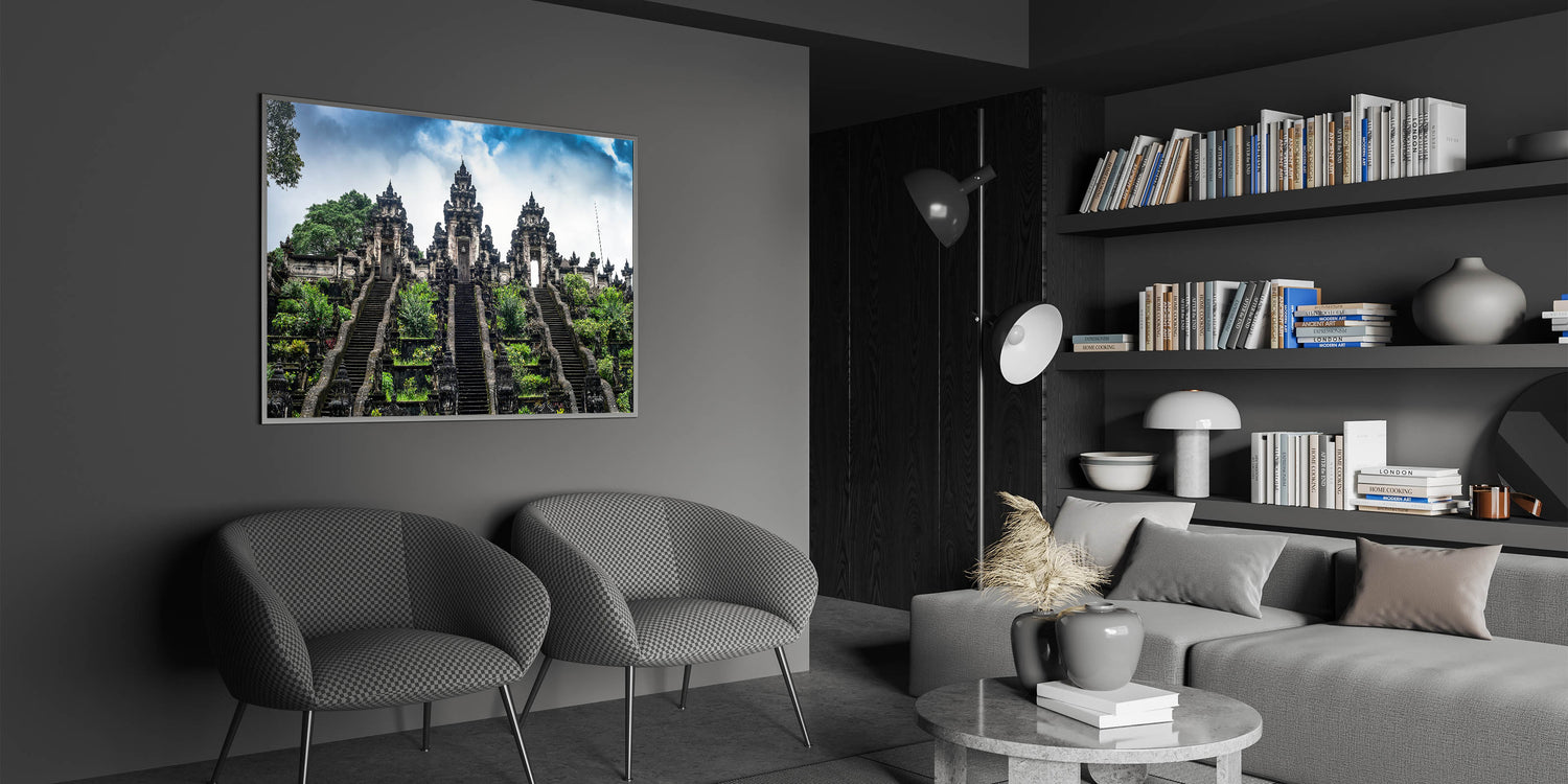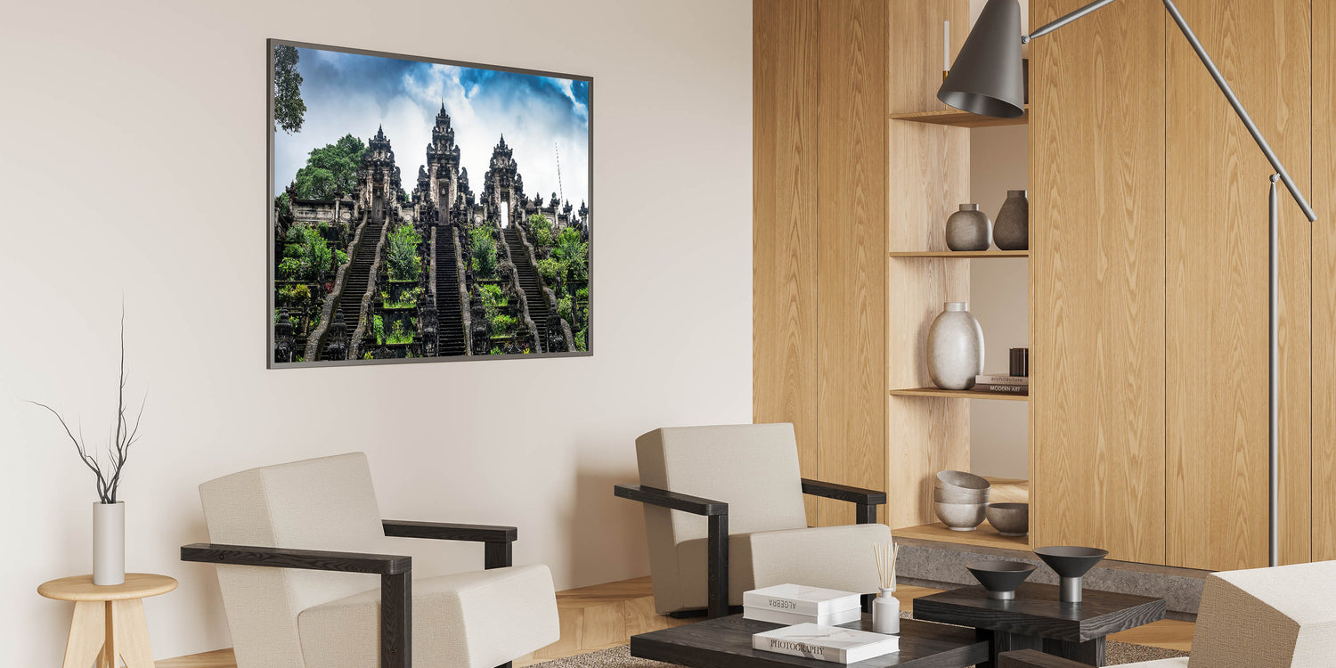 Transport yourself to the sacred temples of Indonesia with this captivating wall art, featuring an ancient stone stairway leading up to a majestic temple. Surrounded by lush greenery and framed by a dramatic sky, the detailed carvings and grand architecture reflect the spiritual and historical depth of Indonesia. This artwork perfectly captures the serene beauty and cultural significance of Indonesian temple sites, making it an exceptional addition to any space.