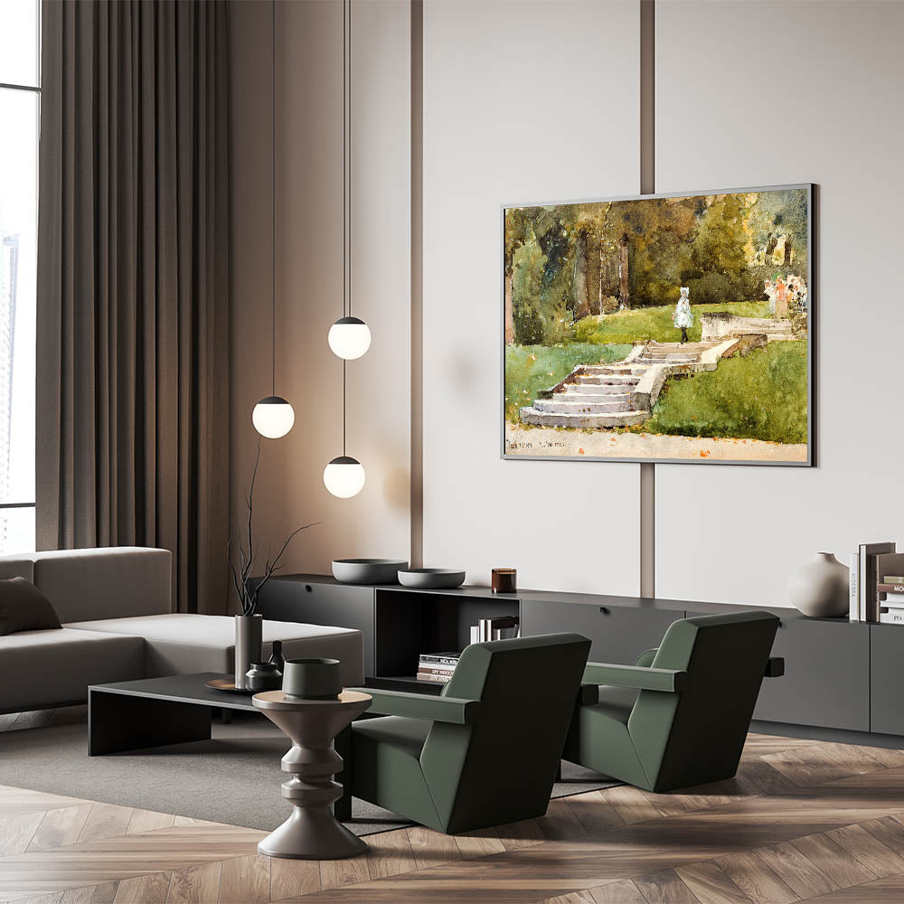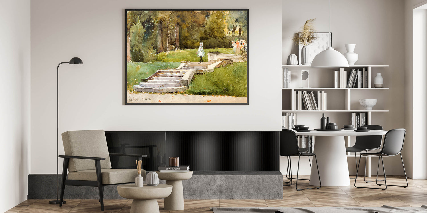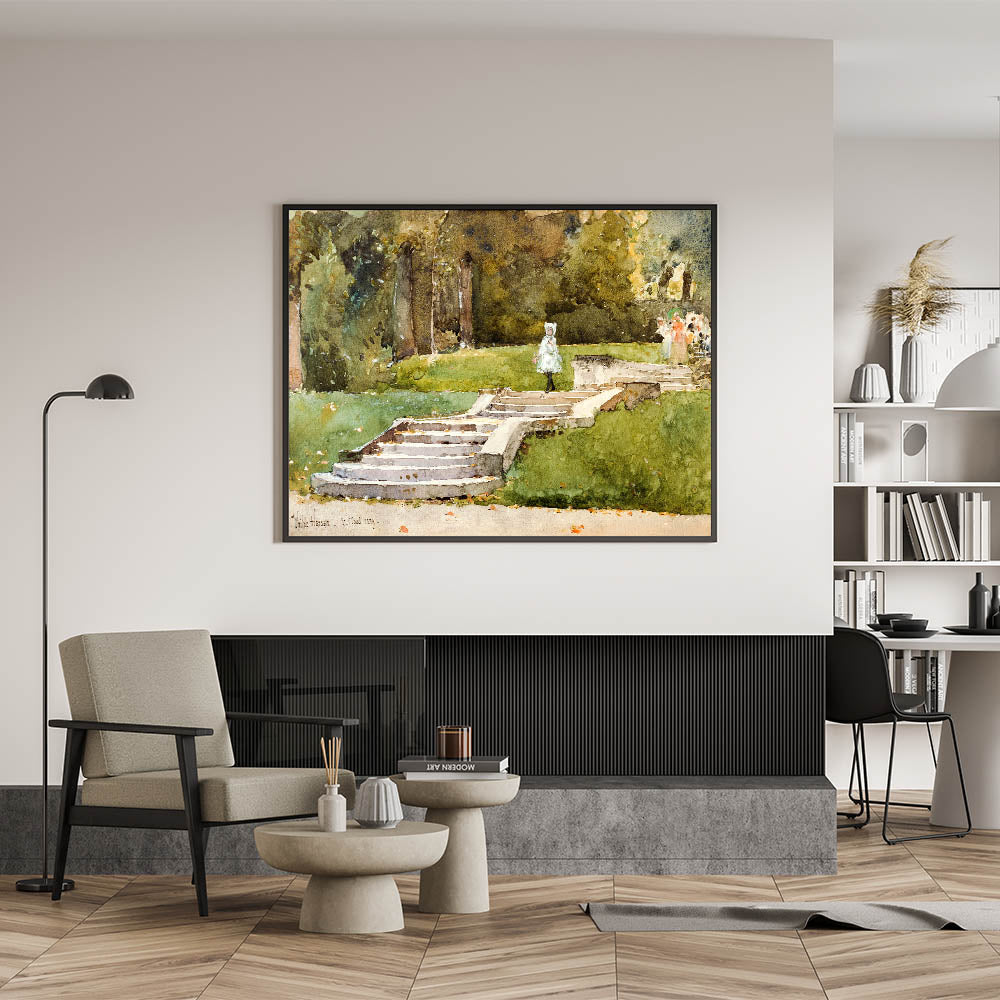Infuse your home with the tranquil beauty of Childe Hassam’s "Saint-Cloud" (1889), a delightful Impressionist garden scene. This artwork captures the charm of a peaceful park, featuring lush green trees, dappled sunlight, and a small figure in elegant attire ascending the stone steps. Hassam’s masterful use of light and delicate brushwork invites viewers into this serene moment.
