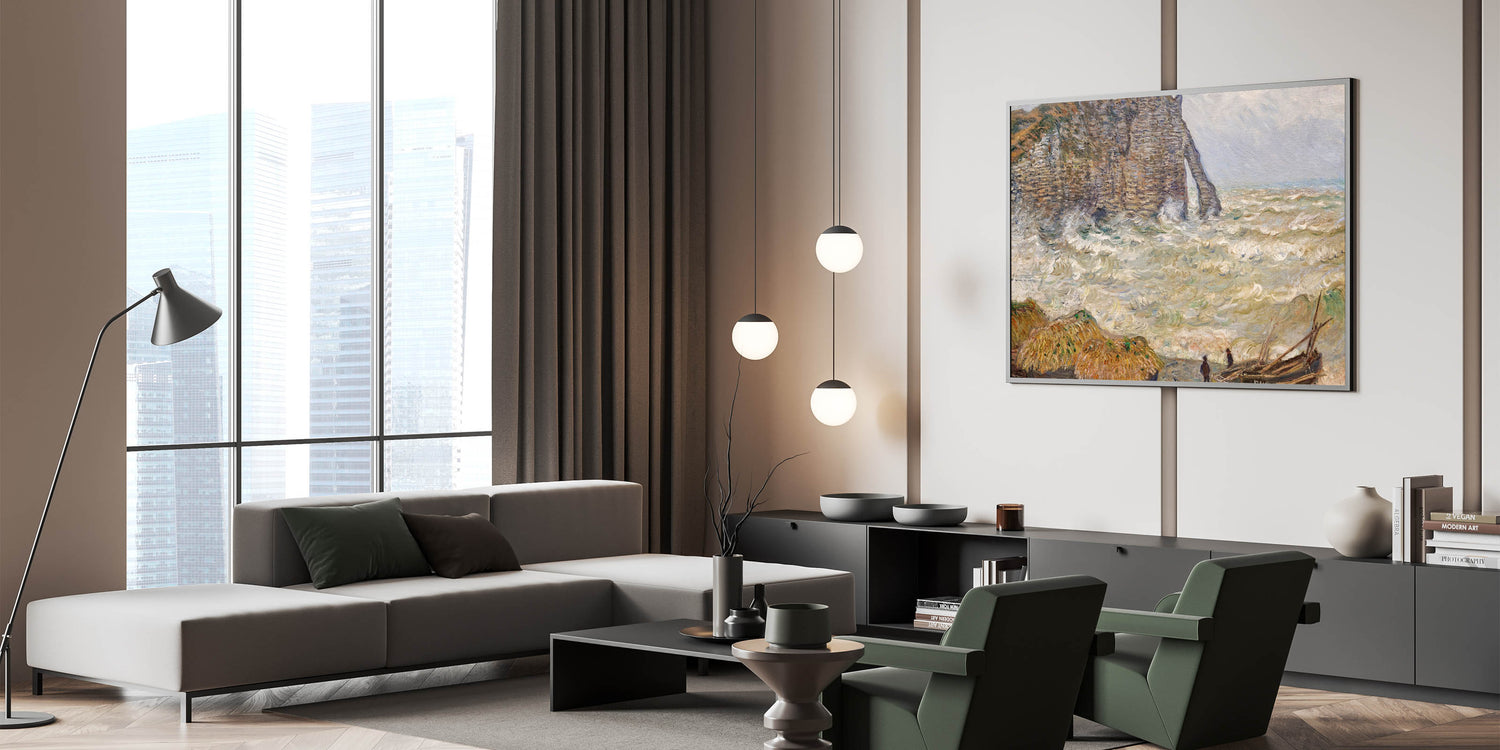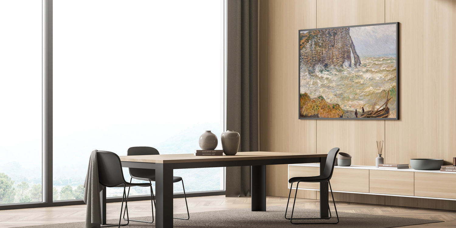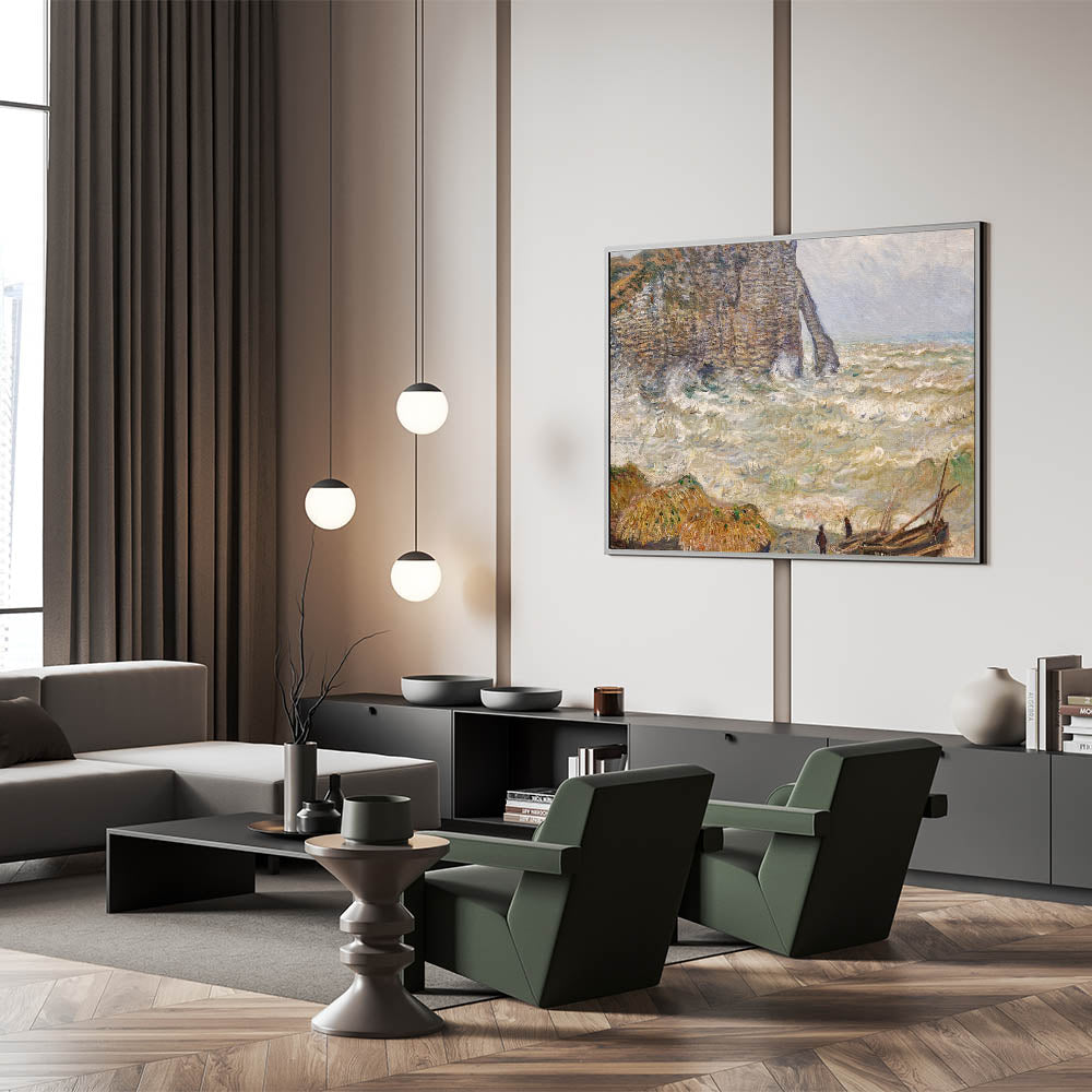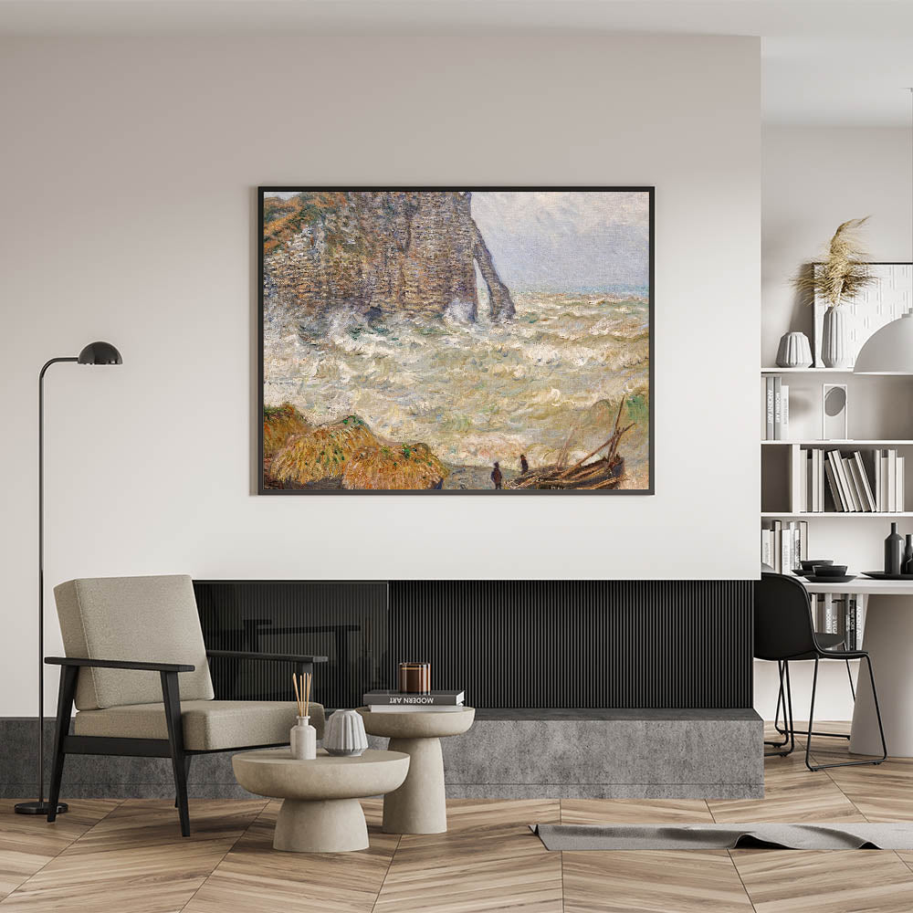 Experience the raw power of nature with this Impressionist wall art inspired by Claude Monet's Stormy Sea in Étretat. This painting captures the dramatic cliffs of Étretat on a windy day, with crashing waves and turbulent skies reflecting the untamed energy of the sea. Monet’s dynamic brushstrokes and earthy tones create a striking sense of movement, making this artwork a bold statement piece.