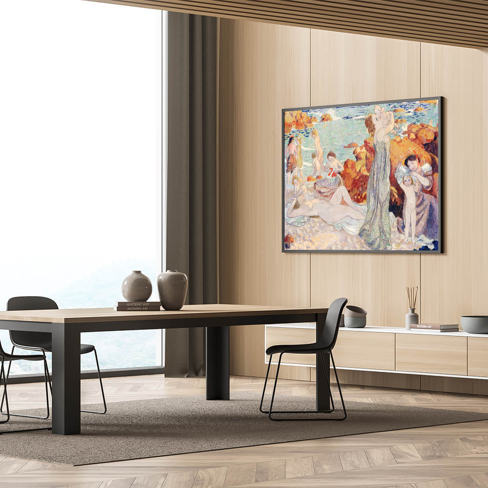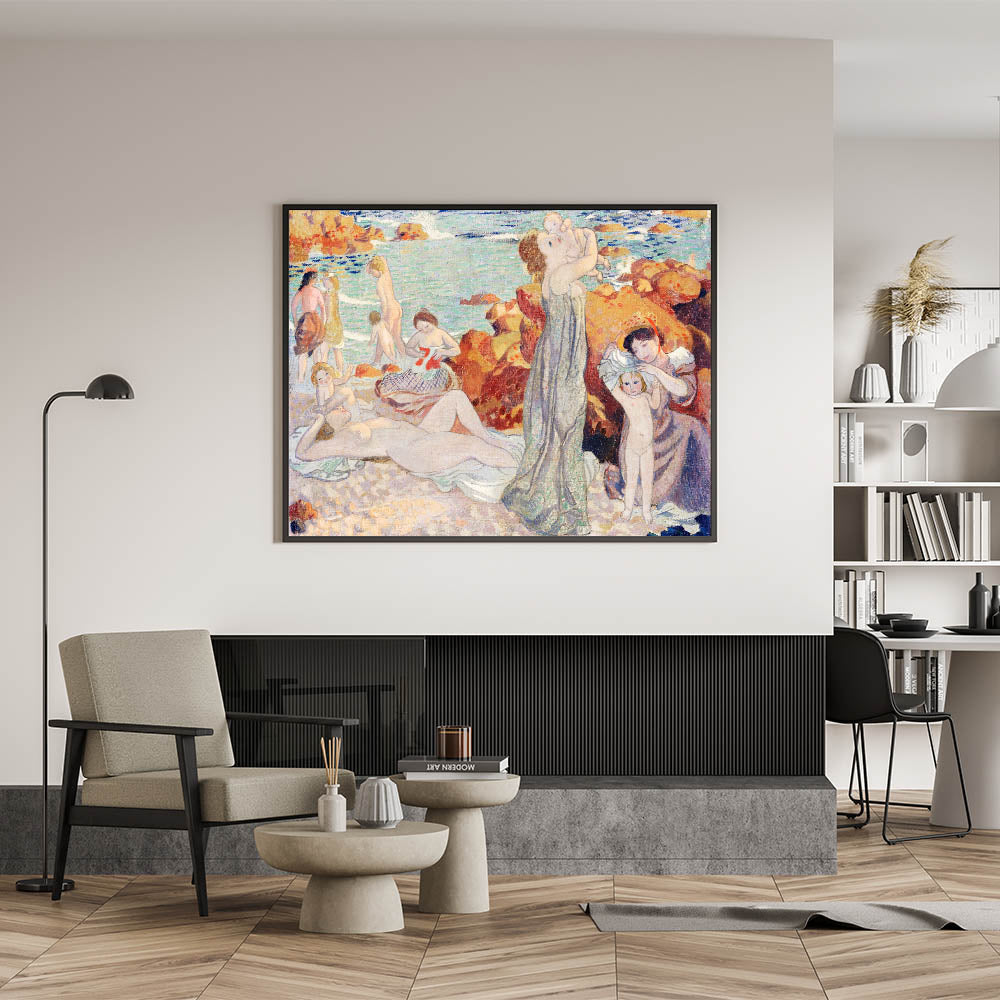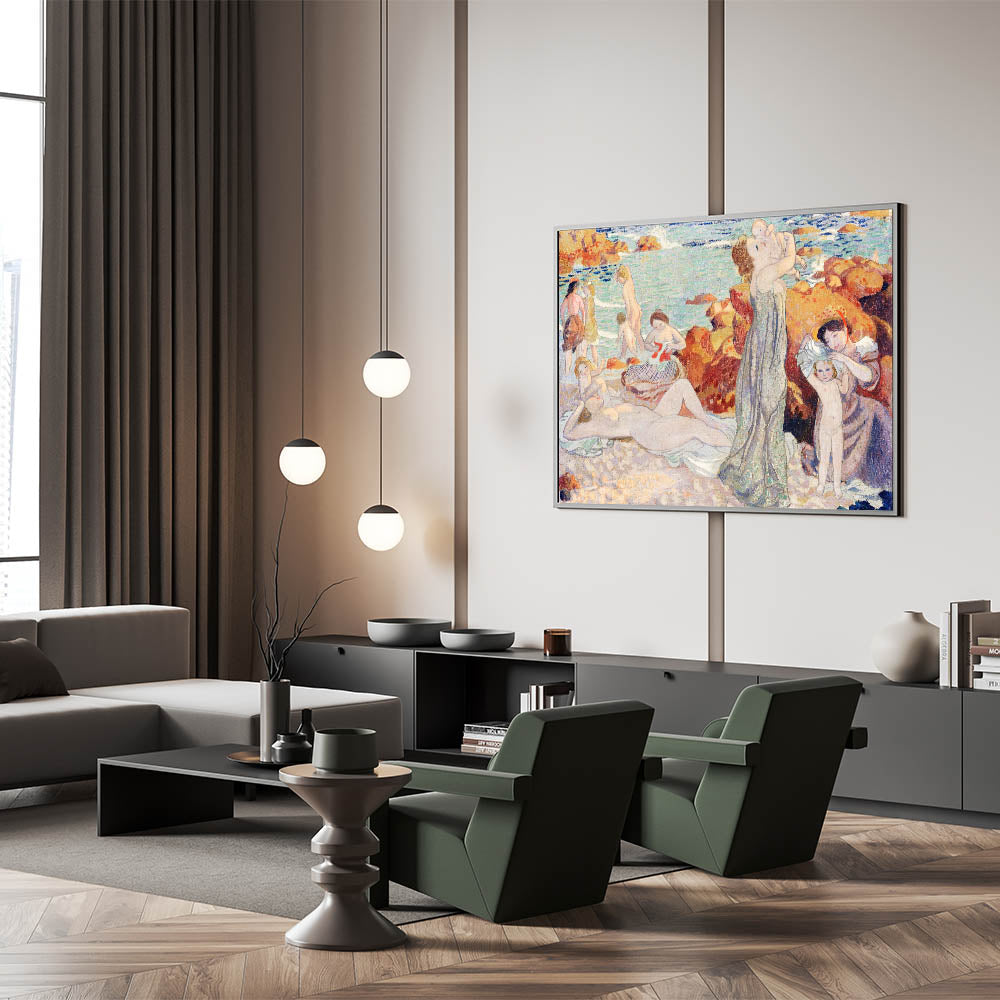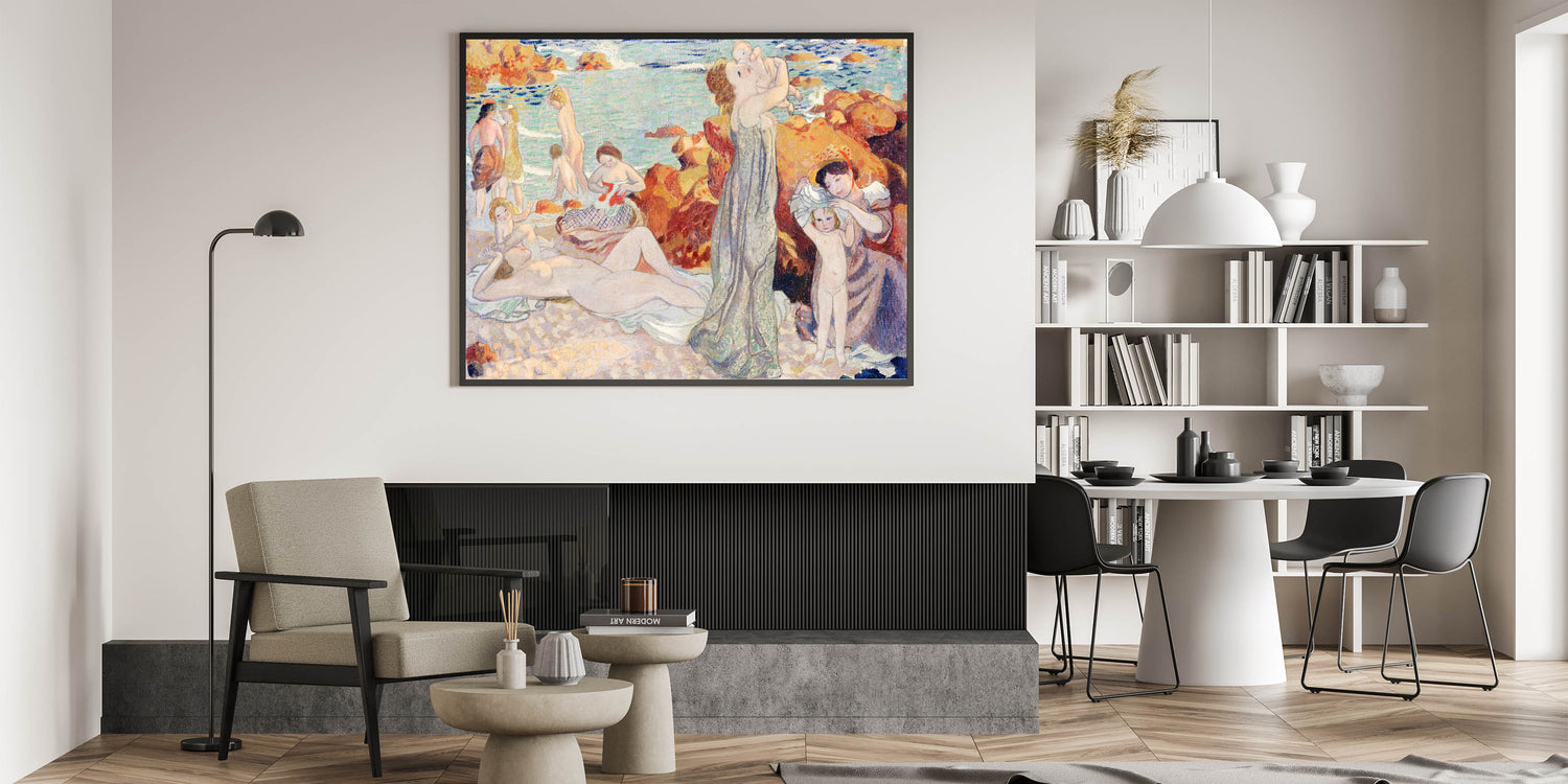 - Tranquil Coastal Scene: A lively depiction of bathers on the shore, set against the backdrop of the sea with vibrant colors.