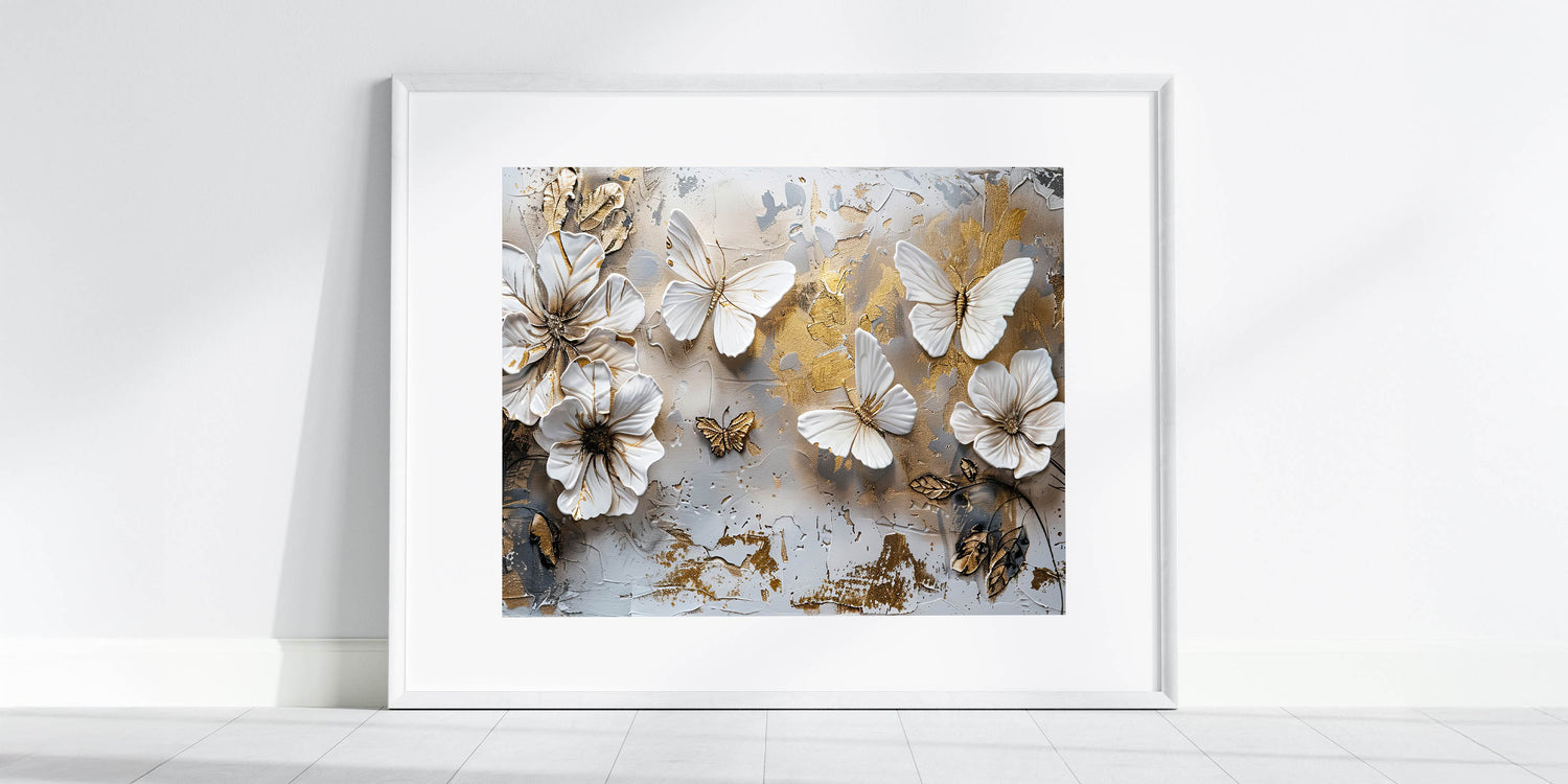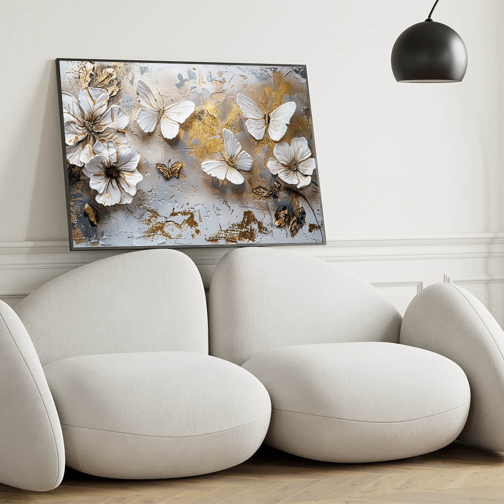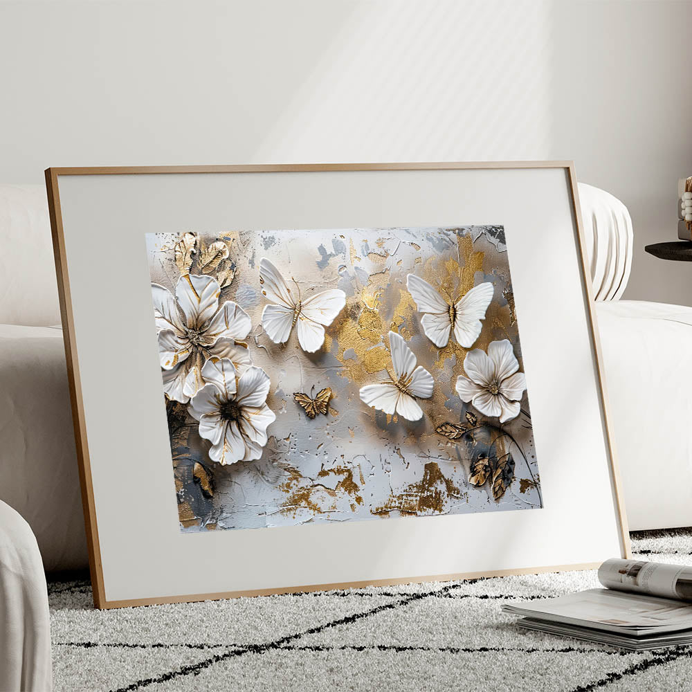 Transform your space with the timeless elegance of this Golden Butterfly & Floral Wall Art. This exquisite artwork features delicately sculpted butterflies and flowers, set against a textured background with subtle gold accents. The harmonious blend of white, beige, and gold tones makes this piece a stunning focal point for any room, from the living room to the bedroom or even a stylish office space.