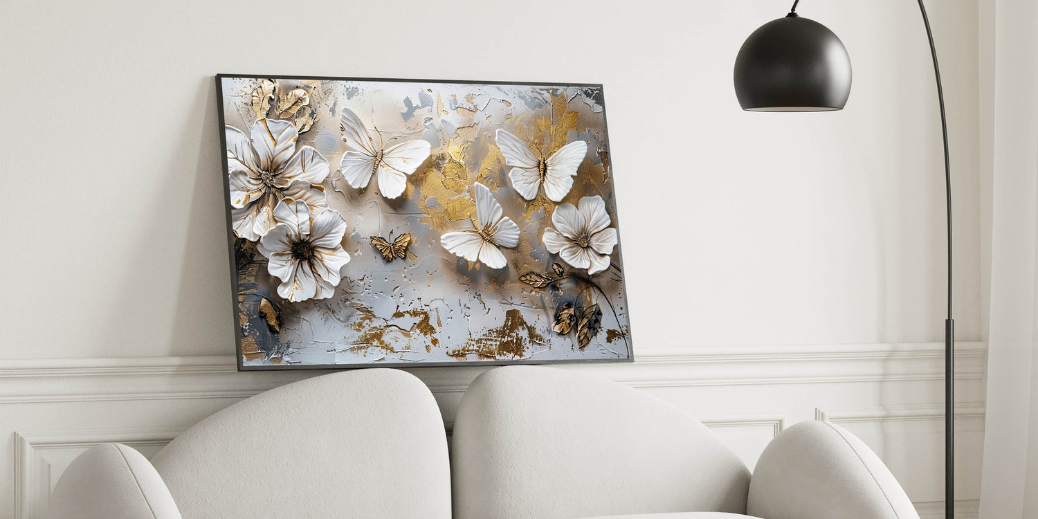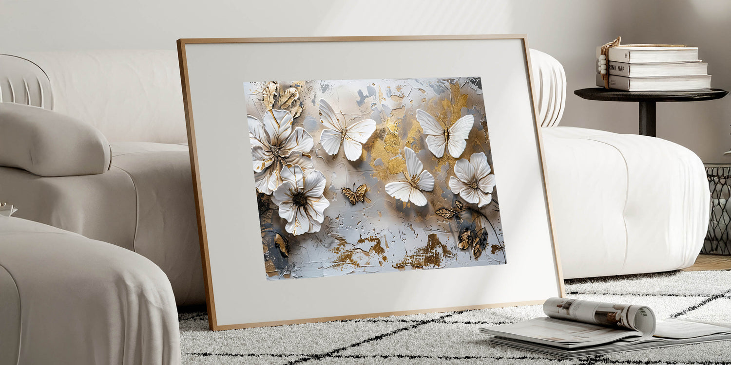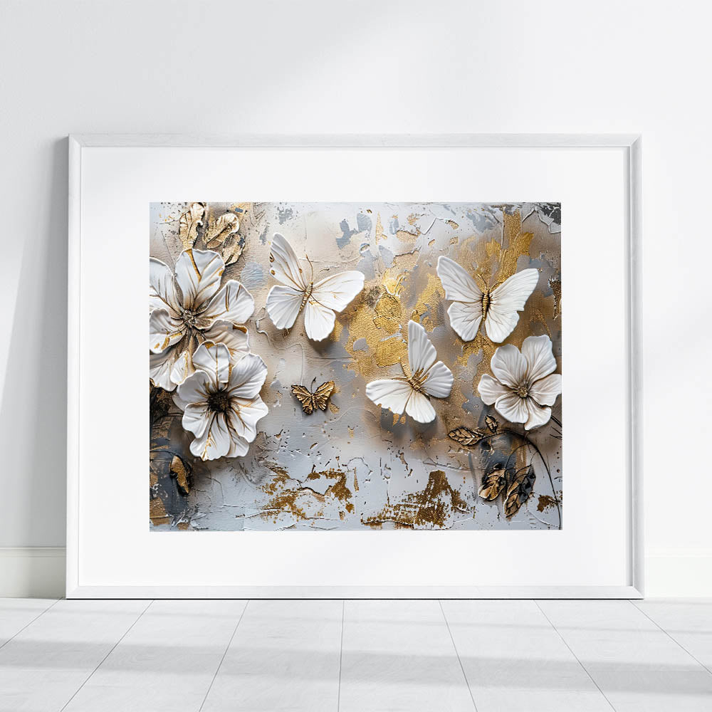 Transform your space with the timeless elegance of this Golden Butterfly & Floral Wall Art. This exquisite artwork features delicately sculpted butterflies and flowers, set against a textured background with subtle gold accents. The harmonious blend of white, beige, and gold tones makes this piece a stunning focal point for any room, from the living room to the bedroom or even a stylish office space.