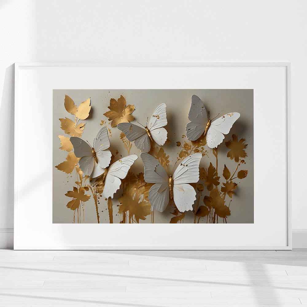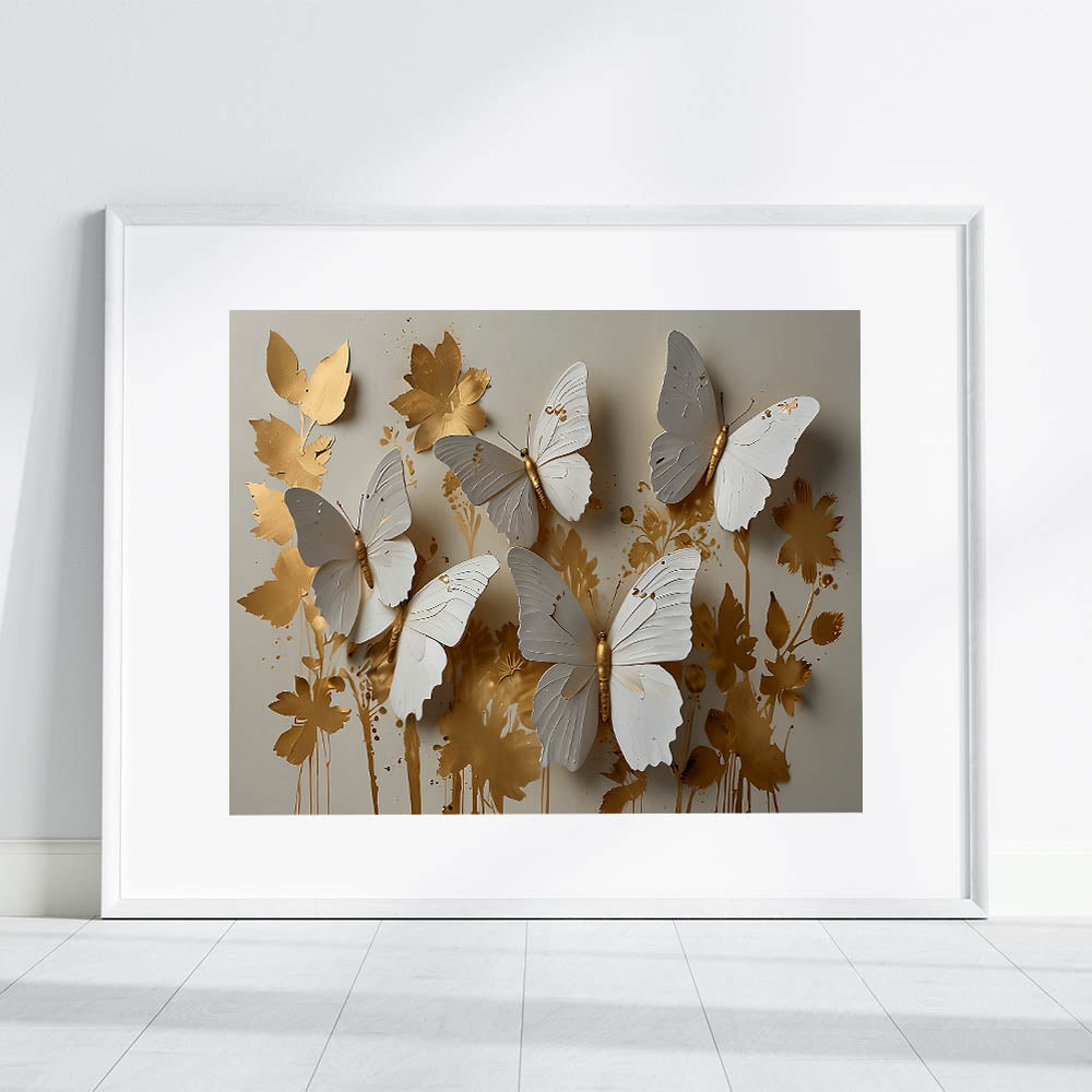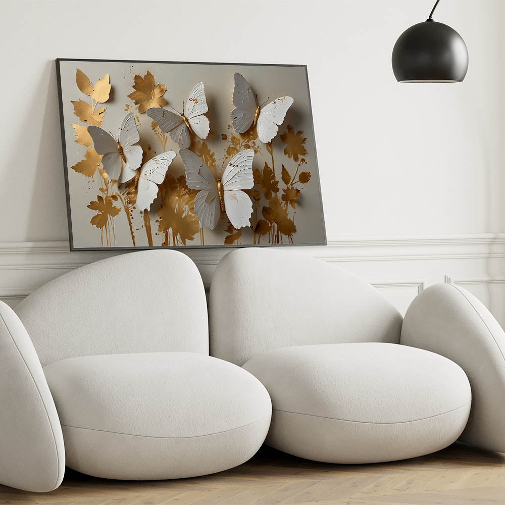 Elevate your home décor with this exquisite Golden Elegance Butterfly Wall Art. This luxurious artwork features a stunning combination of gold and white tones, with intricately detailed butterflies fluttering amidst golden leaves. Perfect for adding a touch of opulence to any space, this Butterfly Canvas Print is an ideal choice for those who appreciate refined and sophisticated design.
