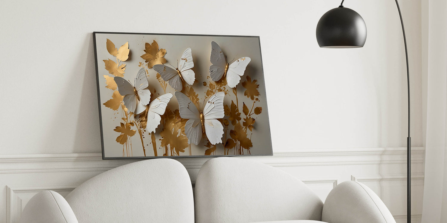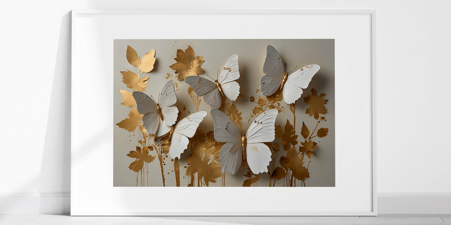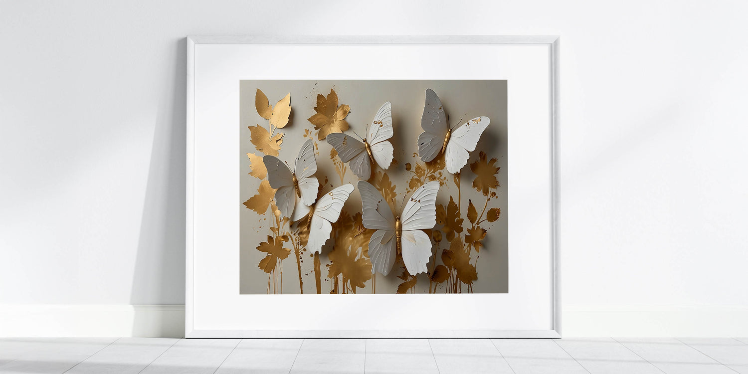 Elevate your home décor with this exquisite Golden Elegance Butterfly Wall Art. This luxurious artwork features a stunning combination of gold and white tones, with intricately detailed butterflies fluttering amidst golden leaves. Perfect for adding a touch of opulence to any space, this Butterfly Canvas Print is an ideal choice for those who appreciate refined and sophisticated design.