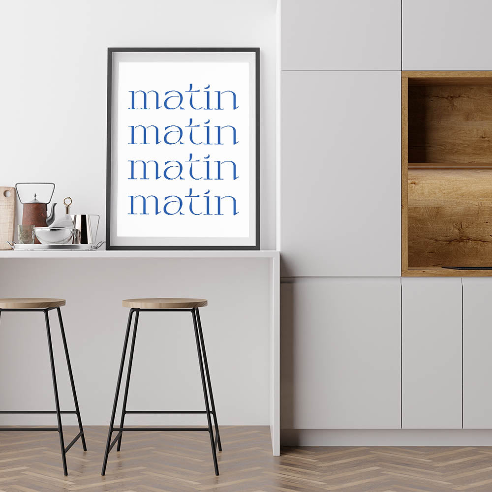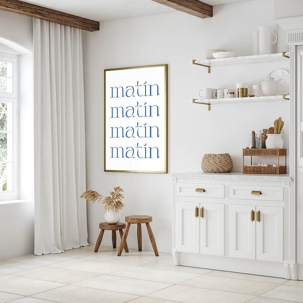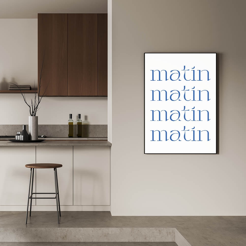 Start your day with elegance and simplicity with this Inspirational Kitchen Print featuring the repeated French word "Matin" (Morning). This minimalist design, with clean blue typography on a crisp white background, embodies the tranquility and energy of a fresh start. Perfect for coffee stations, breakfast nooks, or kitchen walls, this artwork brings a touch of Parisian charm to any space.