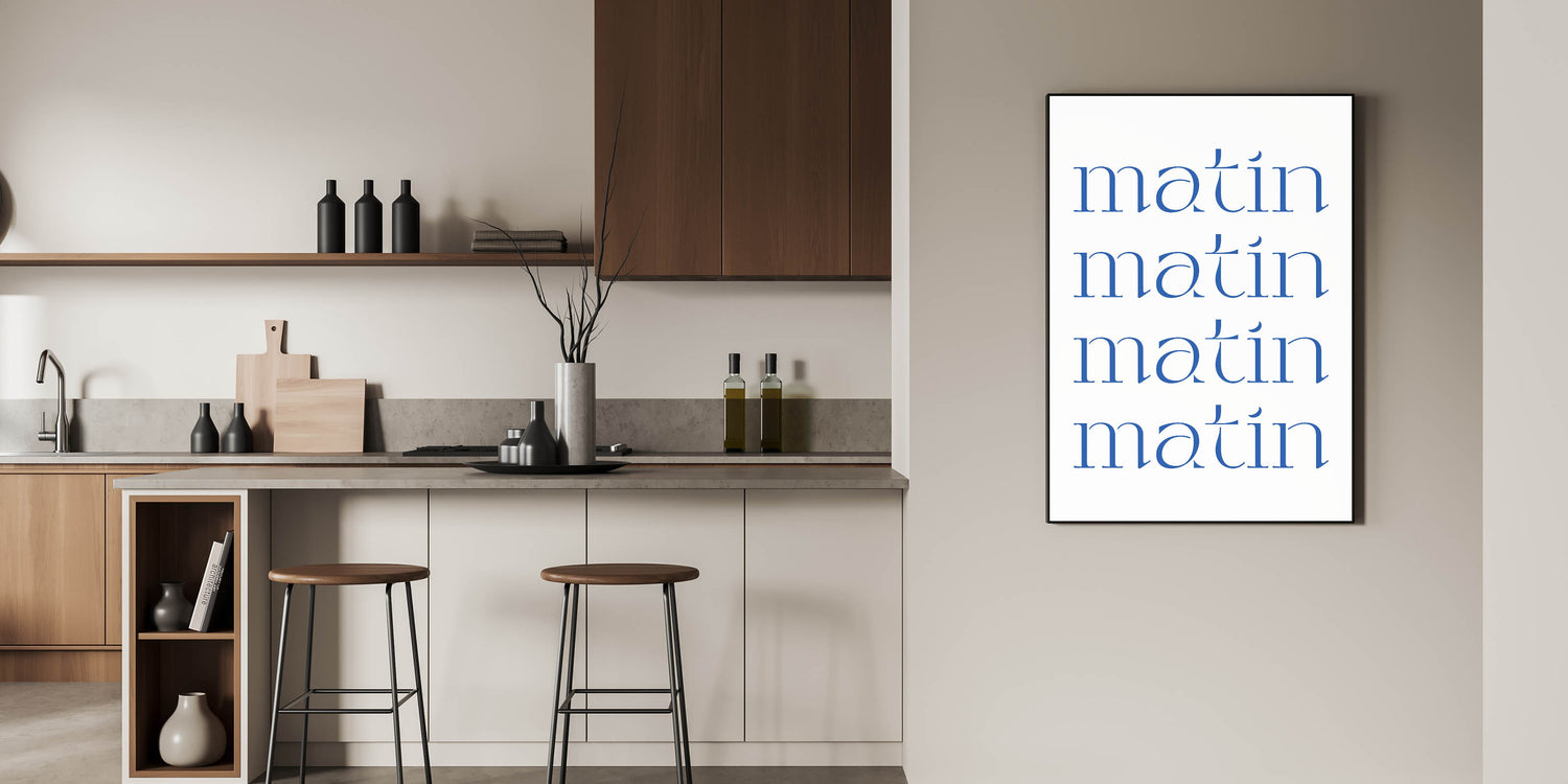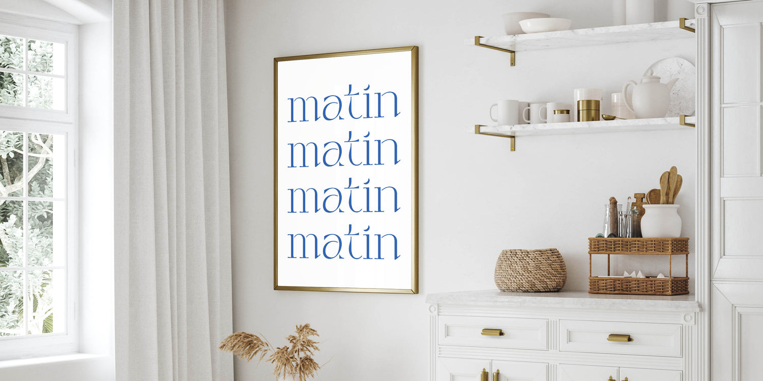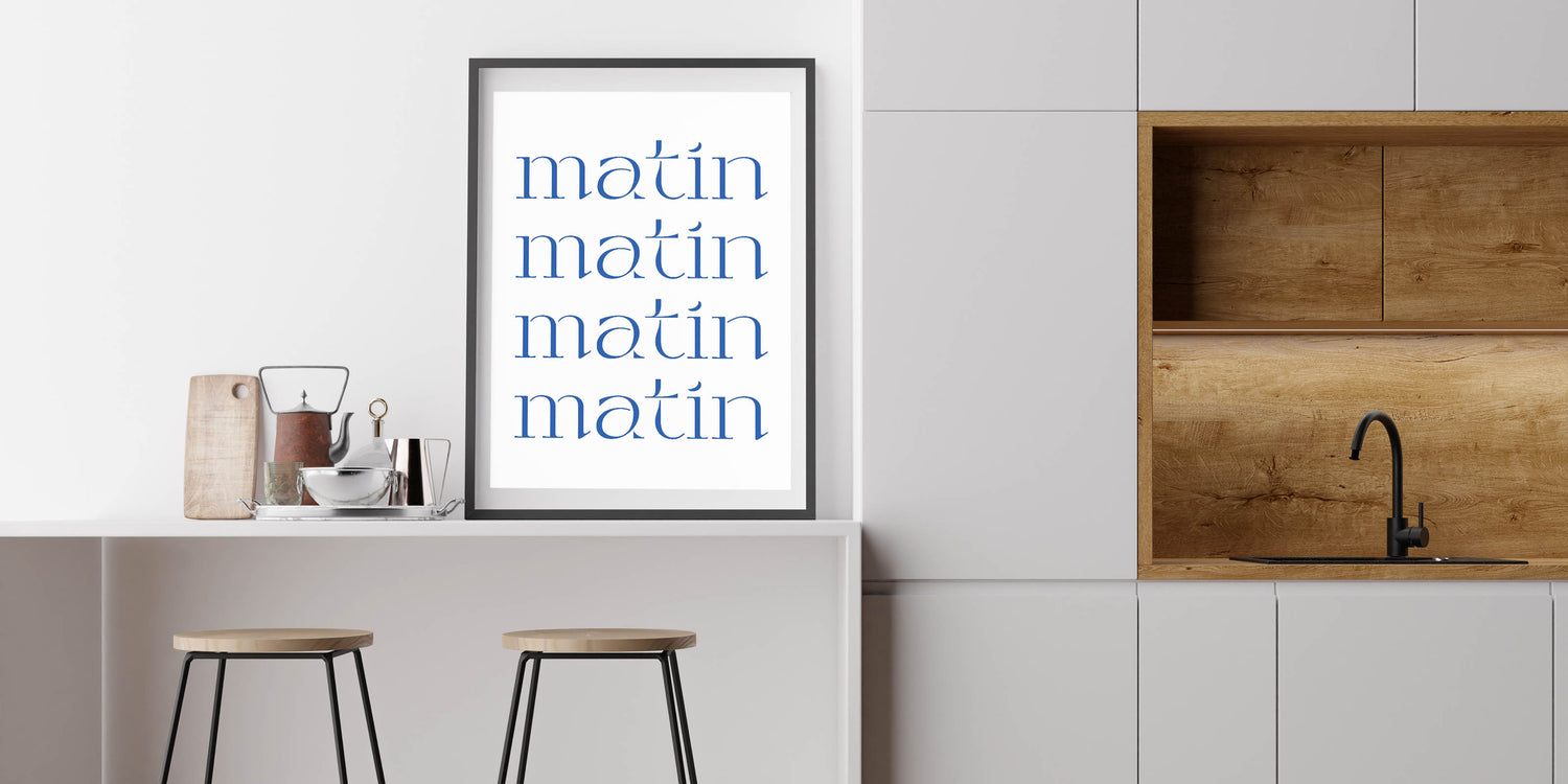 Start your day with elegance and simplicity with this Inspirational Kitchen Print featuring the repeated French word "Matin" (Morning). This minimalist design, with clean blue typography on a crisp white background, embodies the tranquility and energy of a fresh start. Perfect for coffee stations, breakfast nooks, or kitchen walls, this artwork brings a touch of Parisian charm to any space.
