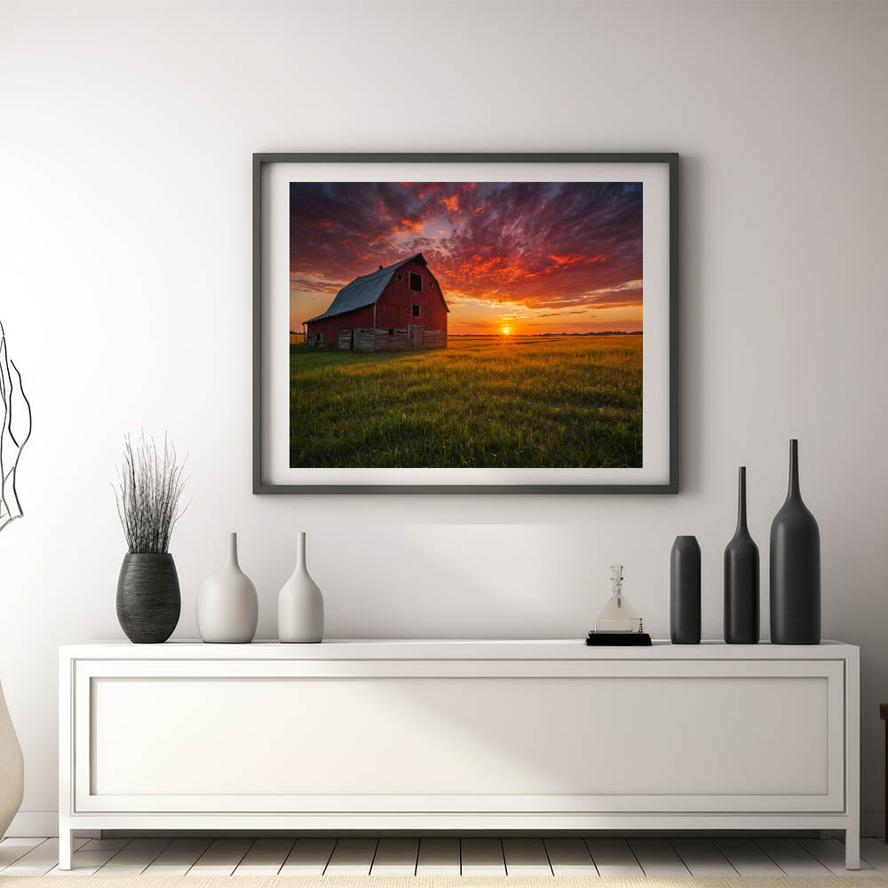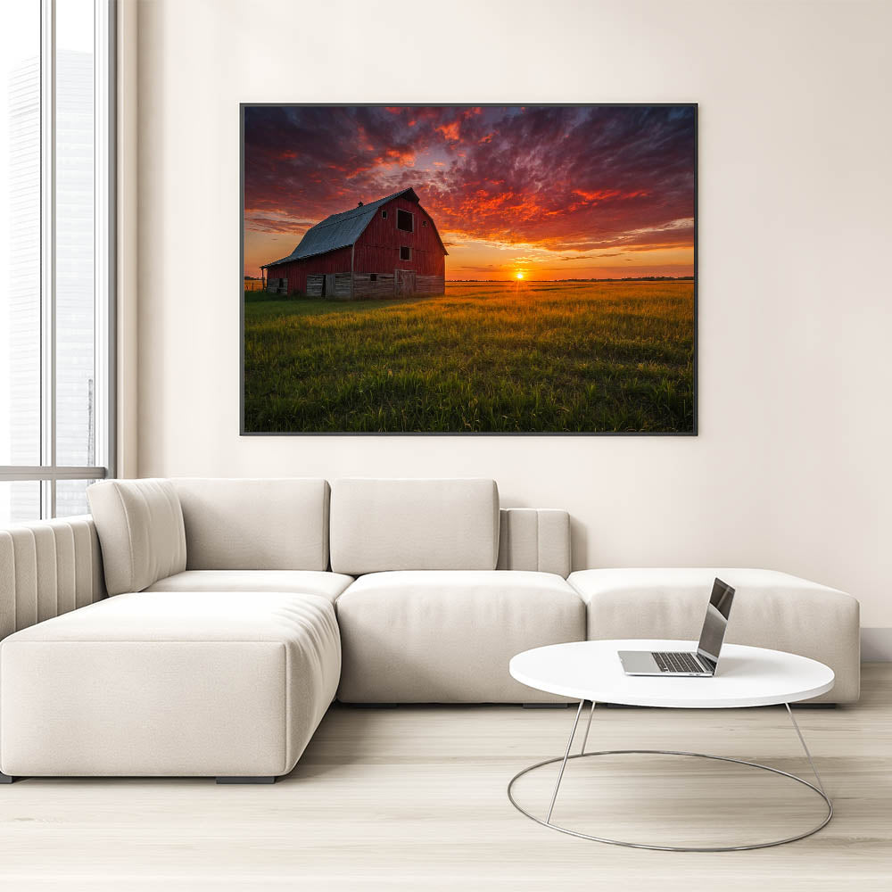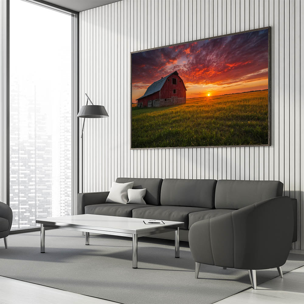 Capture the heart of rural Iowa with this stunning wall art featuring a red barn against a brilliant sunset. The vivid colors of the sky blend beautifully with the golden fields and rustic barn, creating a serene and timeless scene that perfectly embodies the peacefulness of the Midwest. This piece is ideal for bringing a touch of the countryside into your home decor.