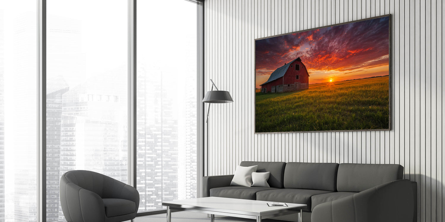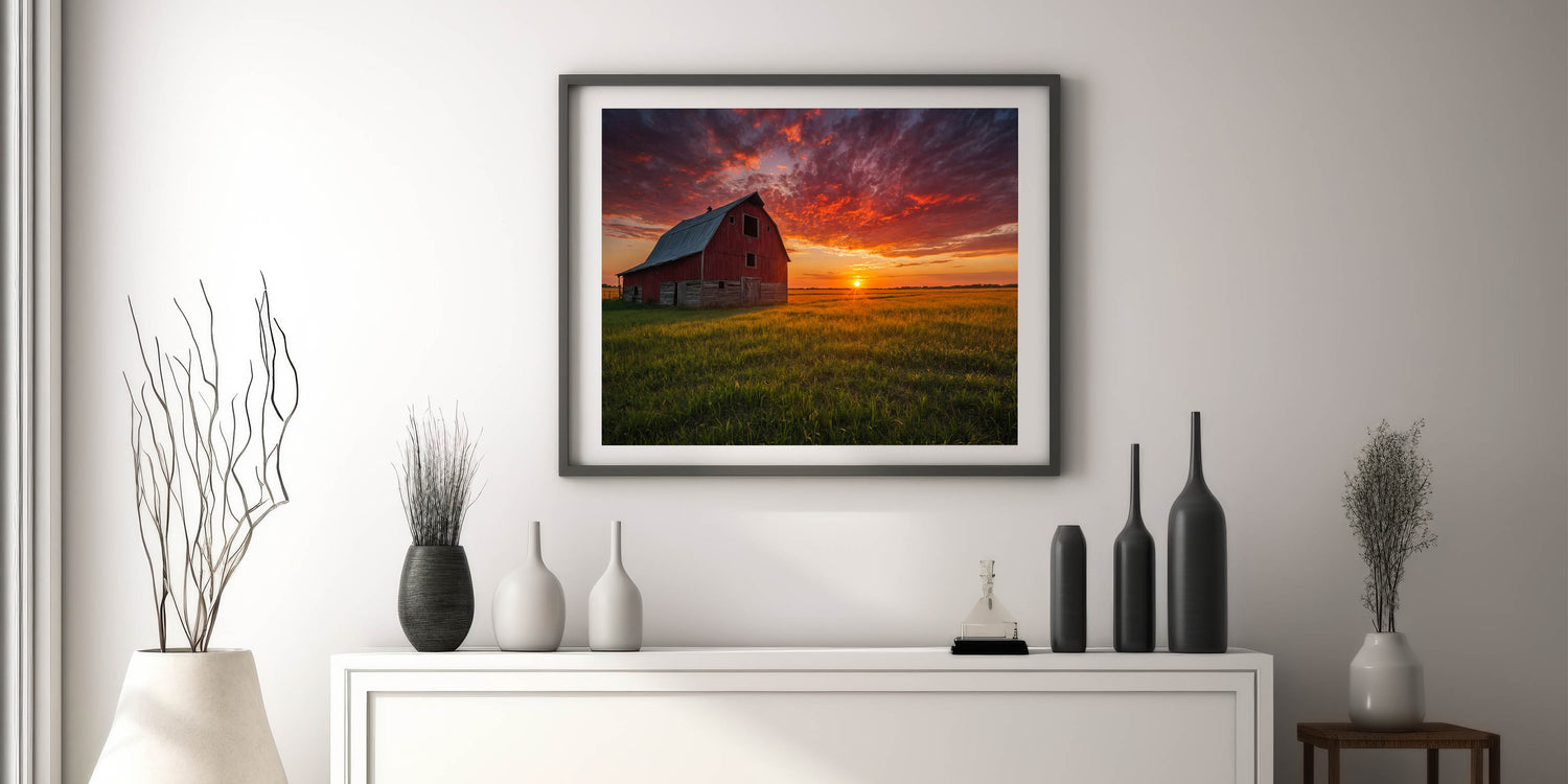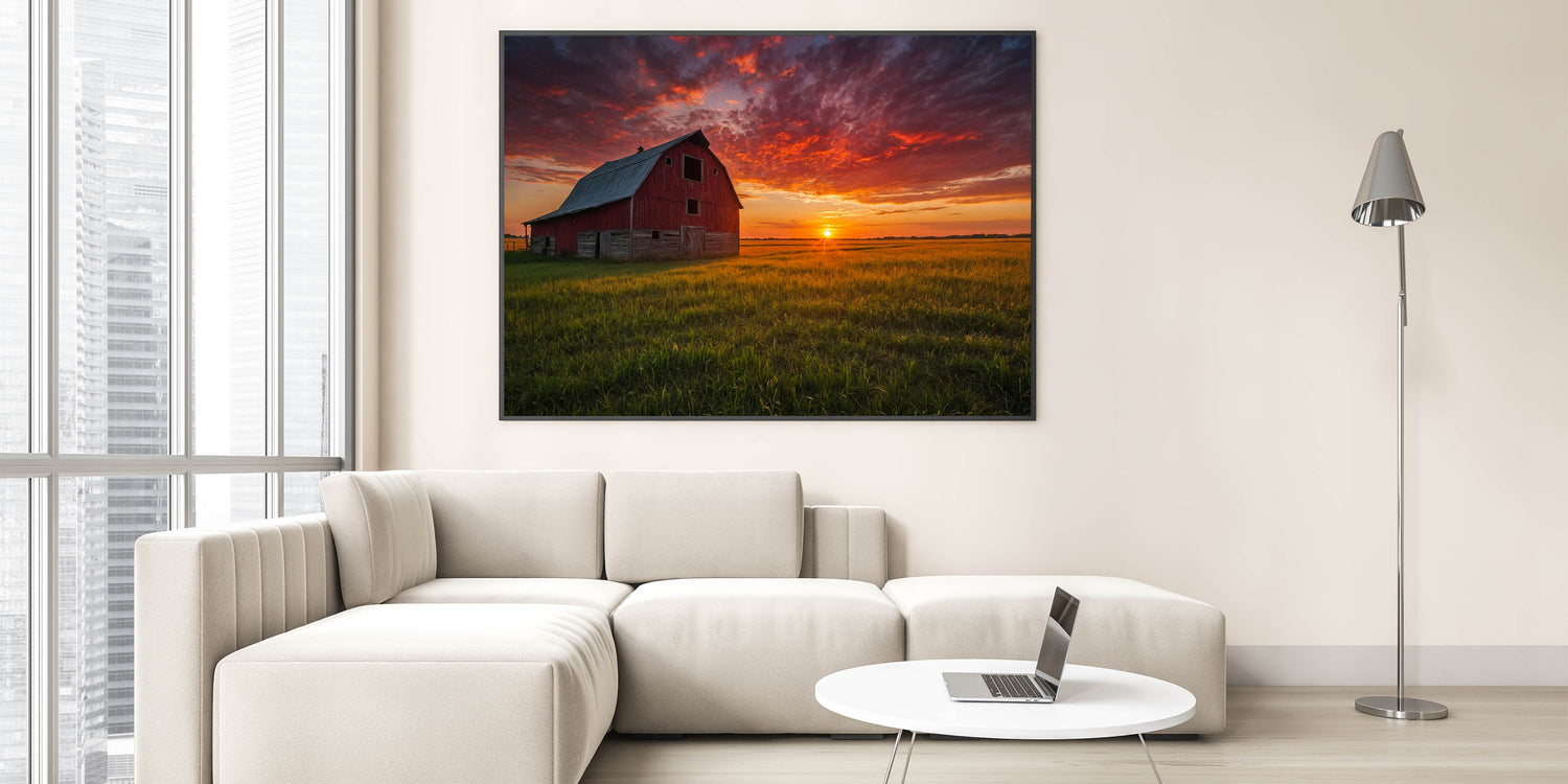 Capture the heart of rural Iowa with this stunning wall art featuring a red barn against a brilliant sunset. The vivid colors of the sky blend beautifully with the golden fields and rustic barn, creating a serene and timeless scene that perfectly embodies the peacefulness of the Midwest. This piece is ideal for bringing a touch of the countryside into your home decor.