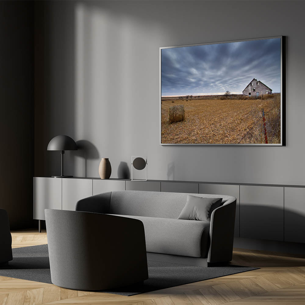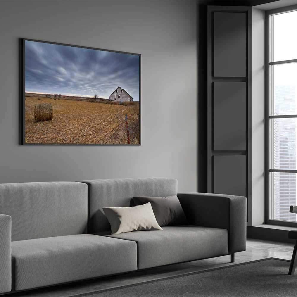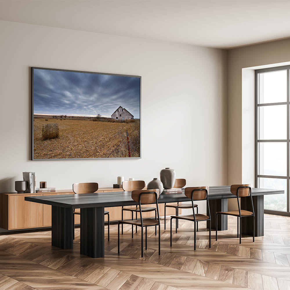 Embrace the rustic charm of Iowa’s countryside with this stunning piece of Iowa Wall Art. Featuring an old, weathered barn and hay bales scattered across a golden field under a moody sky, this artwork perfectly captures the essence of Iowa rural scenery. It’s the ideal piece for anyone looking to add a touch of Iowa home decor that reflects the state’s agricultural roots and natural beauty. Available in multiple formats, including stretched canvas, framed prints, and acrylic glass, this artwork is sure to elevate your space.