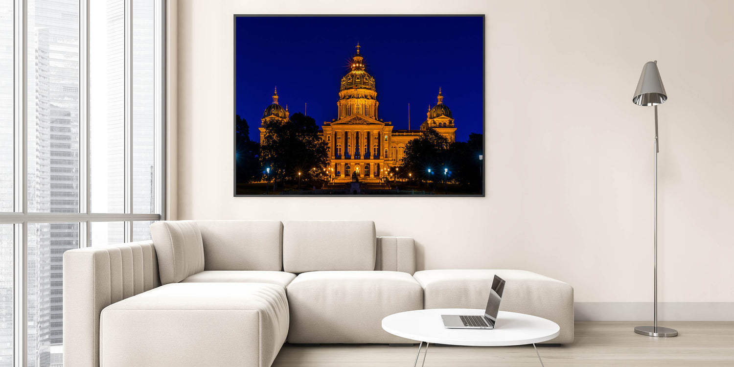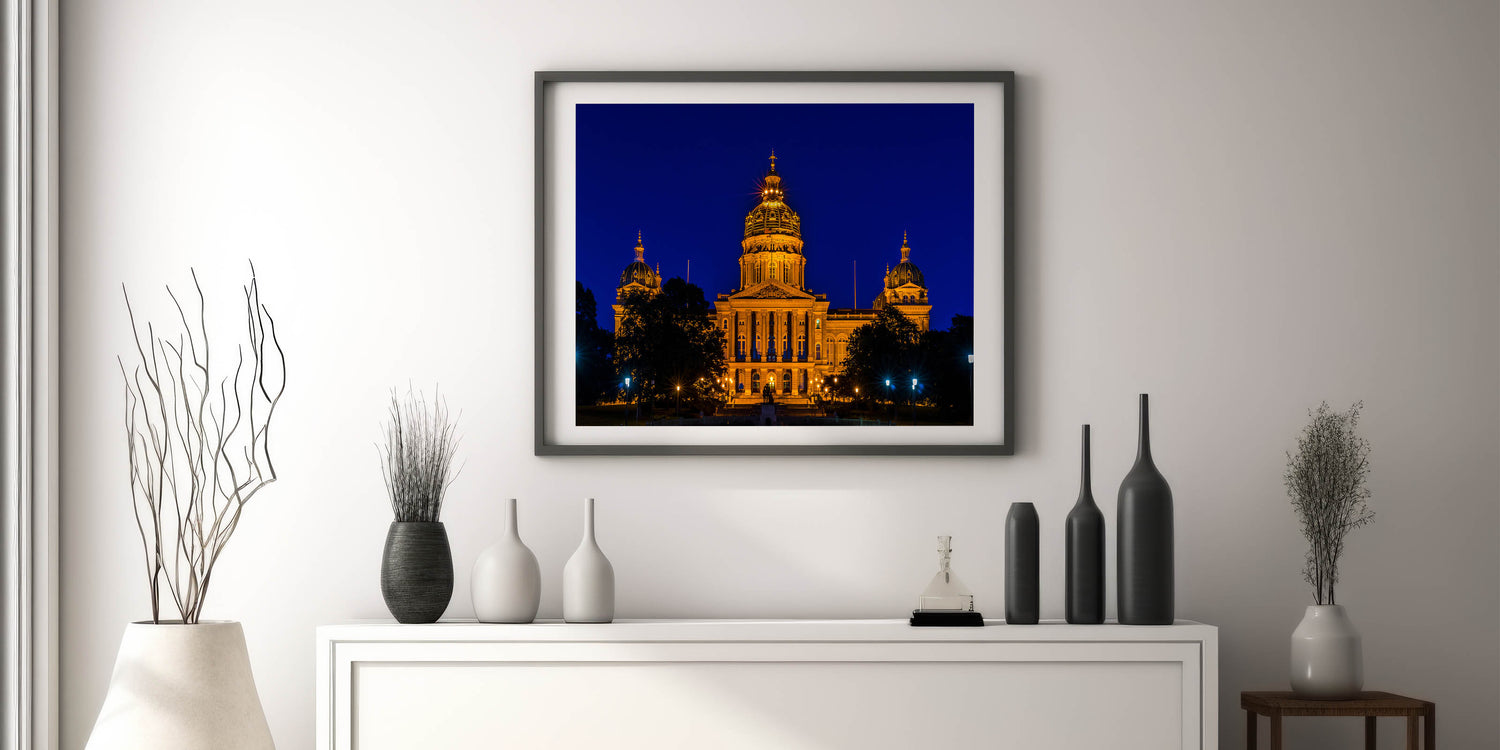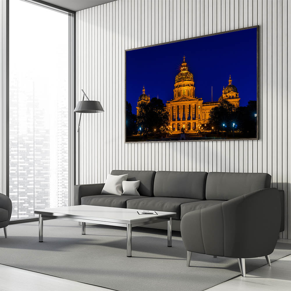 Celebrate the architectural beauty of Iowa’s State Capitol with this stunning Iowa Wall Art. Captured at night with the Capitol building glowing under a deep blue sky, this Iowa photography art showcases the grandeur and elegance of one of Iowa’s most iconic landmarks. Perfect for adding a sophisticated, historical touch to any room, this piece is available in various formats, including stretched canvas, framed prints, and acrylic glass.