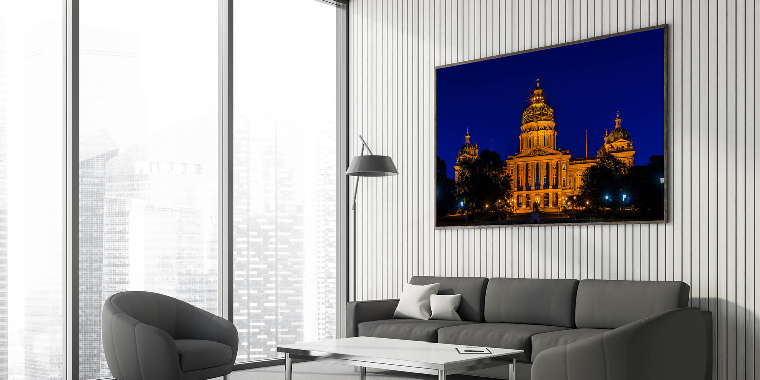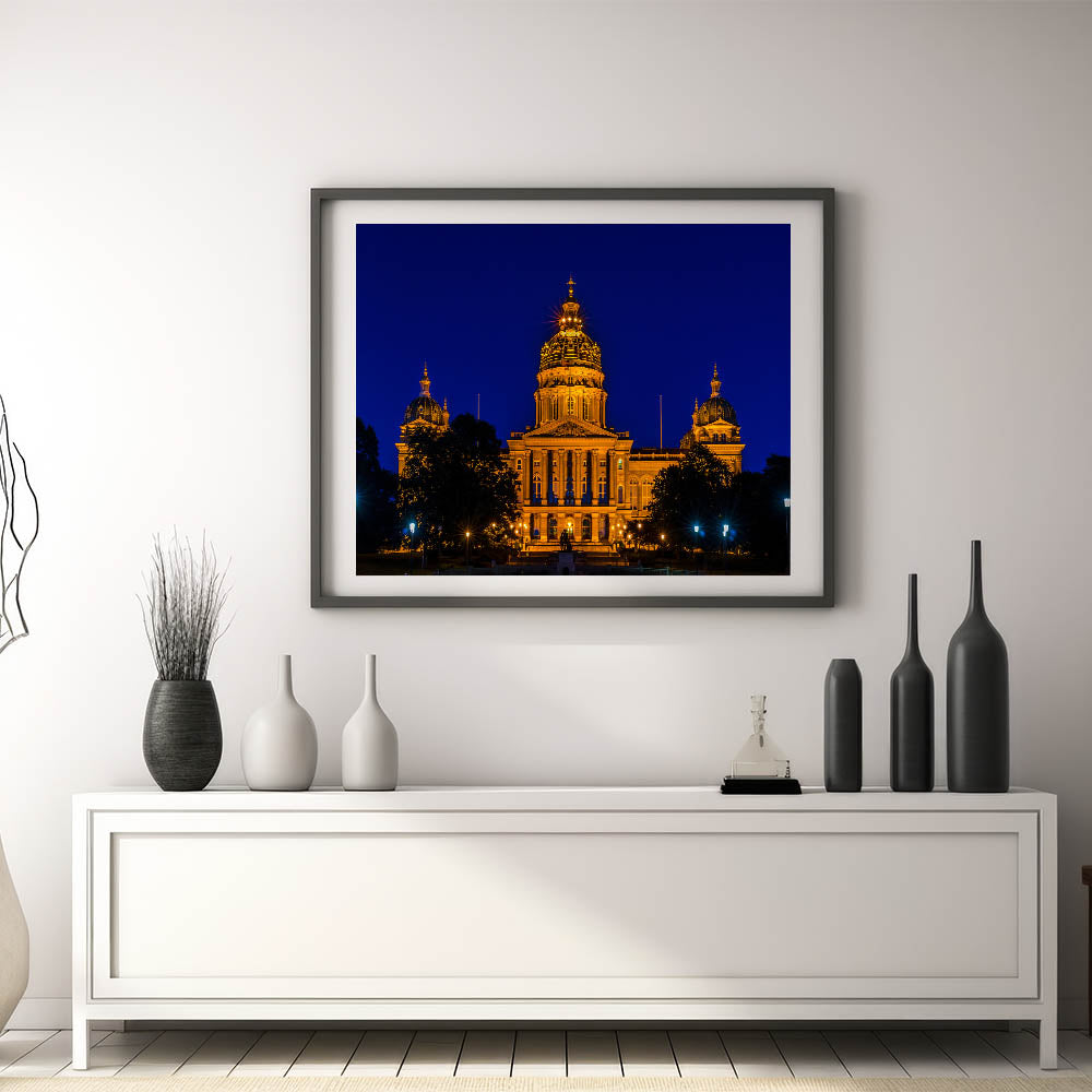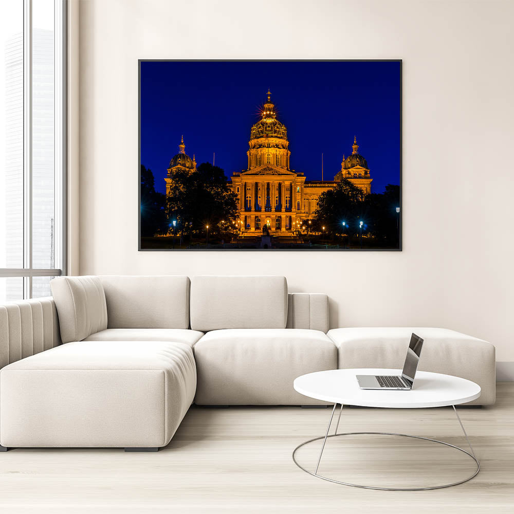 Celebrate the architectural beauty of Iowa’s State Capitol with this stunning Iowa Wall Art. Captured at night with the Capitol building glowing under a deep blue sky, this Iowa photography art showcases the grandeur and elegance of one of Iowa’s most iconic landmarks. Perfect for adding a sophisticated, historical touch to any room, this piece is available in various formats, including stretched canvas, framed prints, and acrylic glass.