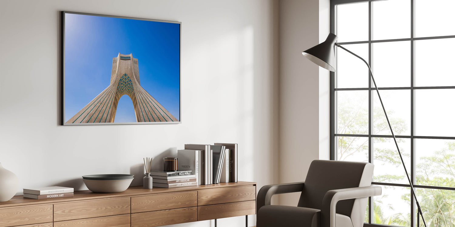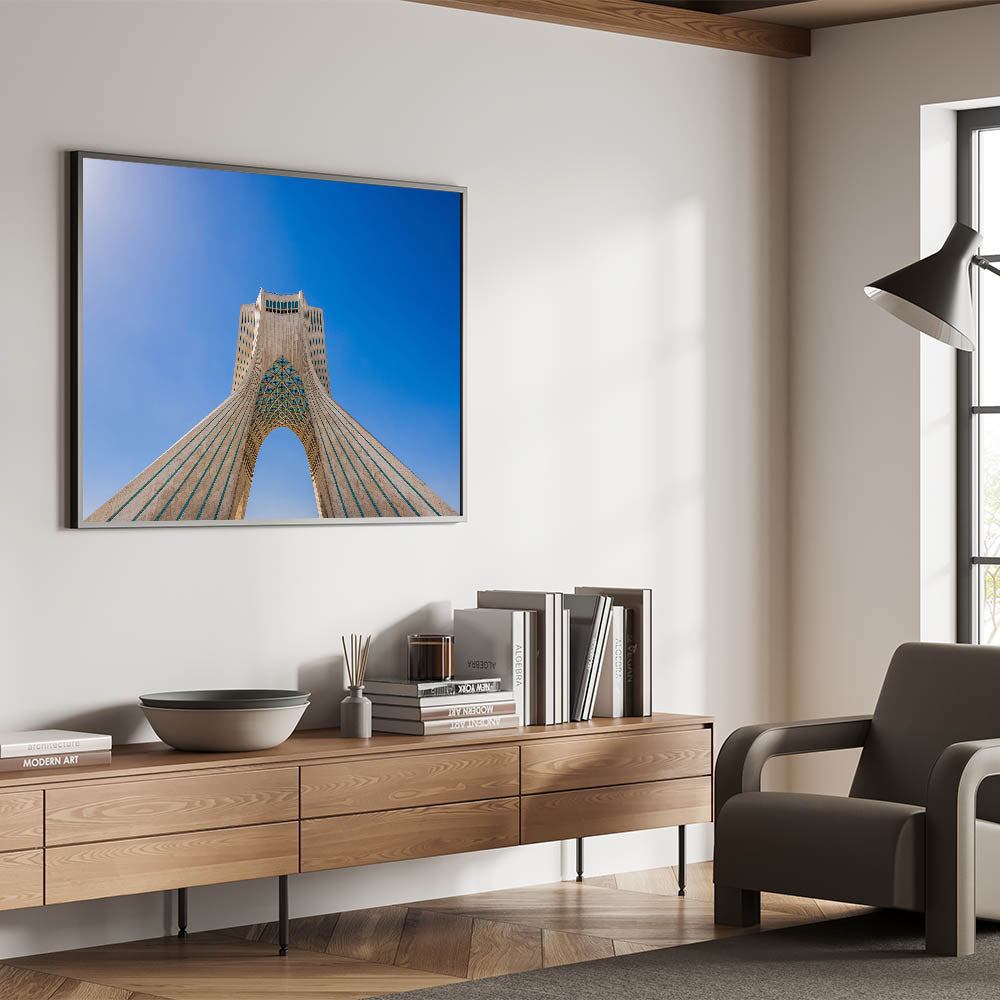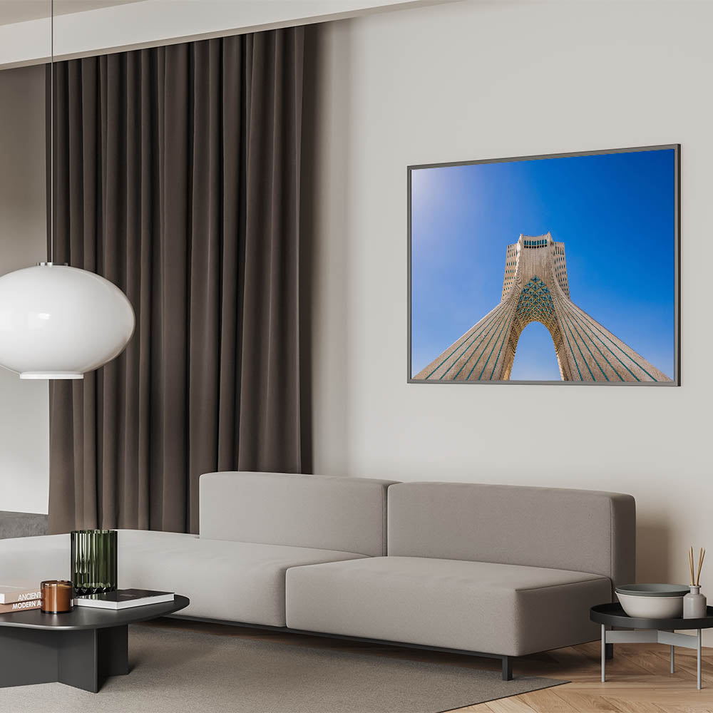 This stunning wall art features the iconic Azadi Tower, one of Tehran’s most recognizable landmarks, set against a clear blue sky. As a symbol of freedom and a tribute to Iran’s rich cultural heritage, this architectural marvel is a perfect representation of modern Persian design. The clean lines and bold structure make this handcrafted Persian artwork a striking piece for any contemporary space. Whether you're a lover of Iranian culture or architecture, this high-quality print will bring a touch of elegance and sophistication to your home decor.