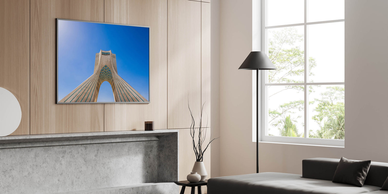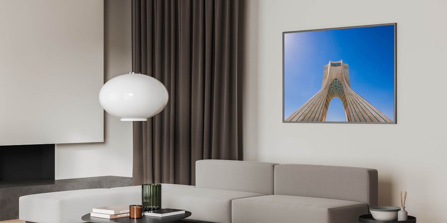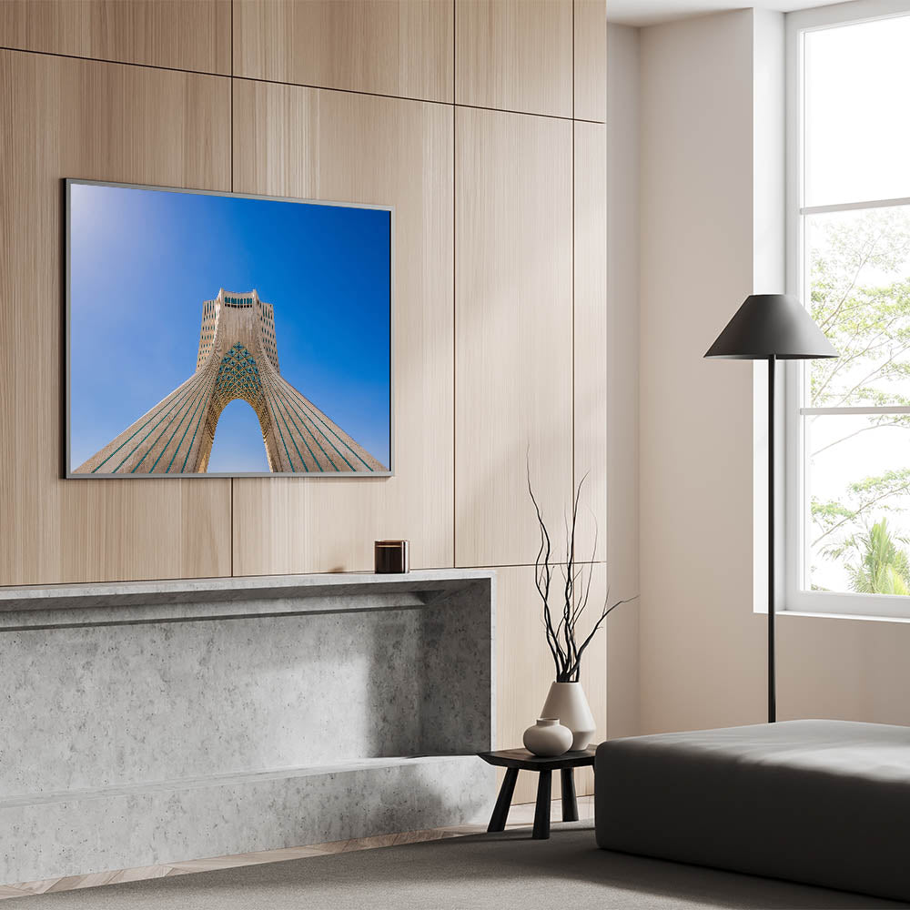 This stunning wall art features the iconic Azadi Tower, one of Tehran’s most recognizable landmarks, set against a clear blue sky. As a symbol of freedom and a tribute to Iran’s rich cultural heritage, this architectural marvel is a perfect representation of modern Persian design. The clean lines and bold structure make this handcrafted Persian artwork a striking piece for any contemporary space. Whether you're a lover of Iranian culture or architecture, this high-quality print will bring a touch of elegance and sophistication to your home decor.