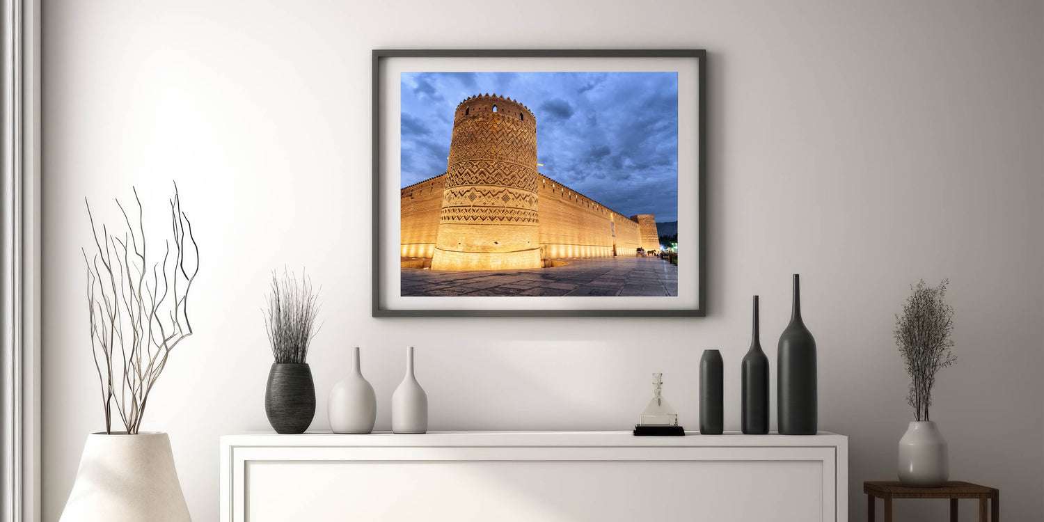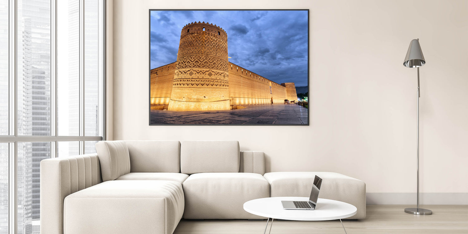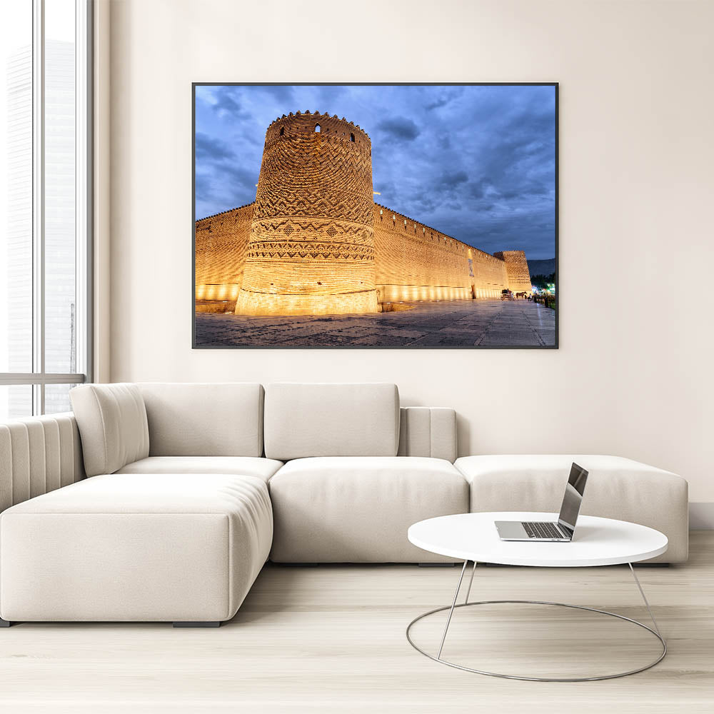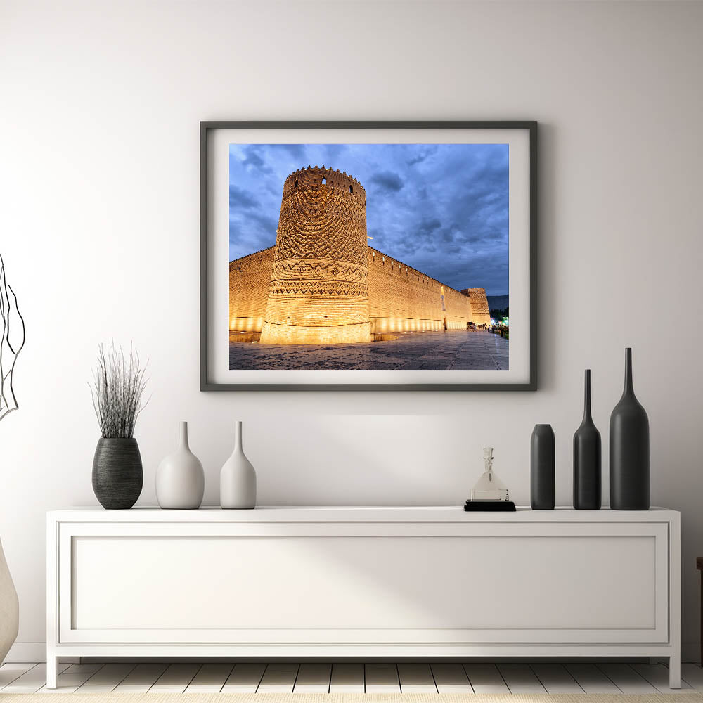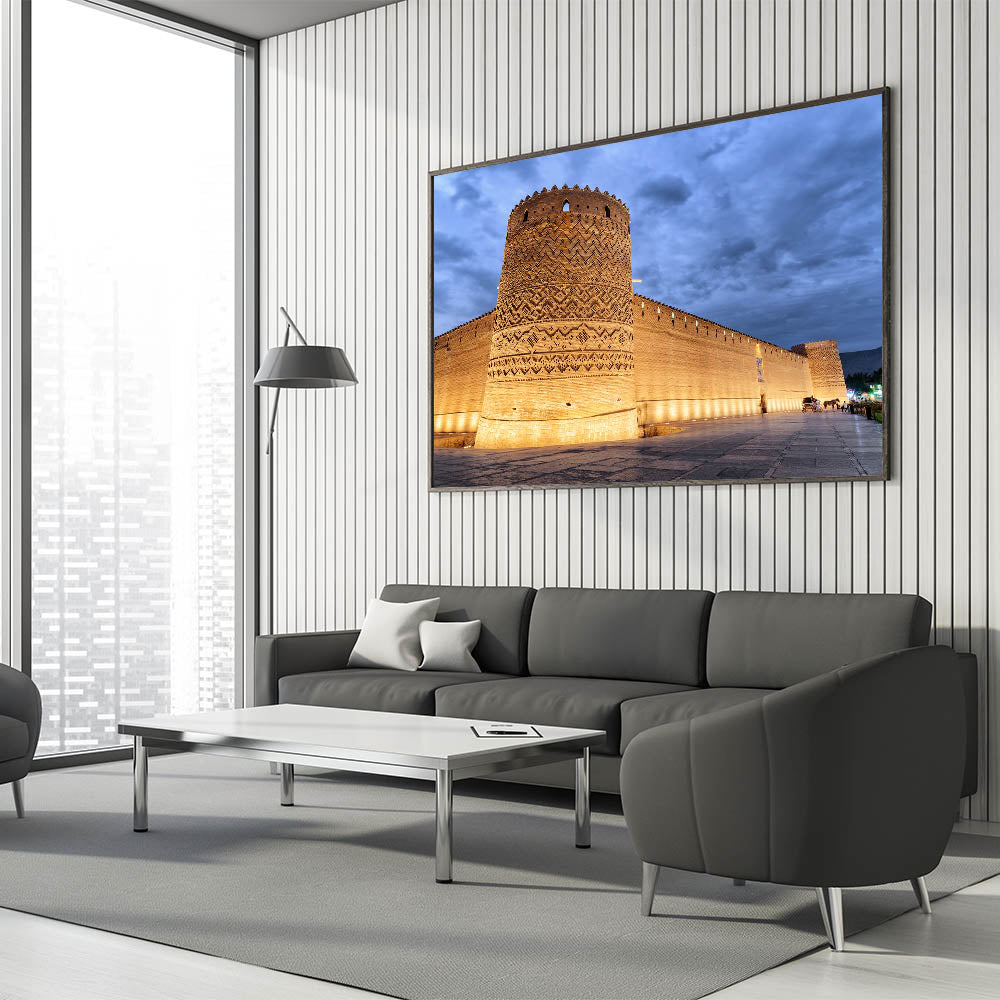 This captivating wall art captures the grandeur of a historical Persian fortress, beautifully illuminated at night. The intricate brickwork and imposing structure stand in stark contrast to the dramatic evening sky, highlighting the architectural brilliance of ancient Persia. The handcrafted Persian artwork brings a sense of history and elegance to any space, making it a perfect addition for those who appreciate cultural landmarks and timeless design. The warm lighting on the fortress walls evokes a serene yet powerful presence, ideal for creating an inspiring ambiance in your home.