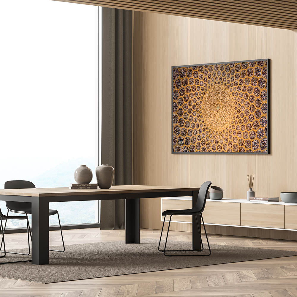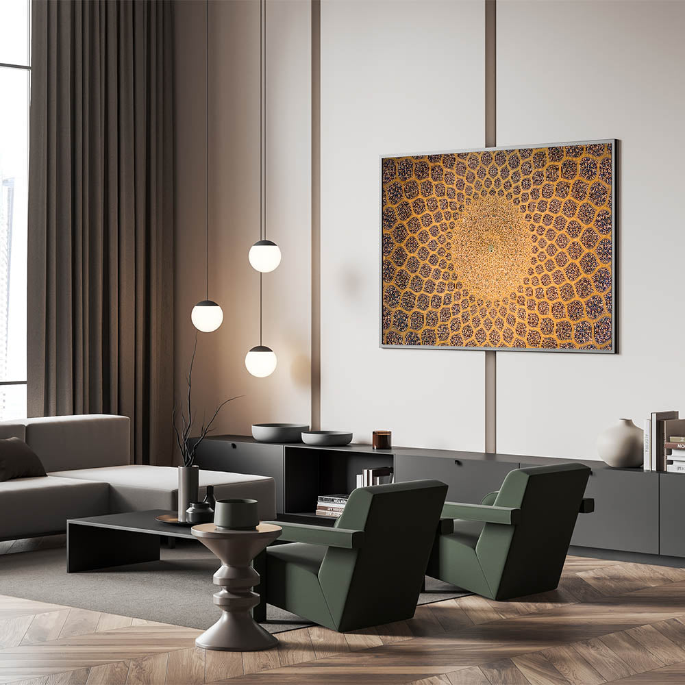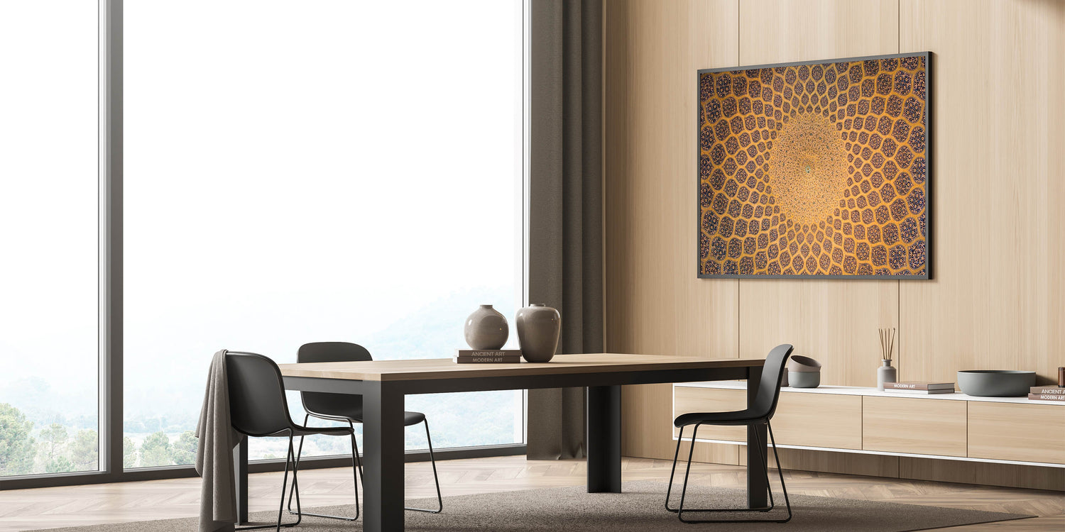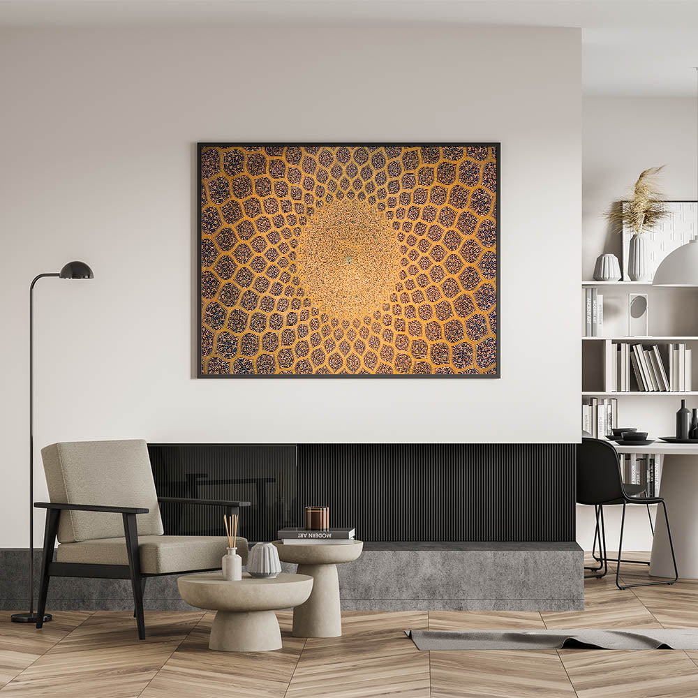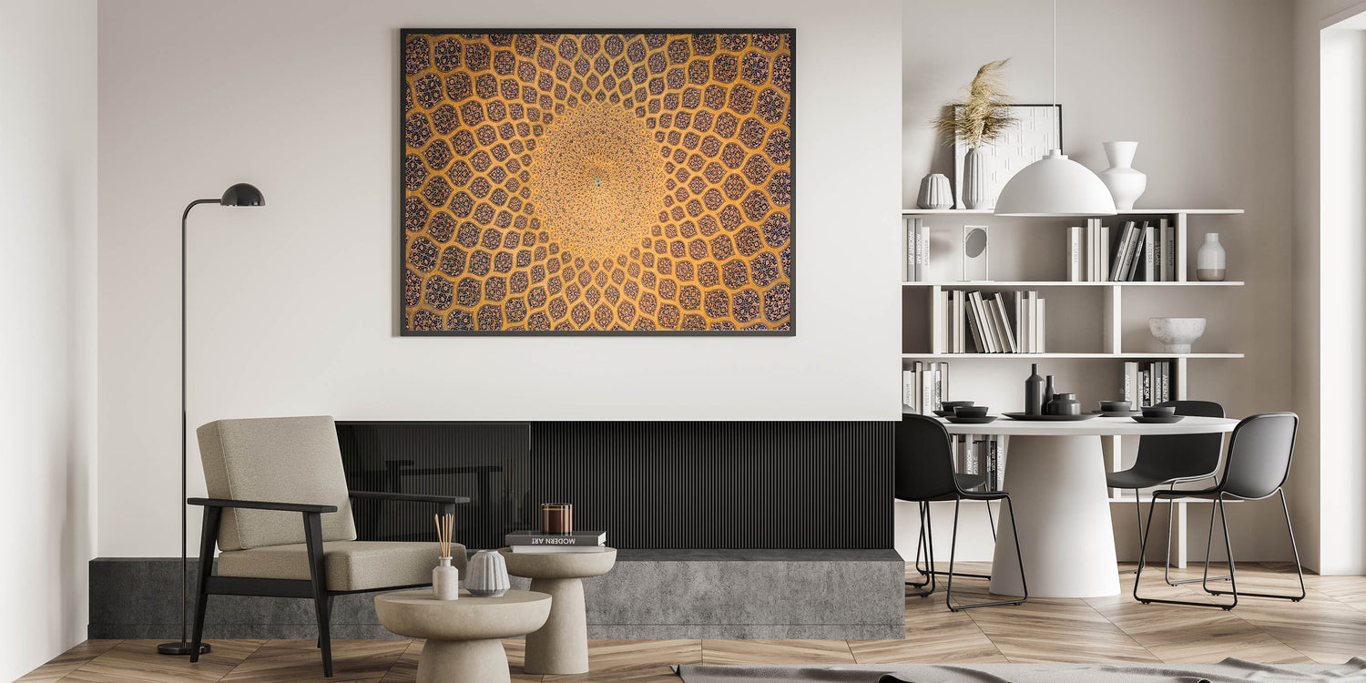 This exquisite Persian architectural dome design captures the beauty of Iranian artistry, featuring mesmerizing geometric patterns that symbolize the perfection of Persian craftsmanship. The artwork highlights the intricate tile work often seen in historical Iranian mosques and palaces, offering a glimpse into the timeless beauty of Persian architecture. This handcrafted Persian art brings a unique and authentic element to your home decor, allowing you to experience the rich cultural heritage of Iran. Whether you're a lover of Islamic art or Persian history, this wall decor is the perfect addition to your space.