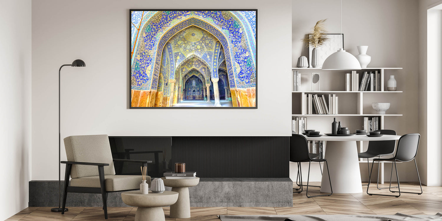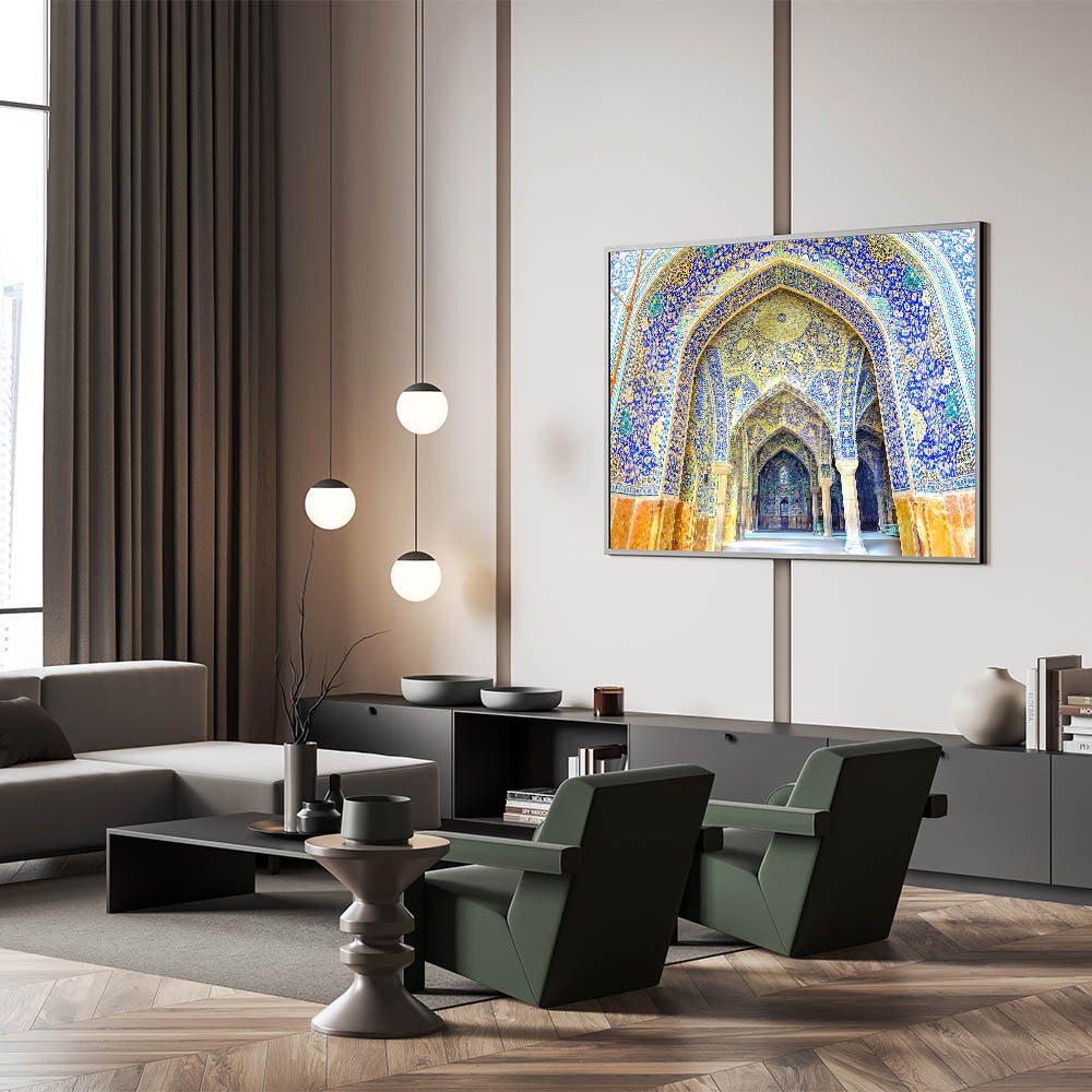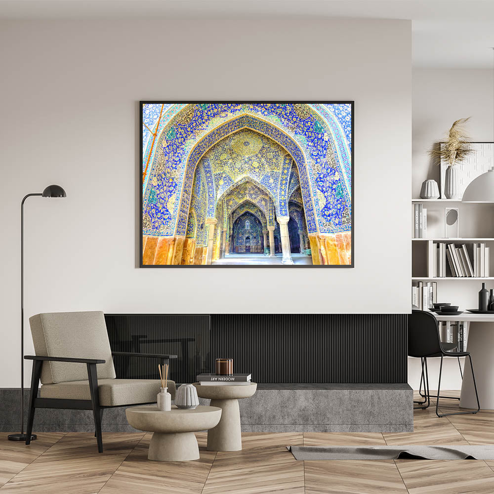 This stunning piece of Iranian wall art captures the breathtaking beauty of Persian mosque tile design, with intricate patterns and vibrant blue and gold accents. The rich detailing of the tiles reflects the grandeur and artistry of Iranian architecture, making this handcrafted Persian art an exquisite addition to any home decor. Perfect for those who admire traditional Persian craftsmanship, this artwork brings a unique and authentic touch to any room. Whether you're looking to add cultural depth to your living space or seeking a statement piece, this artwork is sure to impress.