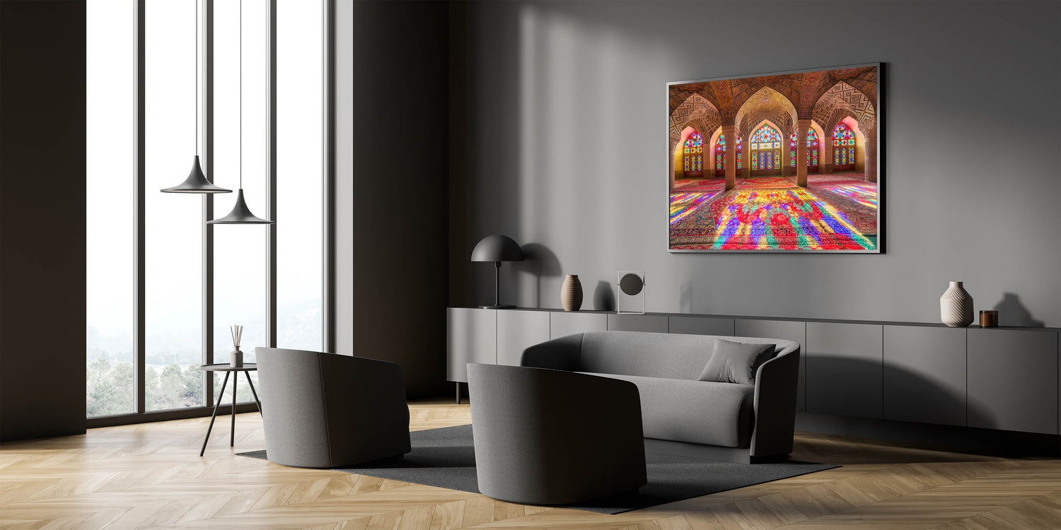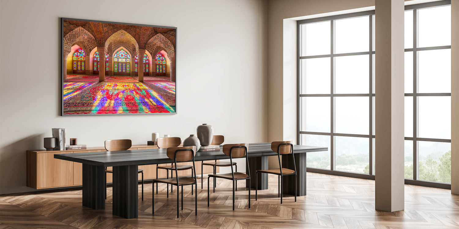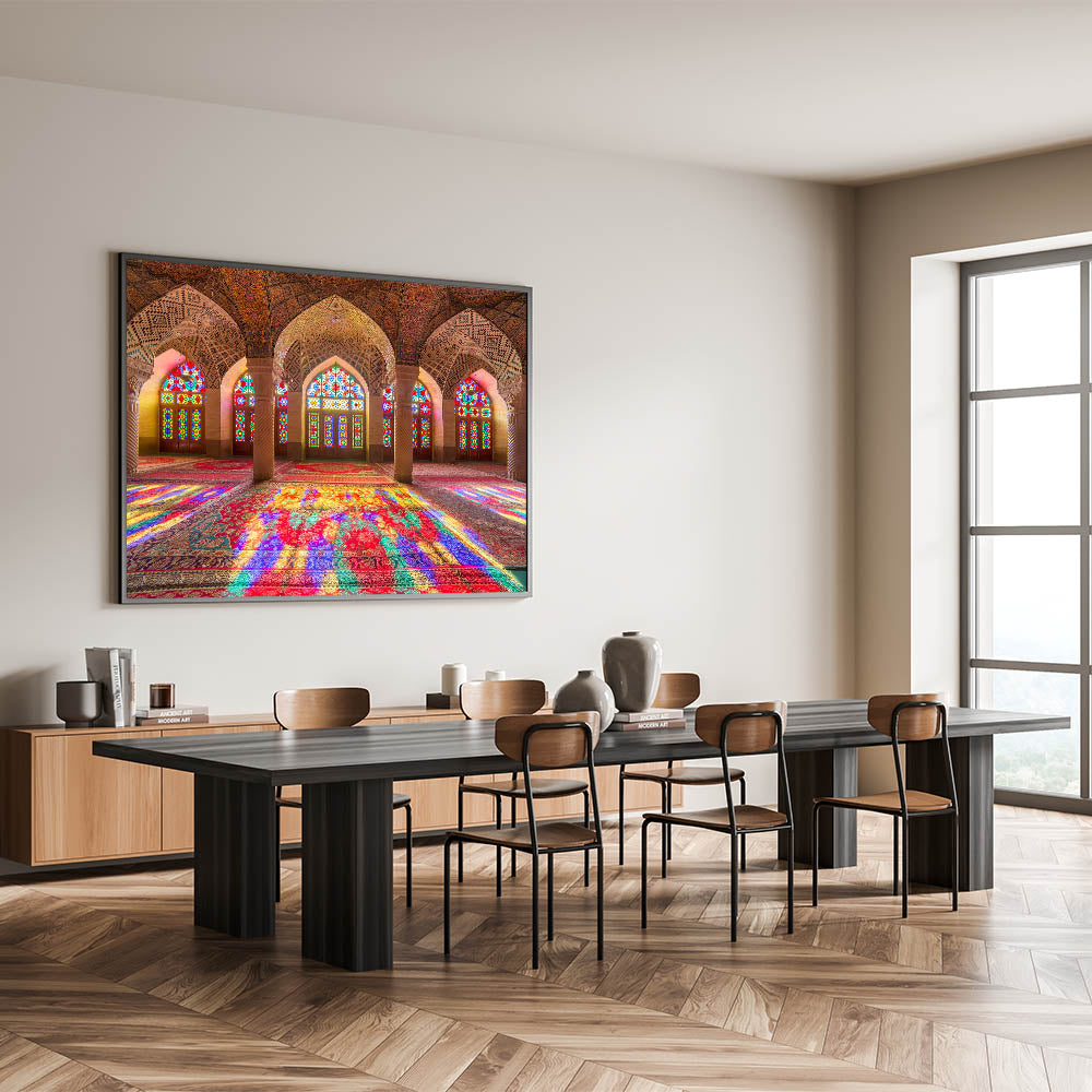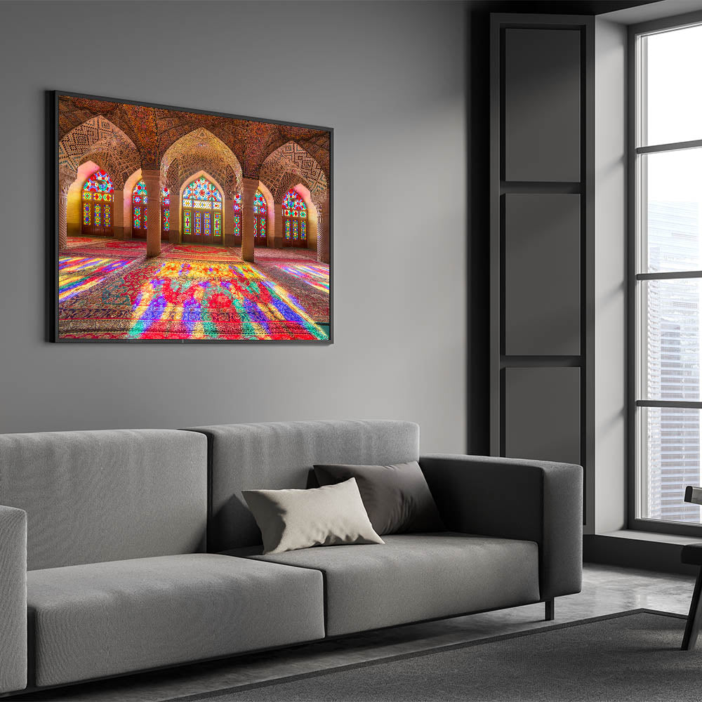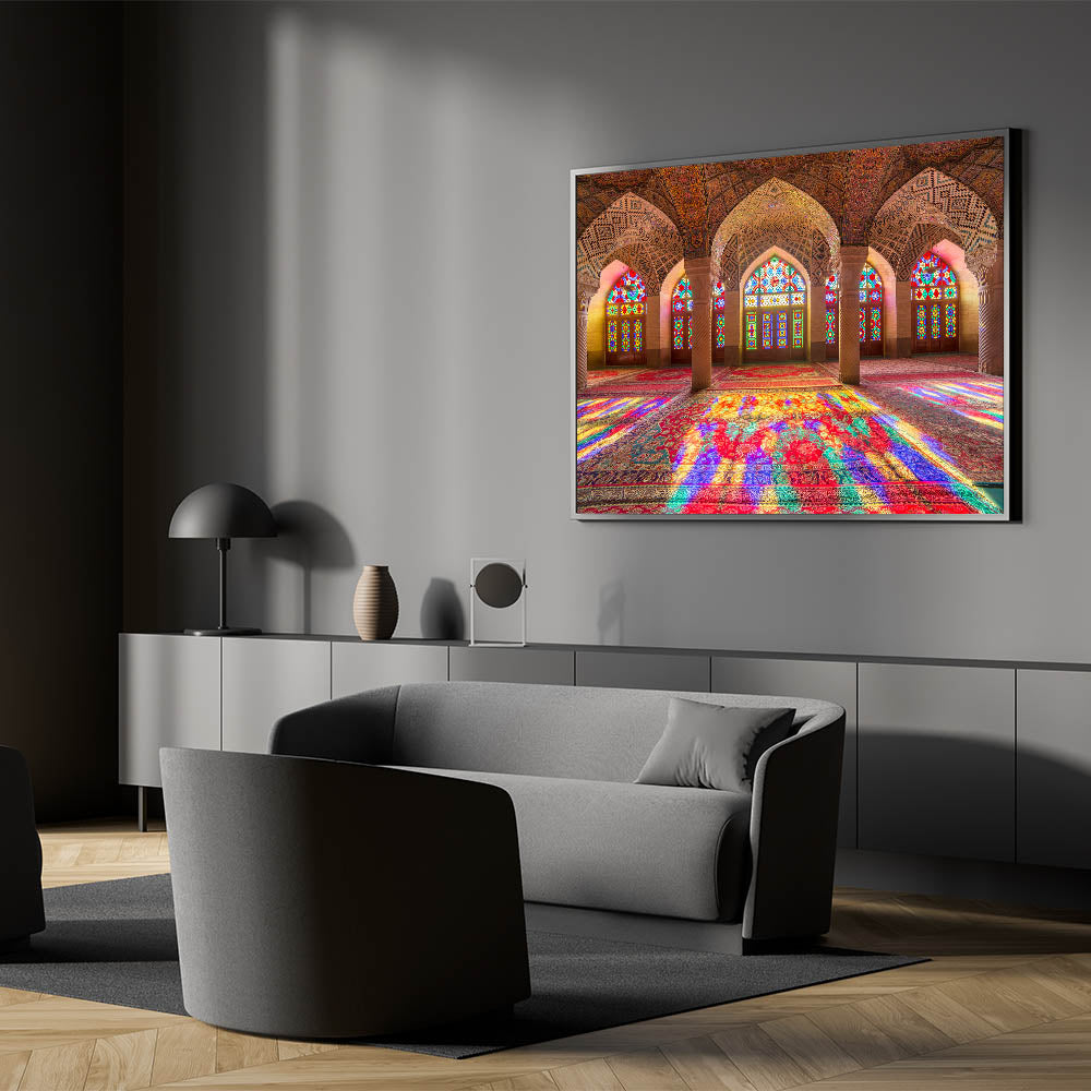 This breathtaking wall art captures the vibrant beauty of Persian stained glass and intricate mosque design, reflecting centuries of artistic tradition. The stunning interplay of light and color as it passes through the detailed stained glass windows creates a mesmerizing effect on the ornate carpets and tiles below. This handcrafted Persian artwork is perfect for those who seek to bring a burst of cultural richness and color into their living space. The delicate patterns and bold colors make this piece a unique and captivating addition to any home decor.